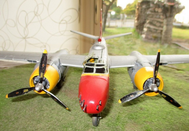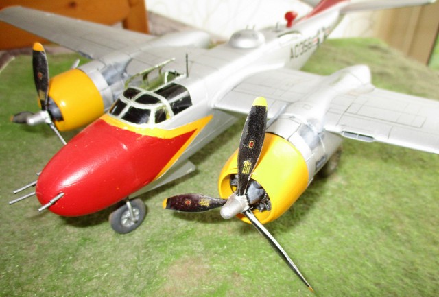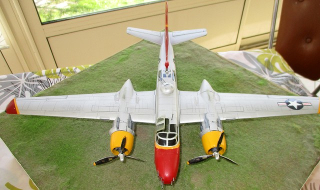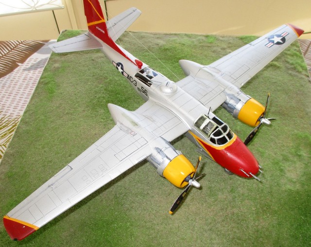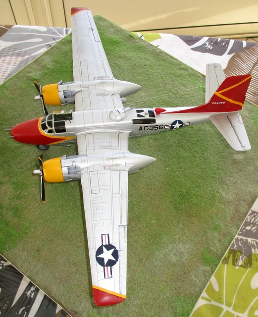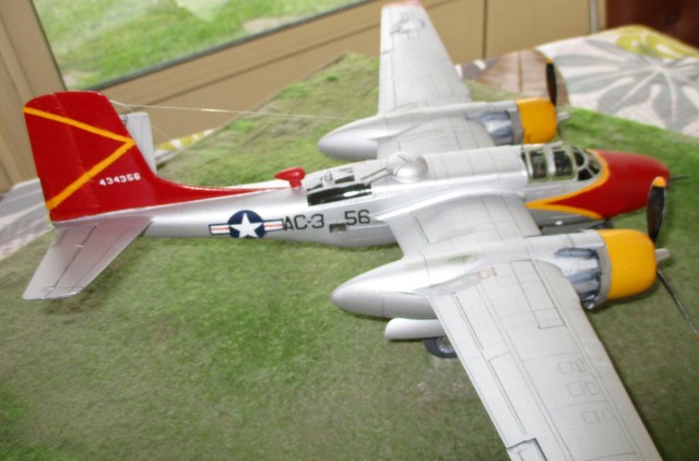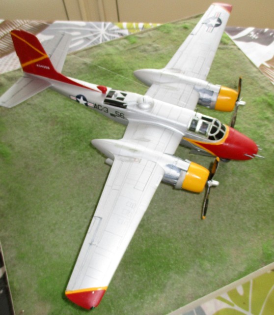 BONJOUR ;;LE ALL WEATHER FLYING CENTER a commencer en 1946, sur la base de CLINTON COUNTY AIRPORT; WILMINGTON dans l OHIO, au sud ouest de DAYTON , ville de naissance de ORVILLE WRIGHT, pionnier de l aviation .. Ce centre servait à étudier tous les phénomènes météo, présent aux USA .Les couleurs jaune ,rouge et aluminium étaient la décoration de ces avions météo . Le projet était l association du gouvernement US , du bureau météo US et de la NACA ( ancètre de la NASA ) . Ce service employait comme avions : P61 BLACK WIDOW; B17 ;LIBERATOR ;DAKOTA ; P47 ;;T6 ;;etc ……….; et l INVADER .. La base est le kit ICM référence 48282 . La décoration est faite à l aérographe; suivant le profil et photo sur SQUADRON SIGNAL n 134 ….