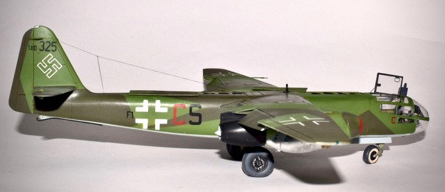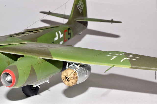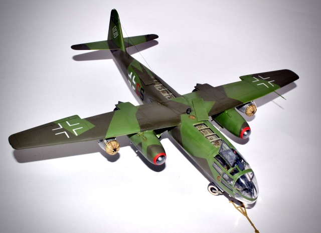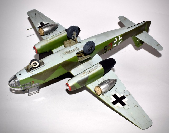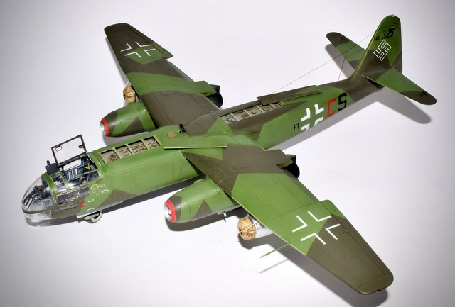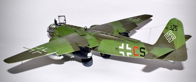 Premier Bombardier à réaction mis en service, l’Arado 234 fut un progrès technique égal au Me 262. Le KG 76 en fut équipé et devint la première unité au monde sur ce nouvel appareil. La maquette hasegawa au 48° est une excellente base et elle est ici améliorée par le set CMK, le cockpit Aires ainsi que les puits de train de la même marque. L’avion représenté est du 8/KG 76, qui effectua des bombardements sur Bruxelles, Anvers et le fameux pont de Remagen. le camouflage est en RLM 81/82/76, mais on trouvait aussi des avions avec les teintes 70/71.