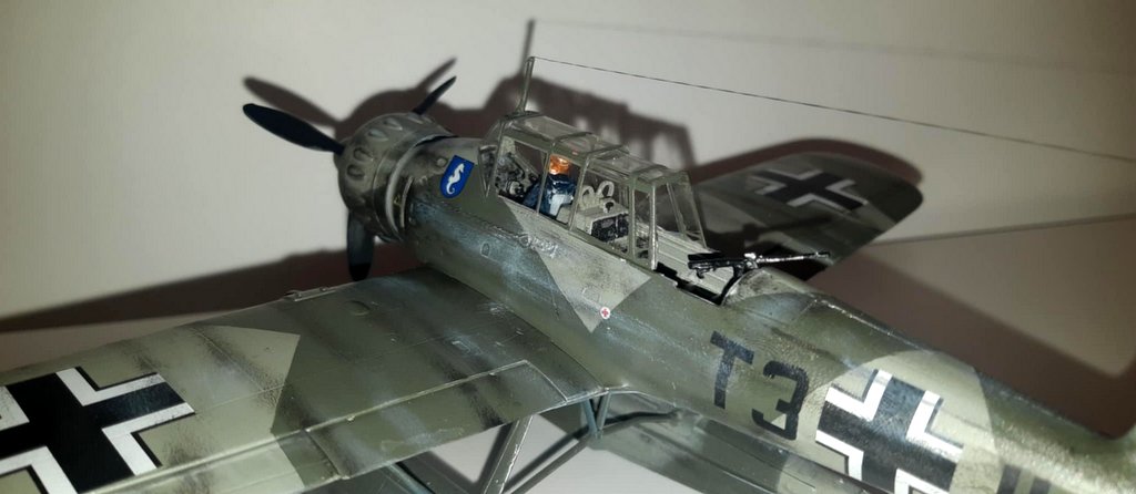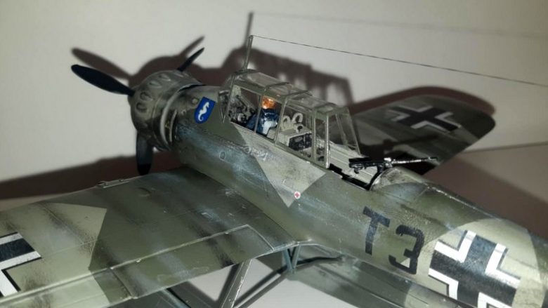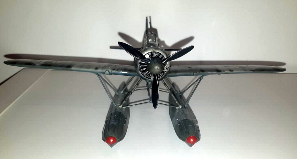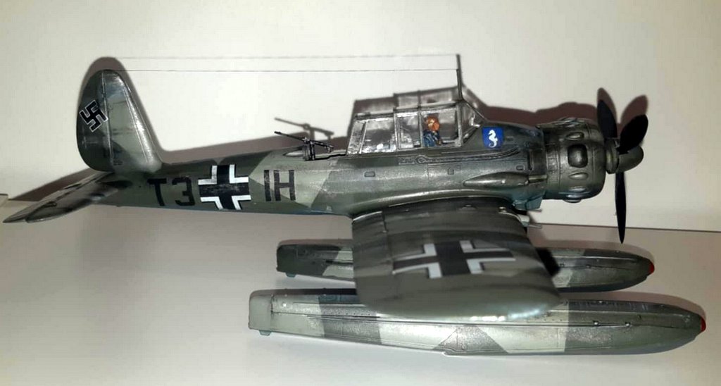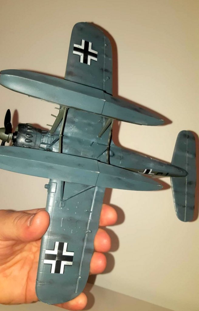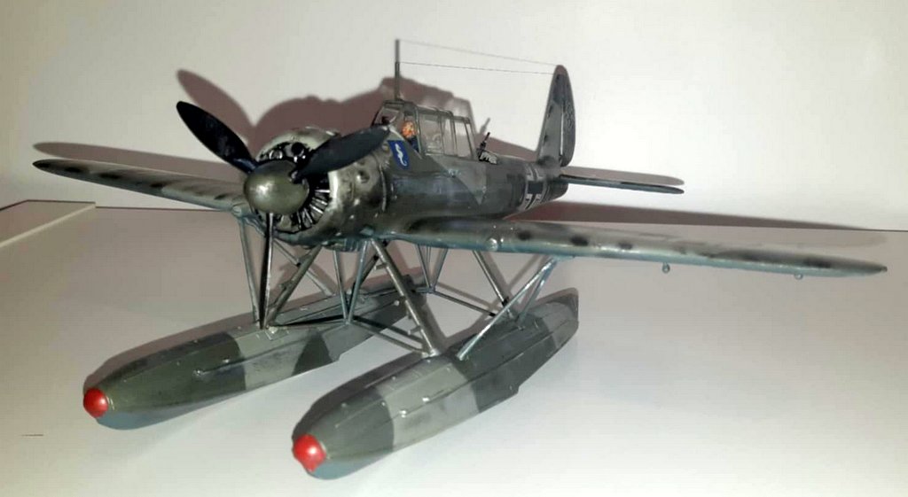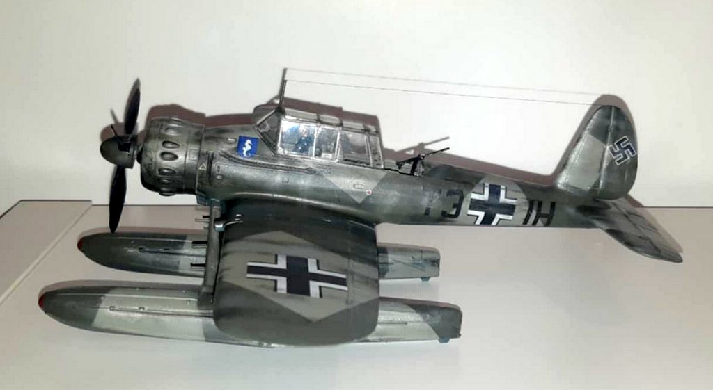 Ayant l’habitude de monter des hydravions ARADO au 1/350, je voulus monter à l’échelle au 1/48. Un modèle existe chez ITALERI (référence introuvable mais trouvée par hasard sur le site VINTED). Le montage est des plus classique, un peu de mastic au niveau des ailes, un léger ponçage et hop prêt à peindre. N’ayant pas de pilote fourni dans la boîte, Alpers me donna un pilote de sa boîte à rabiot (merci à lui). Mise en place des caches vitres, apprêtage en blanc puis peinture en vert (les teintes seront celles de l’hydravion du cuirassée BISMARCK), les teintes seront vert foncé (H423) et vert clair H70. Une fois sec, apprêtage en vernis brillant, place des decals (les swastikas non fournis dans la boîte, proviennent de ma boîte à rabiot) puis 2 couches de vernis mat.Le vieillissement sera fait avec des peintures à l’huile (noir de mars et blanc). Le résultat final me convient parfaitement et ce fut un montage bien sympathique. Having the habit of mounting ARADO seaplanes at 1/350, I wanted to climb the ladder at 1/48. A model exists at ITALERI (reference not found but found by chance on the VINTED site). The assembly is the most classic, a little bit of mastic at the level of the wings, a slight sanding and hop ready to paint. Not having a driver provided in the box, Alpers gave me a driver from his folding box (thank you to him). Installation of the window covers, priming in white then painting in green (the shades will be those of the floatplane of the BISMARCK battleship), the hues will be dark green (H423) and light green H70. Once dry, glossy varnish priming, place the decals (the swastikas not provided in the box come from my planing box) then 2 layers of matte varnish. The aging will be done with oil paints (March black and white). The final result suits me perfectly and it was a very nice edit.
