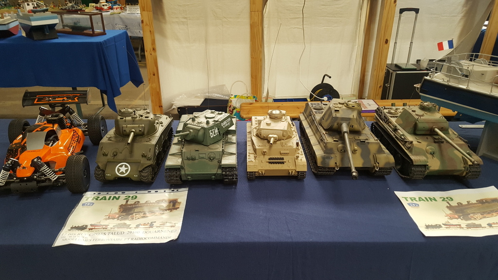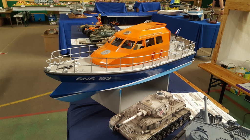 Un peu d’occupation au stand à peindre quelques containers par Pierrot pour son futur «Colombo Express». Visite du salon et discussions maquettistes pour Claude et Guy. Pépères jusqu’à midi! Qui dit midi, dit aussi repas. Repas du dimanche midi qui n’avait rien à envier à celui du samedi. Nos amis organisateurs nous avaient d’ailleurs prévenus que l’accueil serait des plus chaleureux. Confirmation donc de leurs dires. Petite sieste digestive au stand pour les trois Campistes. Dimanche après midi ponctuée de différentes démos, ( camions, chars..). A signaler un stand de bateaux où il y avait que du HELLER, (environ 70 bateaux entre grands et petits), très belle collection. Météo encore plus qu’estivale! Un peu plus de visiteurs mais en dessous de ce que méritait un tel salon.