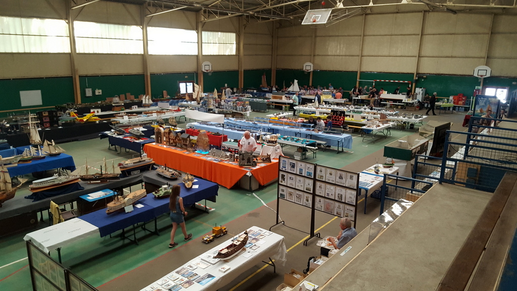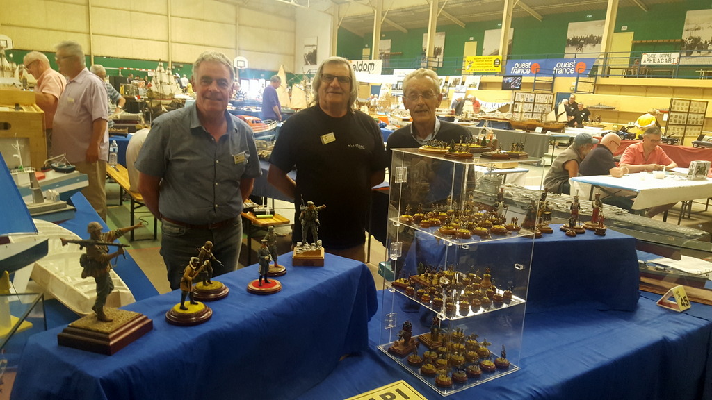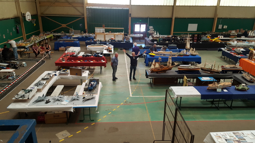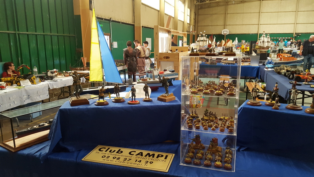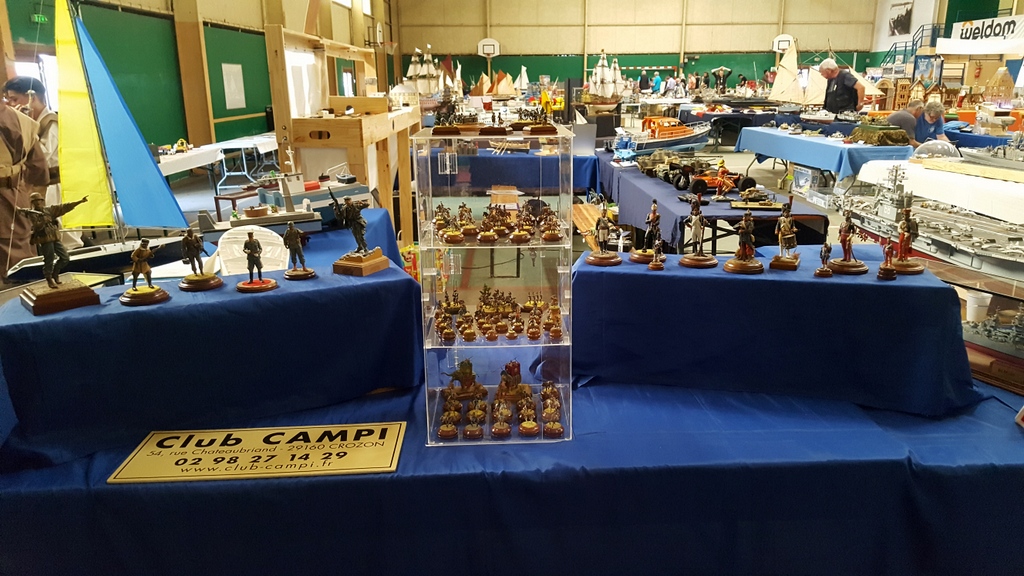 Changement radical de Cap pour le Campi. Après St Martin des Champs, direction le sud Finistère, plus précisément à Audierne. Salon organisé par le club Sud et Ouest de PLOUHINEC. Rendez vous des Campistes à telle heure à l’expo. Arrivée à l’heure prévue! Un petit bonjour à nos amis organisateurs et repérage du stand. Réservation prévue par Campi: 5 mètres. Et là petit malaise quand même, une seule table de 2.20 m. Juste de quoi présenter le porte-avions de l’ami Claude. Et Pierrot d’expliquer qu’il lui fallait aussi un peu de métrage de table. Affaire vite réglée par la mise en place de deux tables supplémentaires. 2,40 m en plus de quoi présenter bateaux sous vitrine et figurines. Club Campi bien installé pour les deux jours du salon.