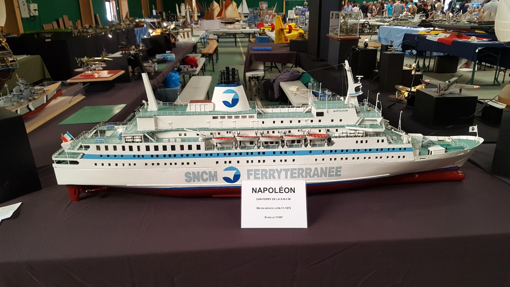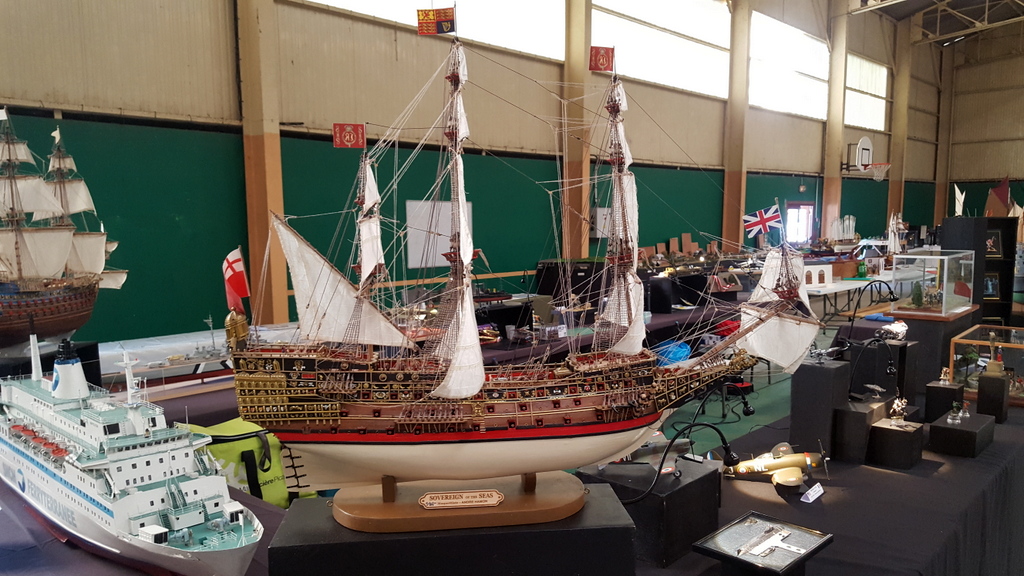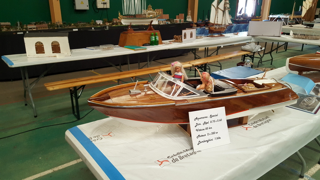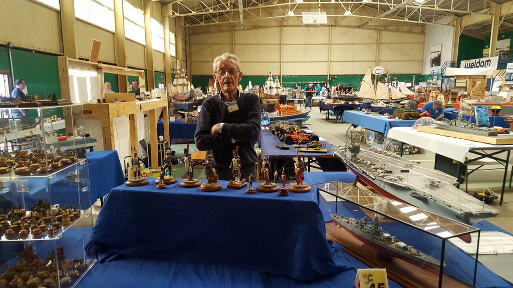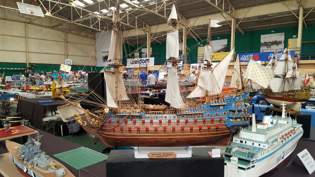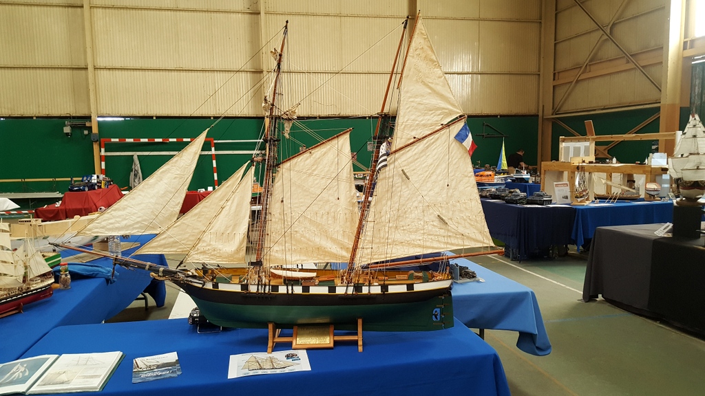 Changement radical de Cap pour le Campi. Après St Martin des Champs, direction le sud Finistère, plus précisément à Audierne. Salon organisé par le club Sud et Ouest de PLOUHINEC. Rendez vous des Campistes à telle heure à l’expo. Arrivée à l’heure prévue! Un petit bonjour à nos amis organisateurs et repérage du stand. Réservation prévue par Campi: 5 mètres. Et là petit malaise quand même, une seule table de 2.20 m. Juste de quoi présenter le porte-avions de l’ami Claude. Et Pierrot d’expliquer qu’il lui fallait aussi un peu de métrage de table. Affaire vite réglée par la mise en place de deux tables supplémentaires. 2,40 m en plus de quoi présenter bateaux sous vitrine et figurines. Club Campi bien installé pour les deux jours du salon.