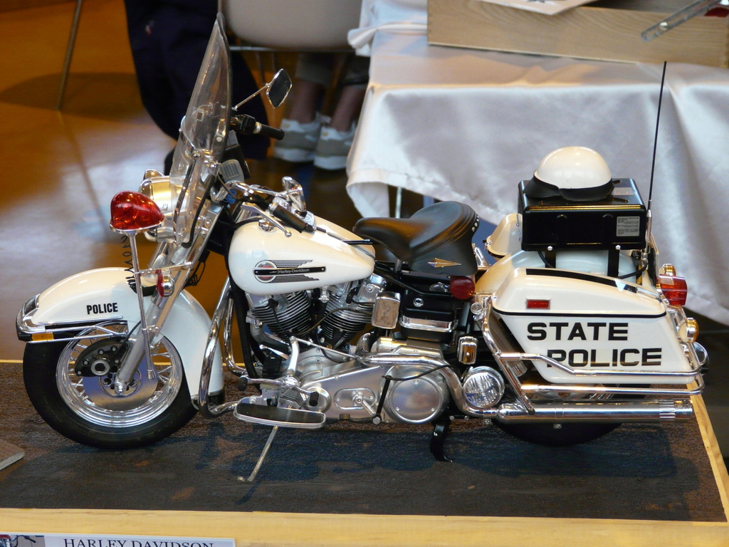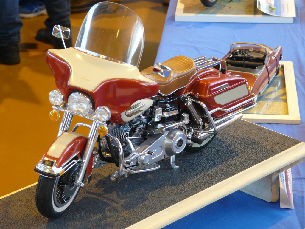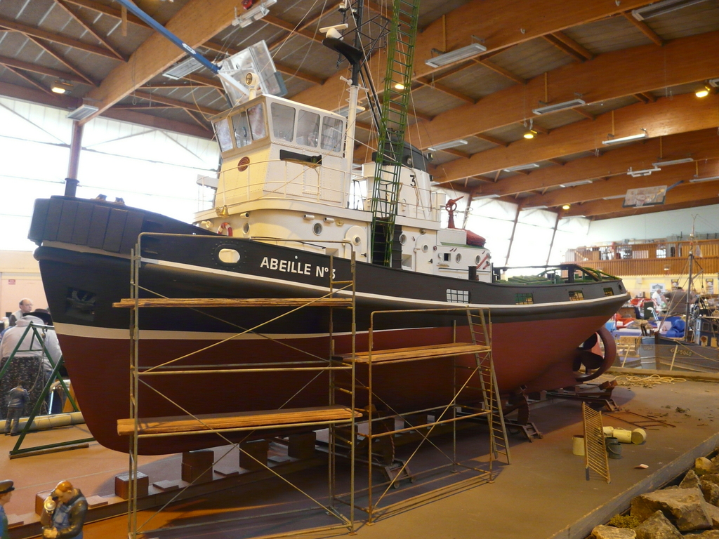 Un peu plus loin, toujours de la moto bois, mais à plus petite échelle. L’une d’entre elle attirait plus particulièrement le regard : toutes les pièces composant le moteur était en matière transparente. Vous aperceviez tous les rouages du moteur (bielles, piston, cardan etc…) Il suffisait au maquettiste d’introduire une petite clef à l’avant du moteur, de la faire tourner, et tout le mécanisme se mettait en marche jusqu’à entraînement de la roue arrière. On dit qu’il n’y a qu’en Bretagne qu’on trouve des stands bateaux. Juste devant le notre, un superbe stand ou trônaient de magnifiques navires ( statiques et radio commandés dont une superbe vedette rapide allemande équipée pour la navigation).