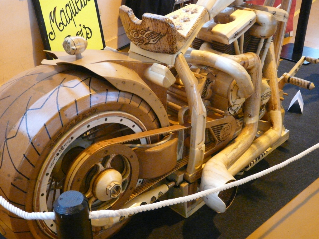 Samedi matin, petite pause au stand et petit déjeuner au bar du salon ( café croissant). Et puis visite. Une réalisation que vous ne pouviez rater : une moto en bois échelle 1. Toutes les pièces étaient réalisées manuellement avec différentes espèces de bois. Une finition plus que soignée pour un résultat des plus ahurissant.