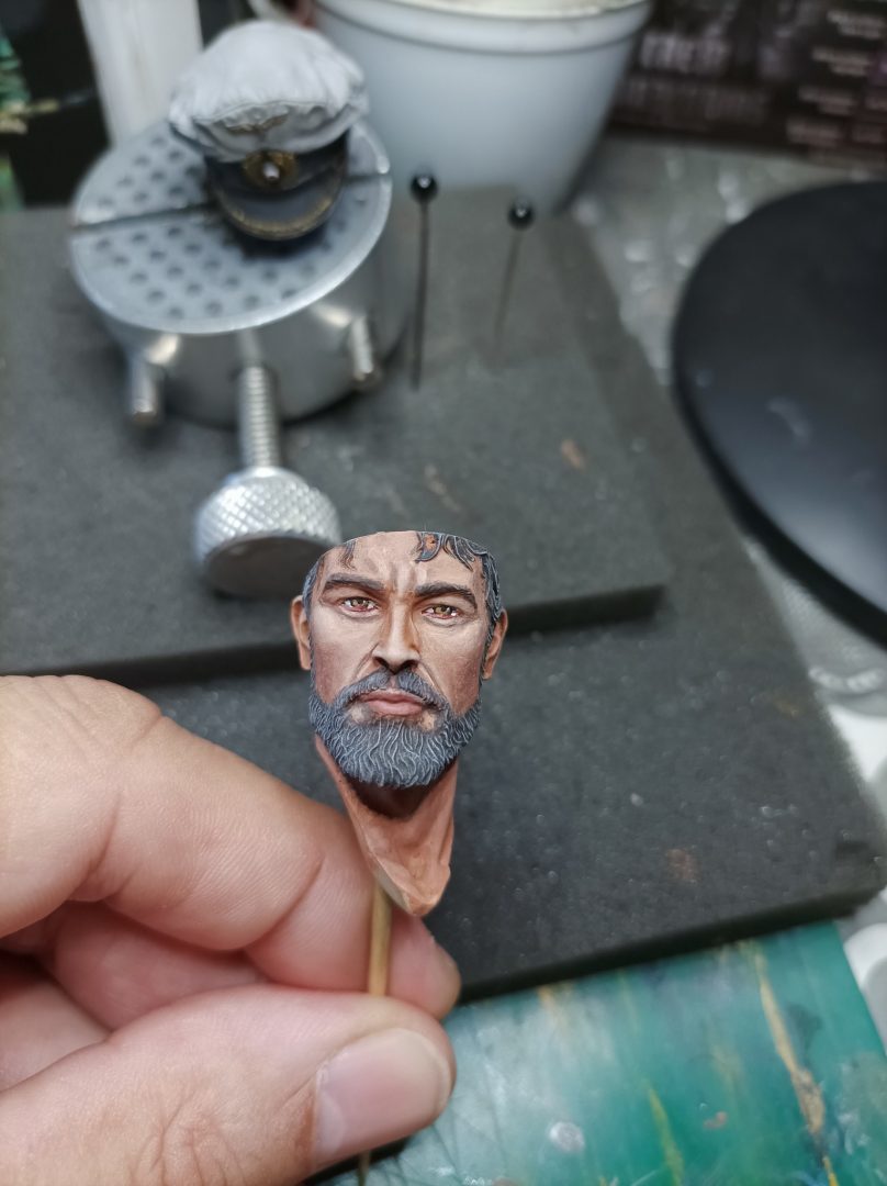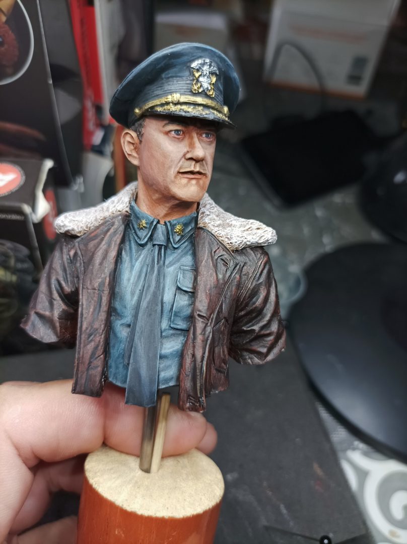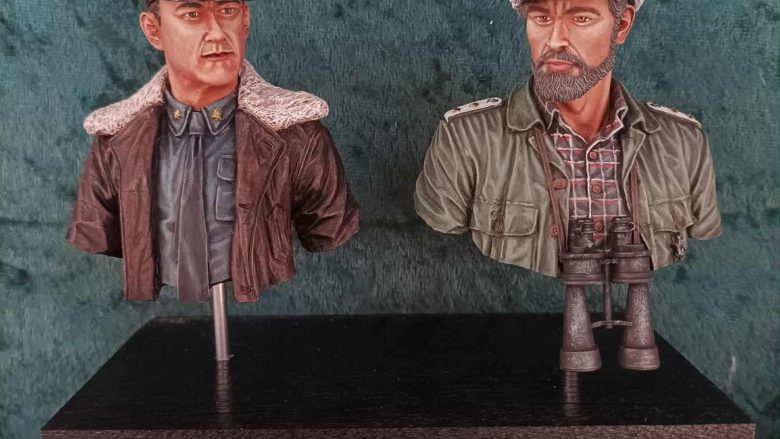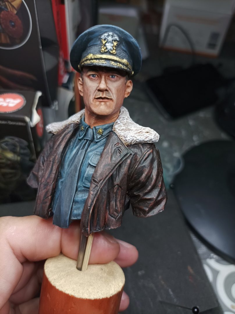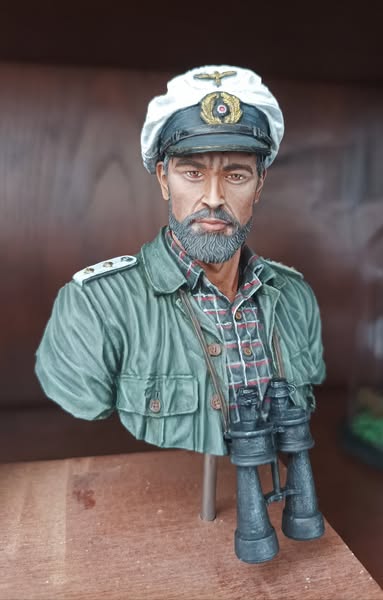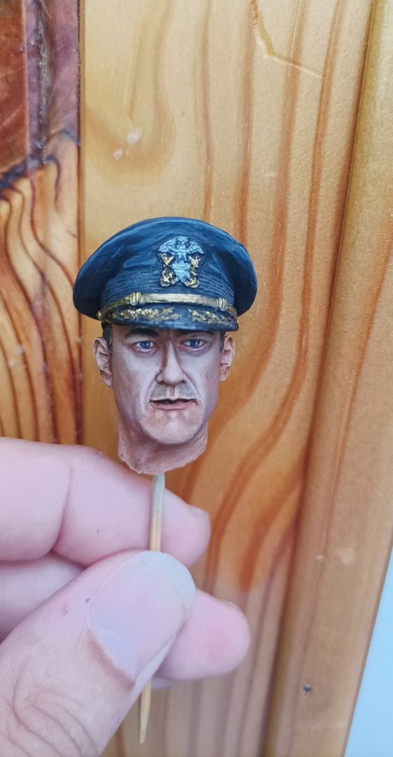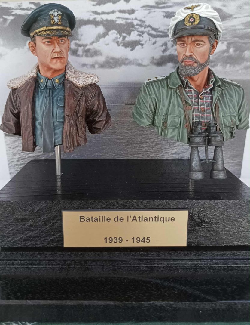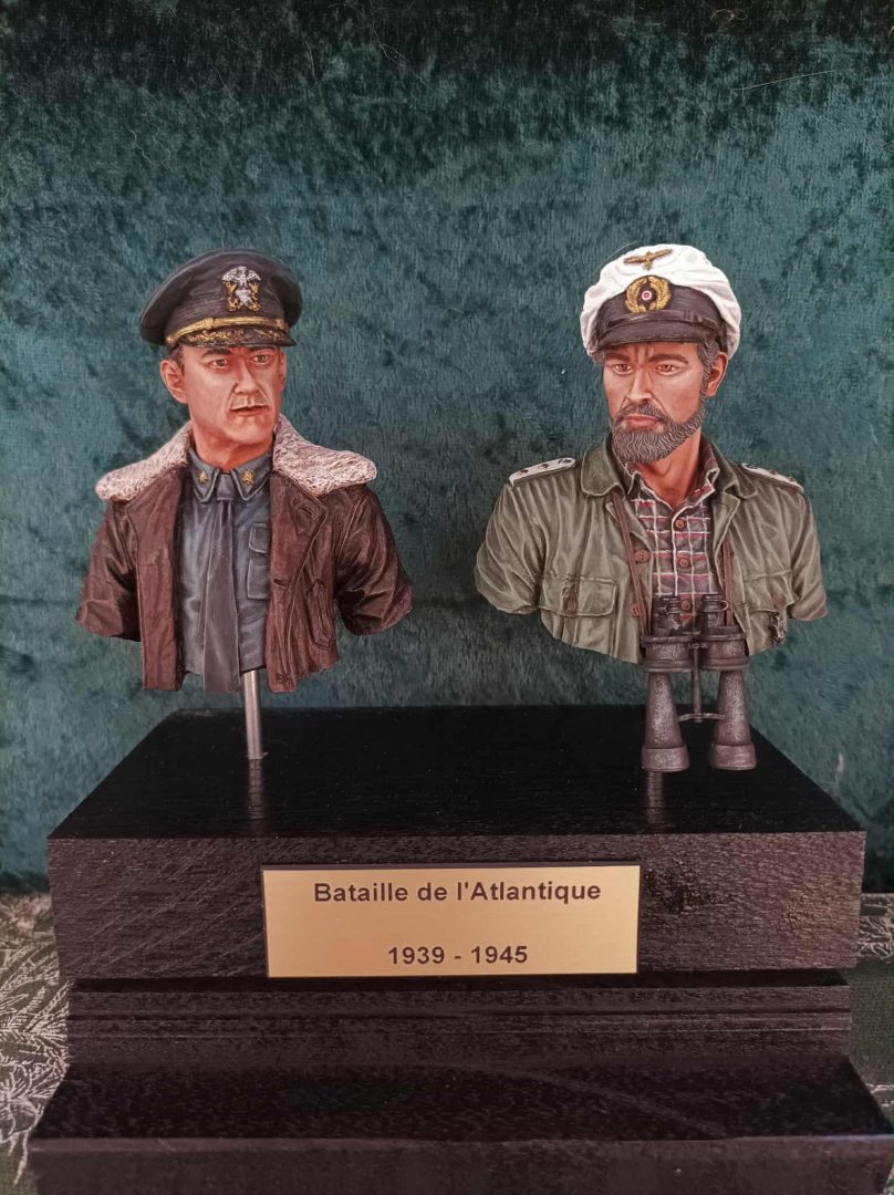 En ce mois de juin 2025, lors d’une journée pluvieuse, installé à ma table, je tombe sur un film de guerre à la télévision : USS Greyhound » La Bataille de l’Atlantique « . Ce film centré sur la vie du commandant de ce bâtiment, joué par Tom Hanks, raconte l’escorte par un destroyer de l’US Navy, code radio Greyhound, d’un convoi allié traversant l’Atlantique nord, chassé par des U-Boot allemands. Coïncidence, le soir même, naviguant sur internet, je tombe sur le buste de ce fameux commandant au 1/10 édité par la marque NUTS PLANETE. Poursuivant mes investigations, je trouve également un buste de sous marinier allemand de la même marque. L’idée est trouvée : mettre ces deux bustes sur un socle commun. La mise en peinture à l’acrylique commence toujours pour moi par les visages. Le sous marinier sera terminé le premier, pas de problème particulier, la gravure est belle. In this month of June 2025, on a rainy day, sitting at my table, I come across a war movie on television: USS Greyhound ‘The Battle of the Atlantic’. This film focuses on the life of the commander of this building, played by Tom Hanks, and tells about the escort by a destroyer from the US Navy, radio code Greyhound, of an allied convoy crossing the North Atlantic, chased by German U-boats. Coincidence, the same evening, browsing on the internet, I come across the bust of this famous commander at 1/10 edited by the brand NUTS PLANETE. Continuing my investigations, I also find a bust of a German submariner of the same brand. The idea is found: put these two busts on a common base. Acrylic painting always begins for me with faces. The submariner will be finished first, no particular problem, the engraving is beautiful.