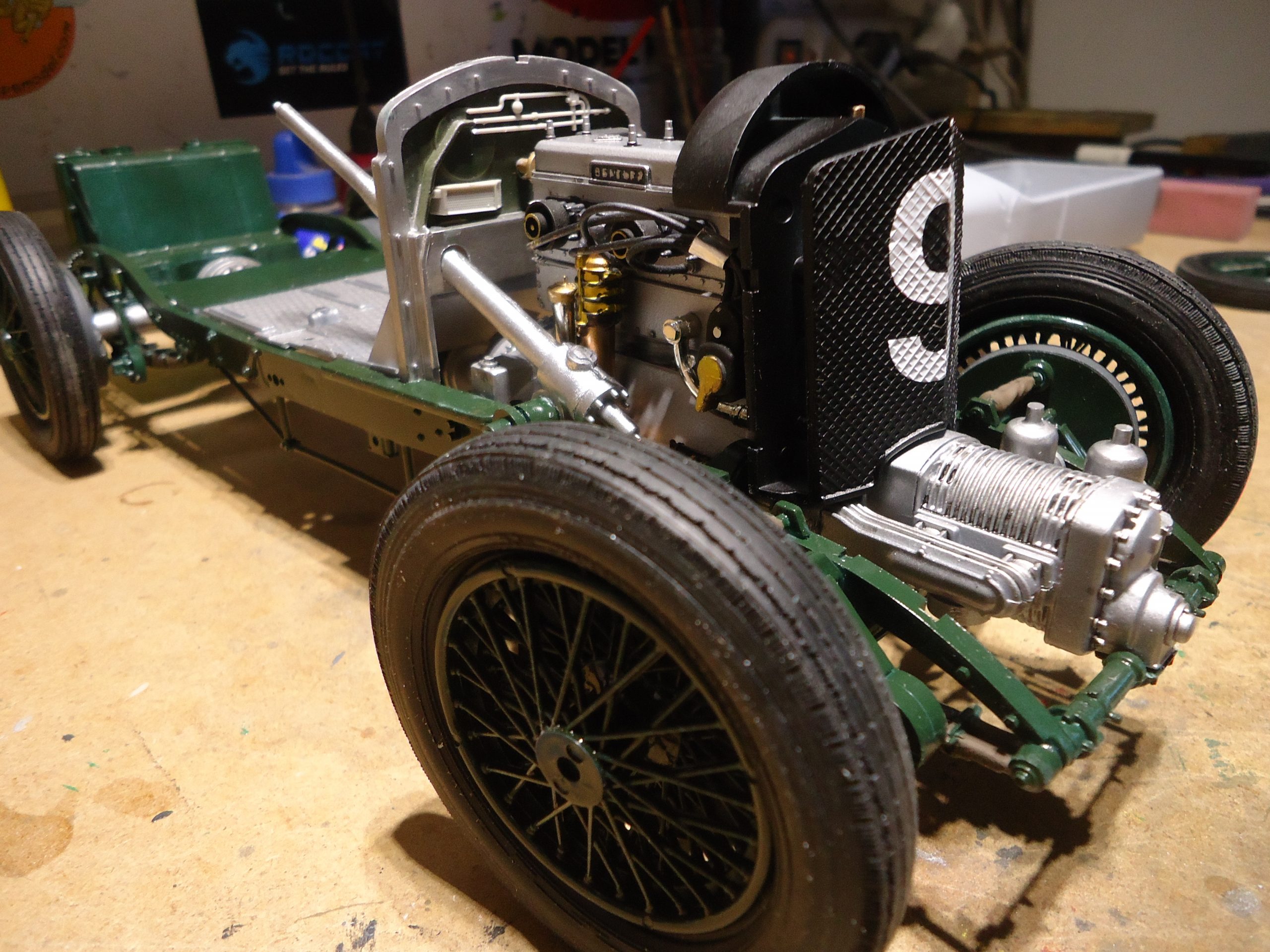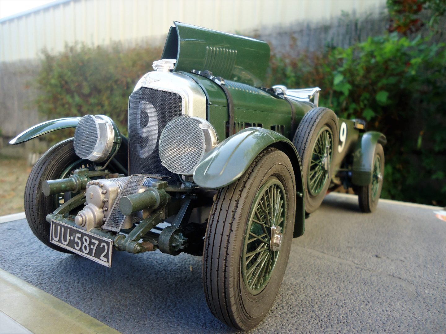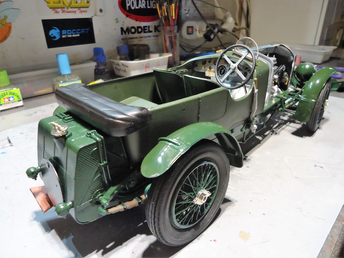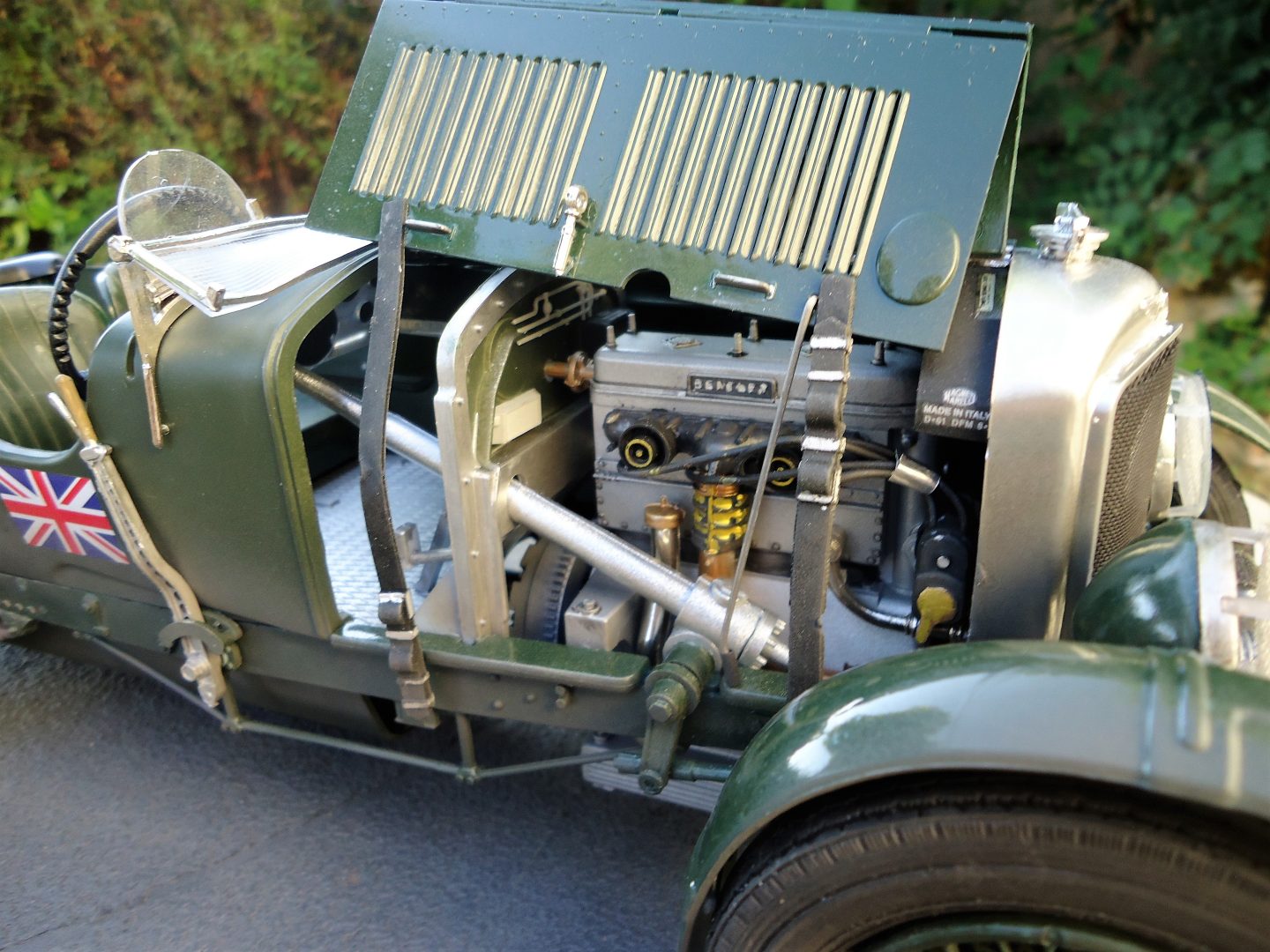 Elle nous a tous fait rêver » dans les vitrines de magasins spécialisés… Je parle de 1971 ! Pensez, une maquette au 1/12ème proposée par Airfix, qui était à l’époque l’un des meilleurs fabricants. Donc… au boulot pour une version modernisée car elle a été rééditée 8 fois en tout jusqu’en 2020. La maquette se compose d’environ 300 pièces. Certes, le kit a bien vieilli et ne souffre pas trop du poids des ans mais il y a encore un gros travail d ‘ébavurage et de préparation, dû à son âge, à une époque où l’on ne connaissait pas encore les « moules à tiroirs ». L’ensemble demeure bon. Le montage est « from the box » avec juste le rajout des grilles métal pour la calandre et les phares. Peinture en deux tons de vert avec la gamme Humbrol « d’époque » posée à l’aérographe. La carrosserie de la vraie étant composée de métal recouvert de cuir par endroits. Une légère couche de vernis mat, sur les parties concernées, a été posée. Toutes les parties du moteur et de la transmission ont quant à elles reçu une touche d ‘Alclad. She made us all dream » in the windows of specialized stores… I’m talking about 1971! Think, a 1/12th scale model proposed by Airfix, which was at the time one of the best manufacturers. So… let’s work on a modernized version because it has been republished 8 times in all until 2020. The model consists of about 300 pieces. Admittedly, the kit has aged well and does not suffer too much from the weight of the years, but there is still a lot of deburring and preparation work, due to its age, at a time when we did not yet know the « drawer moulds. » The whole remains good. The assembly is « from the box. » with just the addition of metal grilles for the grille and headlights. Painted in two shades of green with the « vintage » Humbrol range, airbrushed. The body of the real one is made of metal covered with leather in places. A slight layer of matte varnish, on the relevant parts, was installed. As for all the parts of the engine and transmission, they received an Alclad key.