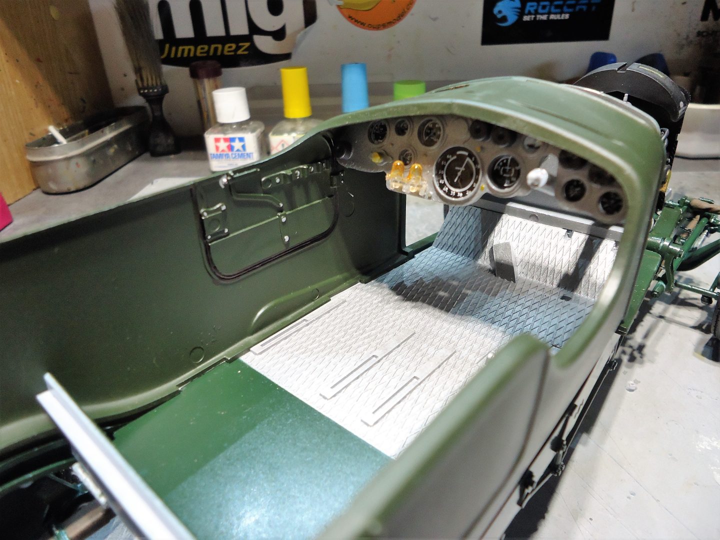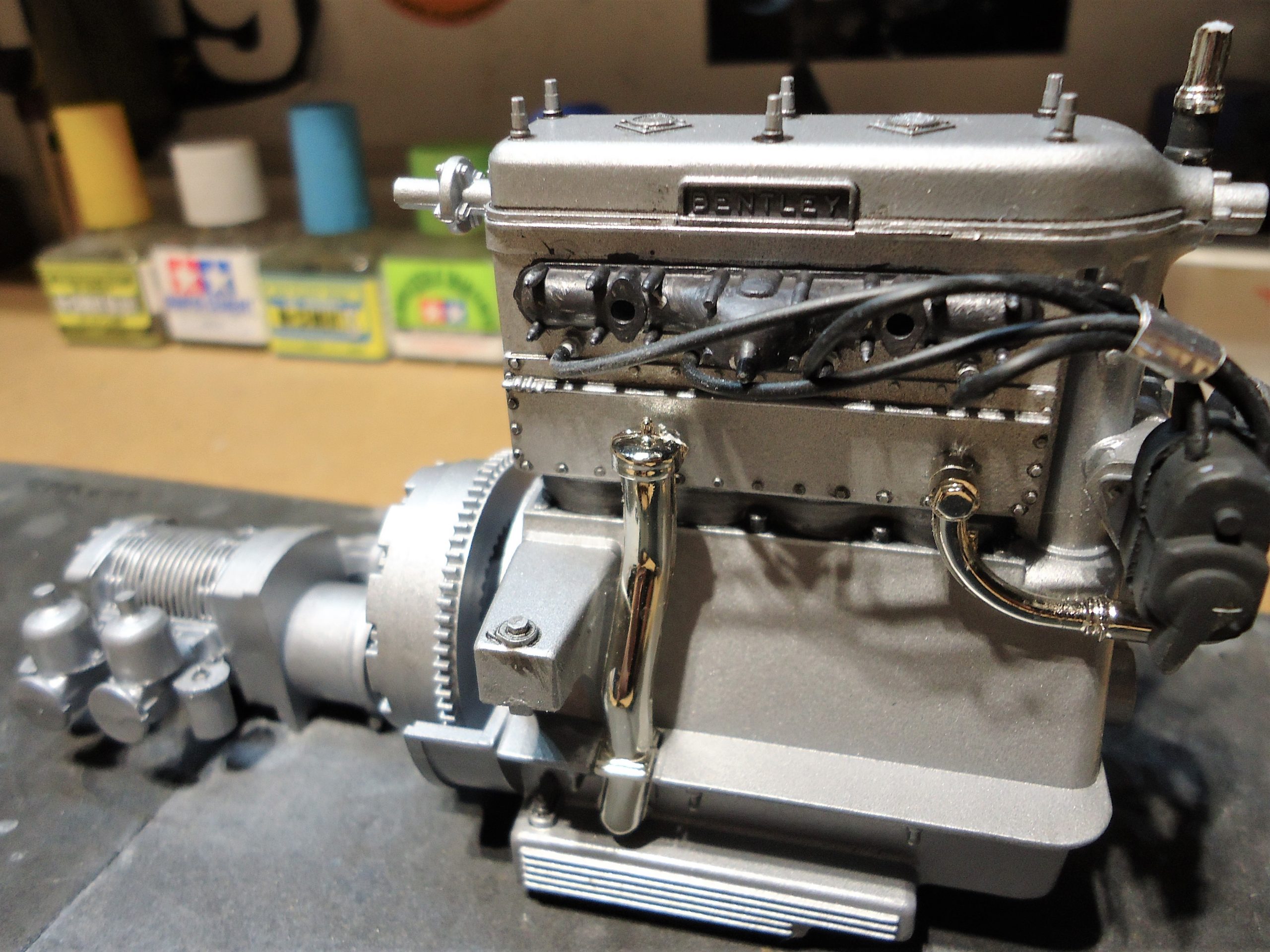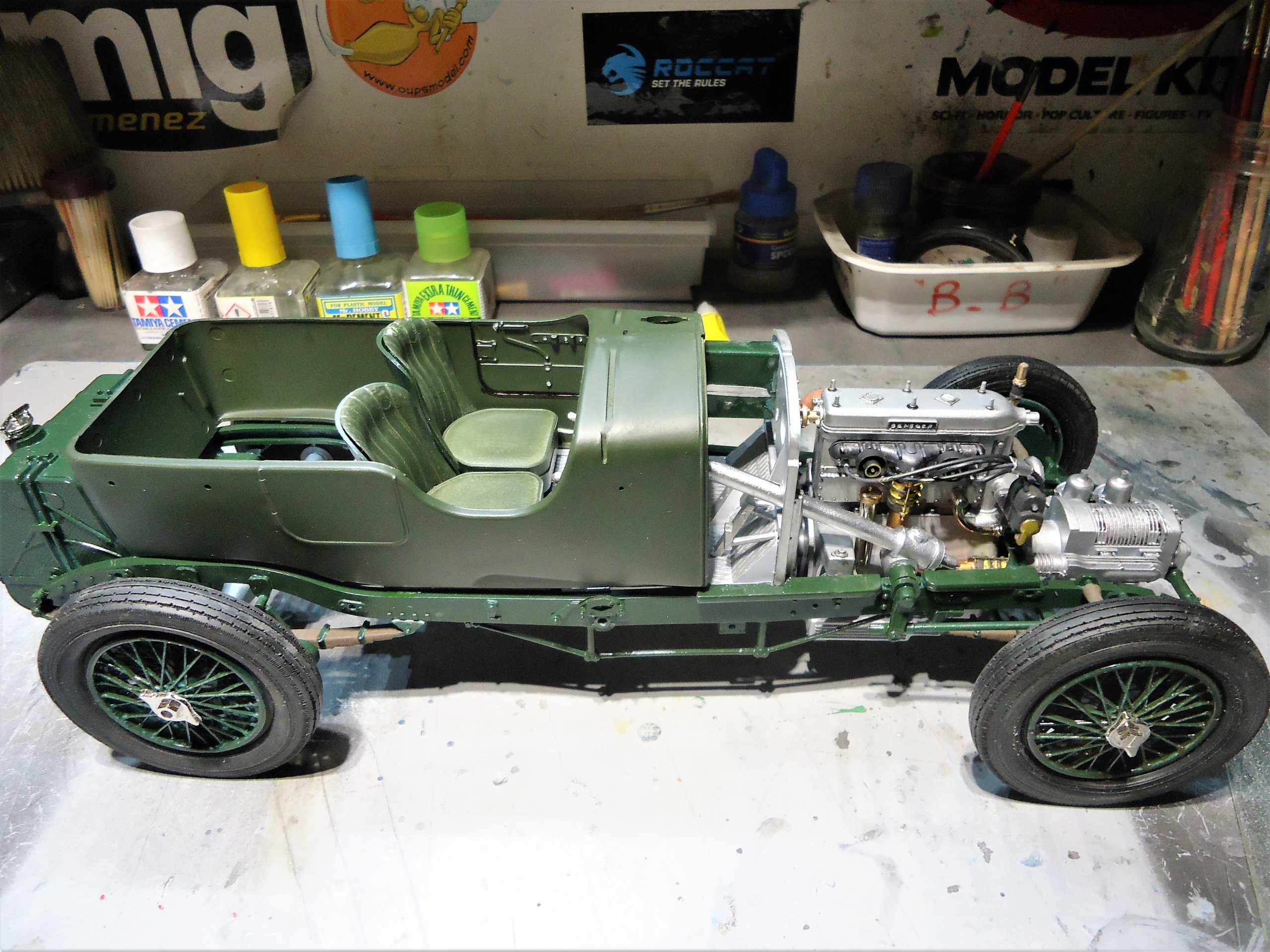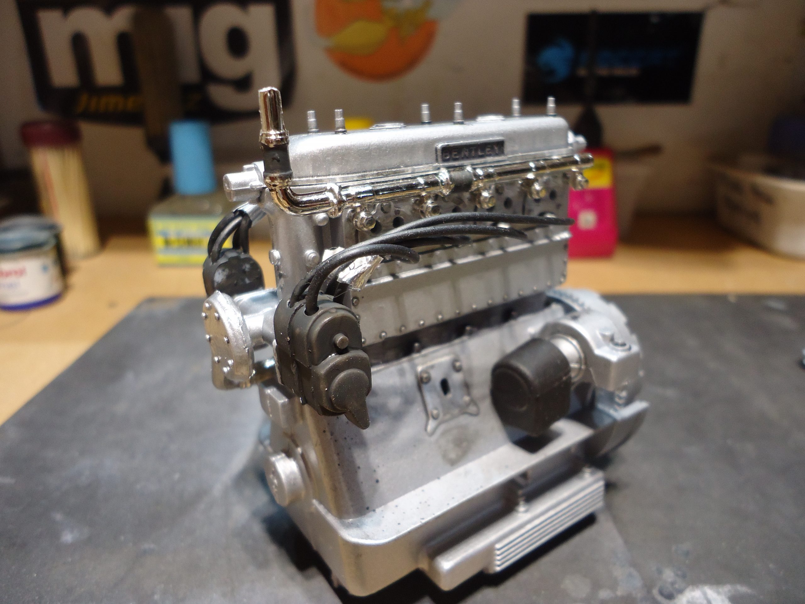 Elle nous a tous fait rêver » dans les vitrines de magasins spécialisés… Je parle de 1971 ! Pensez, une maquette au 1/12ème proposée par Airfix, qui était à l’époque l’un des meilleurs fabricants. Donc… au boulot pour une version modernisée car elle a été rééditée 8 fois en tout jusqu’en 2020. La maquette se compose d’environ 300 pièces. Certes, le kit a bien vieilli et ne souffre pas trop du poids des ans mais il y a encore un gros travail d ‘ébavurage et de préparation, dû à son âge, à une époque où l’on ne connaissait pas encore les « moules à tiroirs ». L’ensemble demeure bon. Le montage est « from the box » avec juste le rajout des grilles métal pour la calandre et les phares. Peinture en deux tons de vert avec la gamme Humbrol « d’époque » posée à l’aérographe. La carrosserie de la vraie étant composée de métal recouvert de cuir par endroits. Une légère couche de vernis mat, sur les parties concernées, a été posée. Toutes les parties du moteur et de la transmission ont quant à elles reçu une touche d ‘Alclad. She made us all dream » in the windows of specialized stores… I’m talking about 1971! Think, a 1/12th scale model proposed by Airfix, which was at the time one of the best manufacturers. So… let’s work on a modernized version because it has been republished 8 times in all until 2020. The model consists of about 300 pieces. Admittedly, the kit has aged well and does not suffer too much from the weight of the years, but there is still a lot of deburring and preparation work, due to its age, at a time when we did not yet know the « drawer moulds. » The whole remains good. The assembly is « from the box. » with just the addition of metal grilles for the grille and headlights. Painted in two shades of green with the « vintage » Humbrol range, airbrushed. The body of the real one is made of metal covered with leather in places. A slight layer of matte varnish, on the relevant parts, was installed. As for all the parts of the engine and transmission, they received an Alclad key.