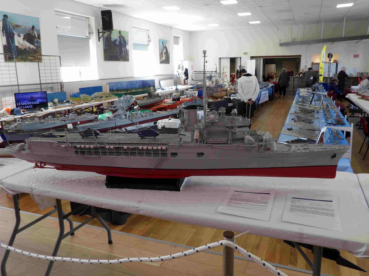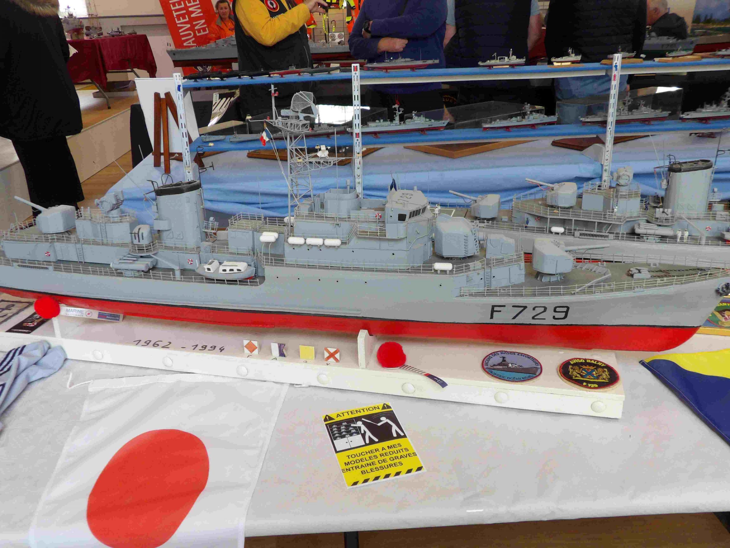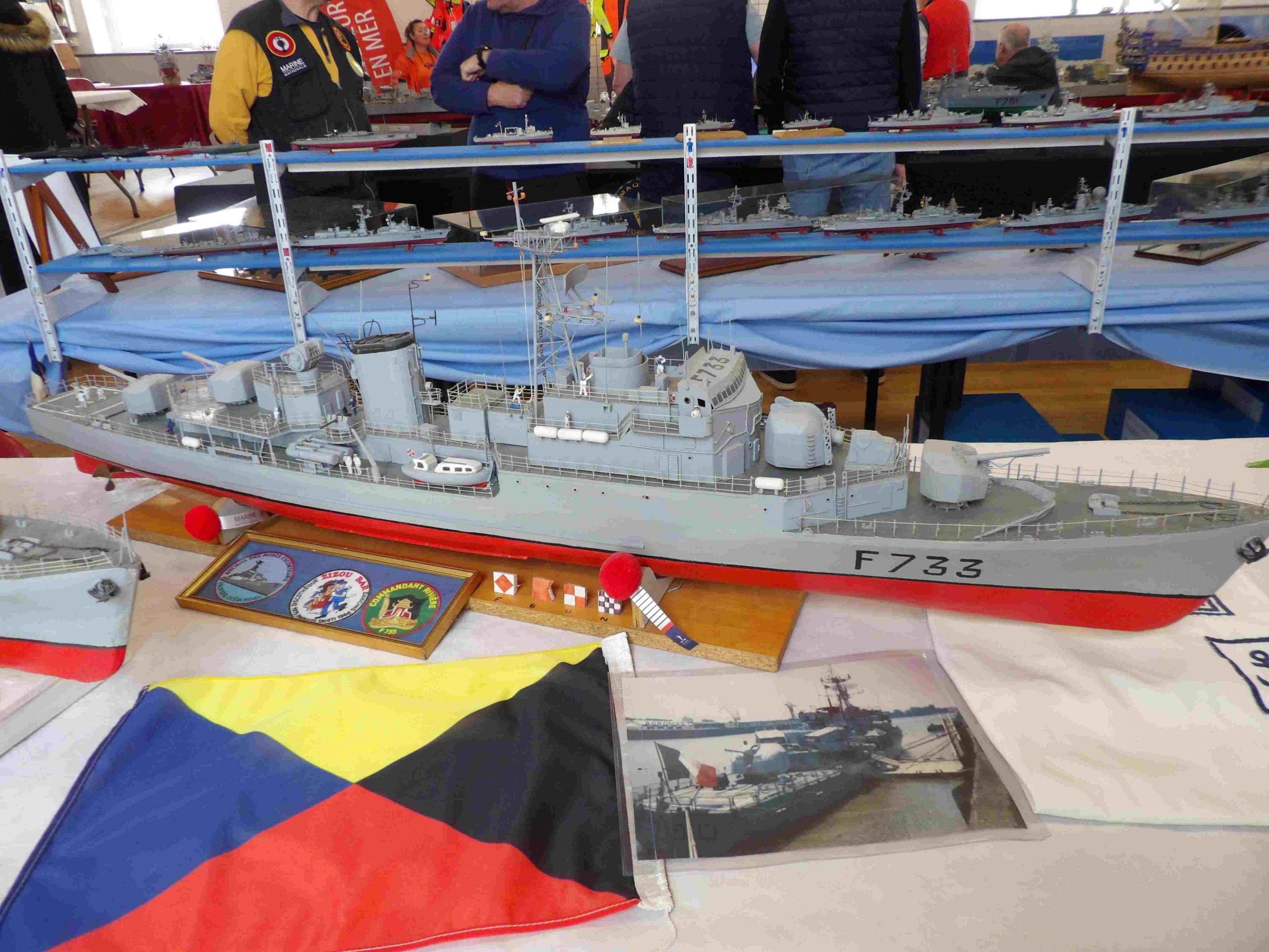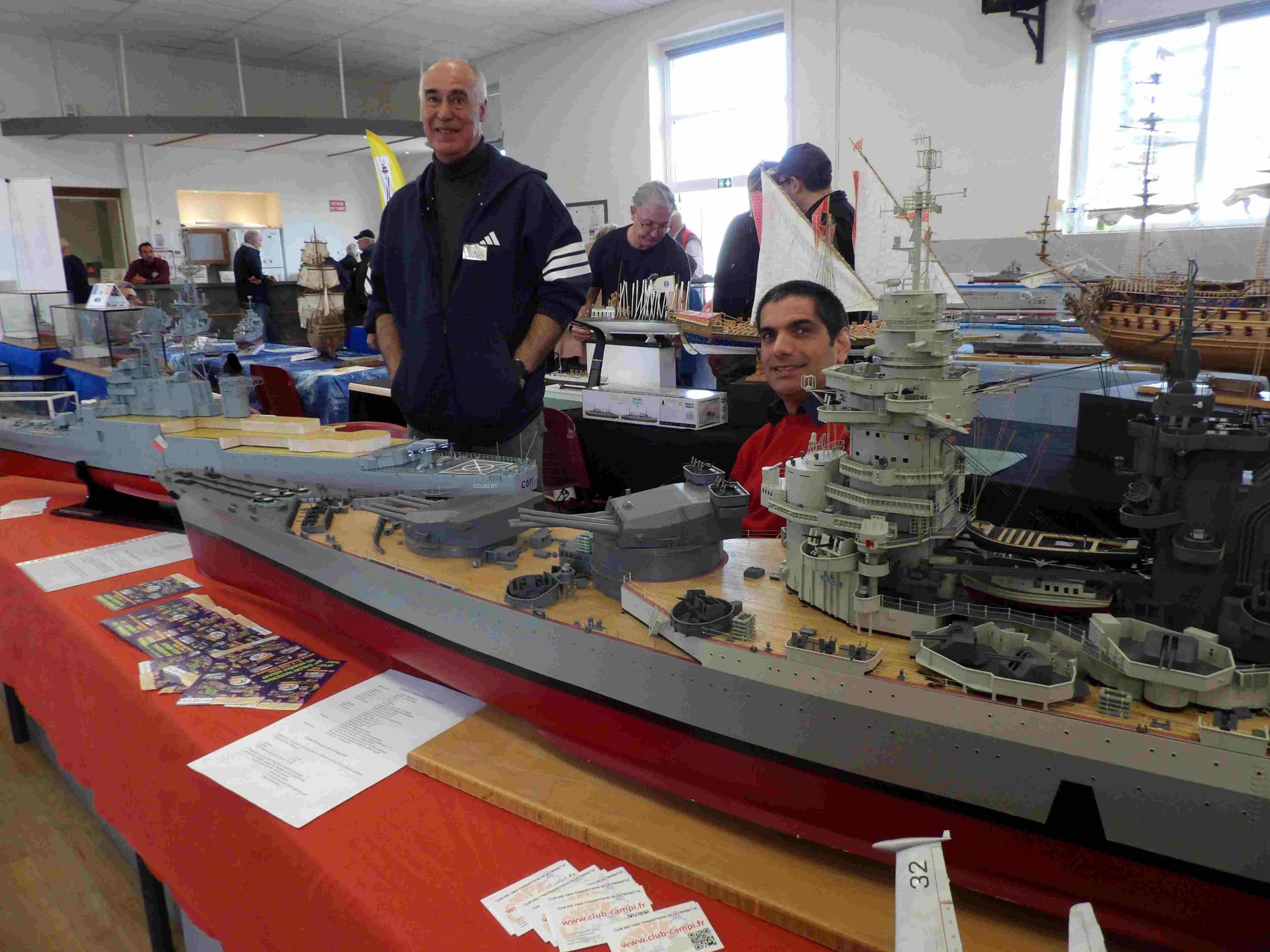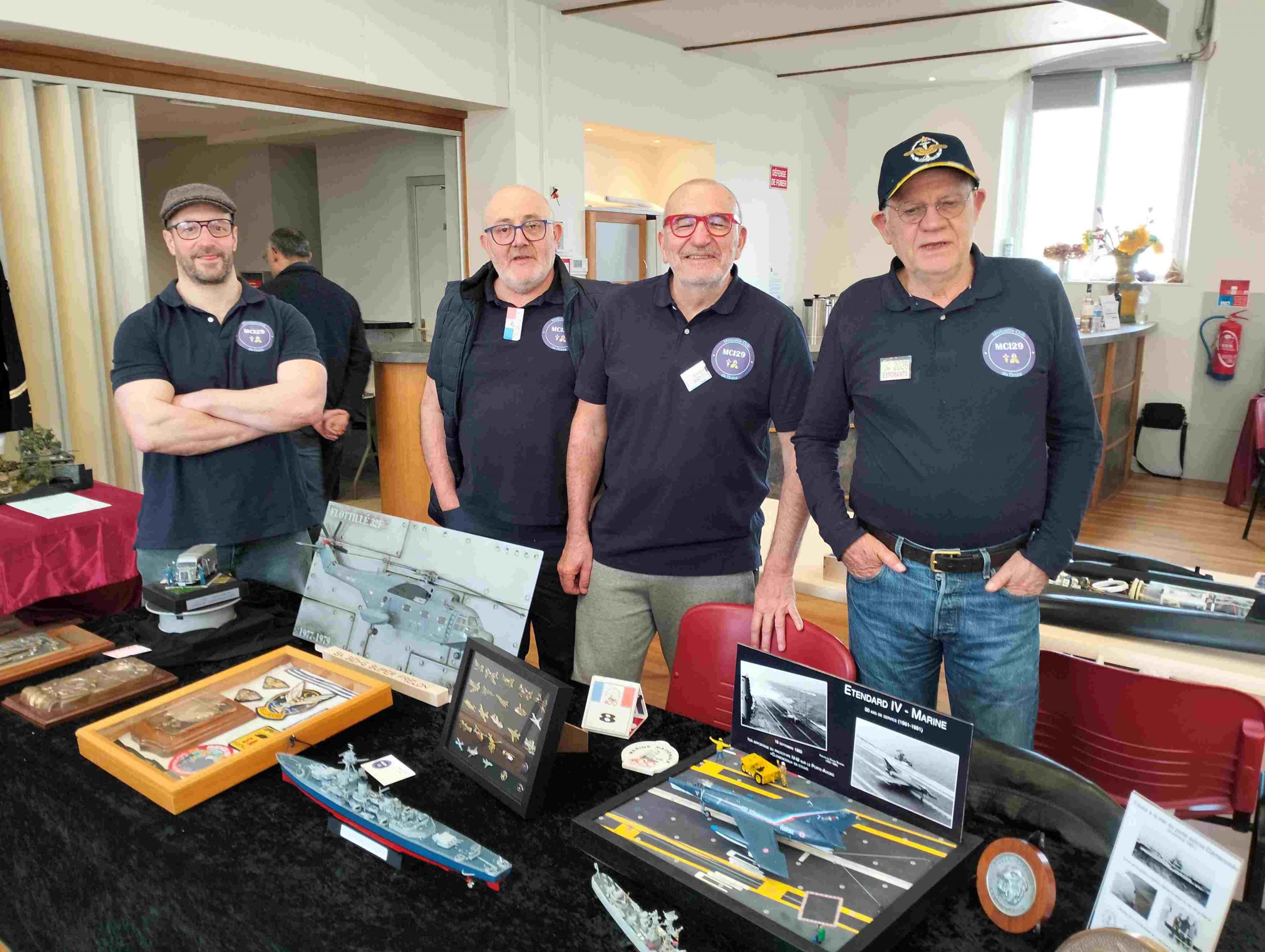 Samedi matin, 8 heures, route CROZON / PLOUHINEC. Jusqu’à Douarnenez, nous étions encore en terre connue. Puis à un moment, direction la pointe du raz, le GPS nous a fait tourner à gauche pour rejoindre PLOUHINEC et là !!!! nous avons eu la sensation d’être sur Mars, des routes méga défoncées, la terre de la désolation. Enfin PLOUHINEC. La salle est bien fléchée. Arrivée sur place, accueil des plus sympas avec Jean Louis et son équipe (rien que des jeunes). On s’installe, Dédé, Domi et Will sont déjà là. Autour de nous que des maquettes de la Marine Nationale. Nous sommes dos à dos avec le MSM 29, un plaisir.