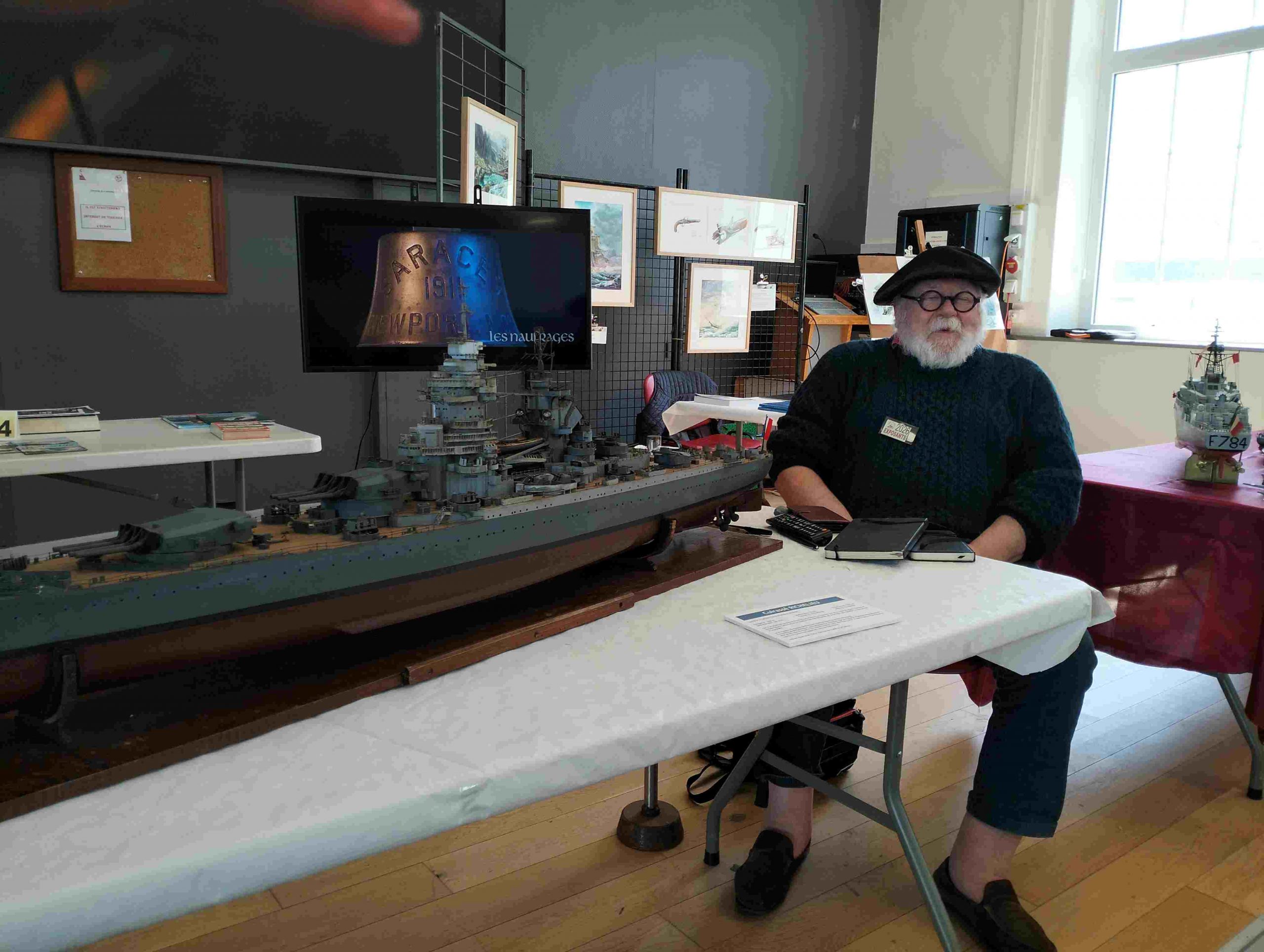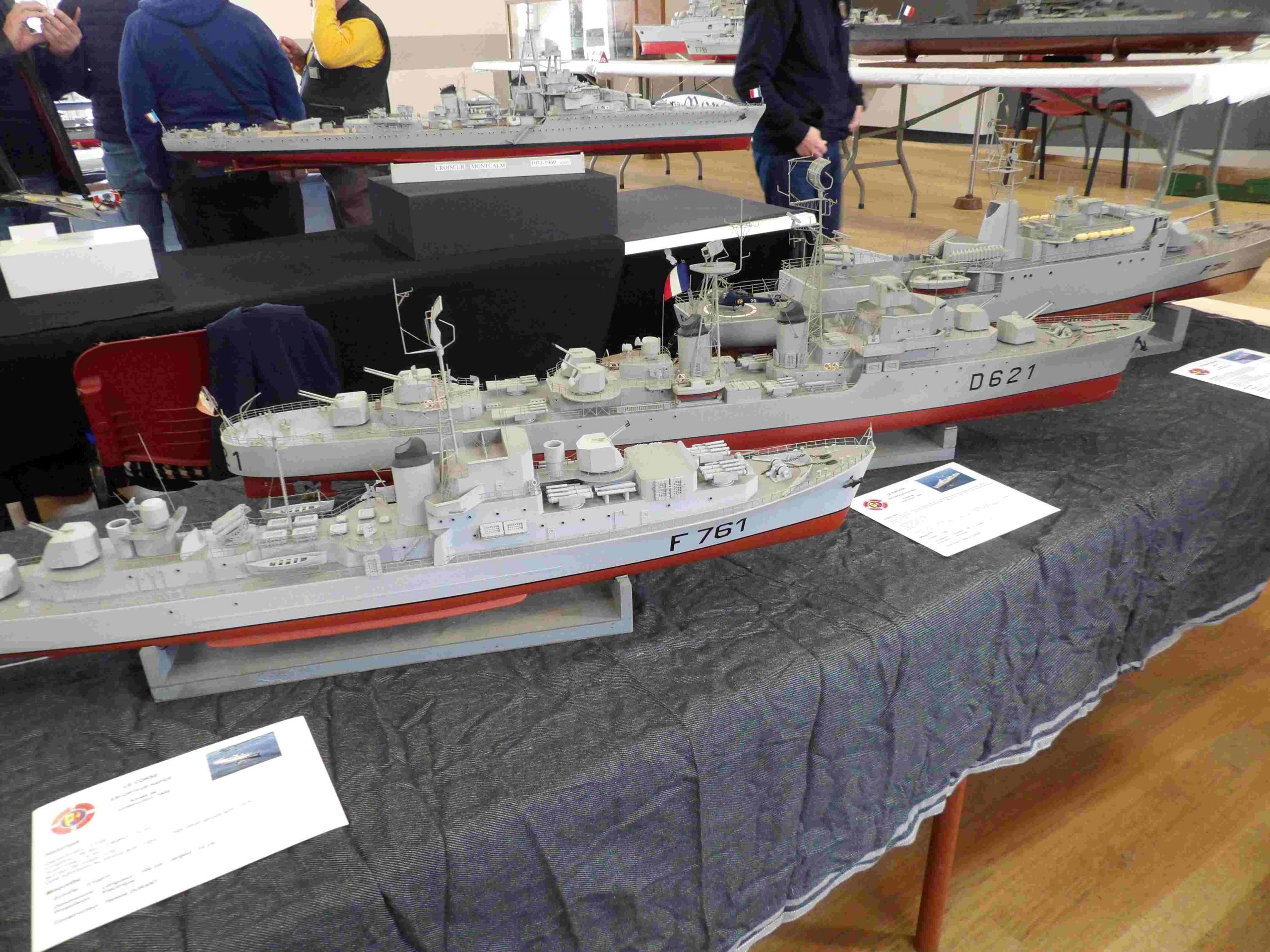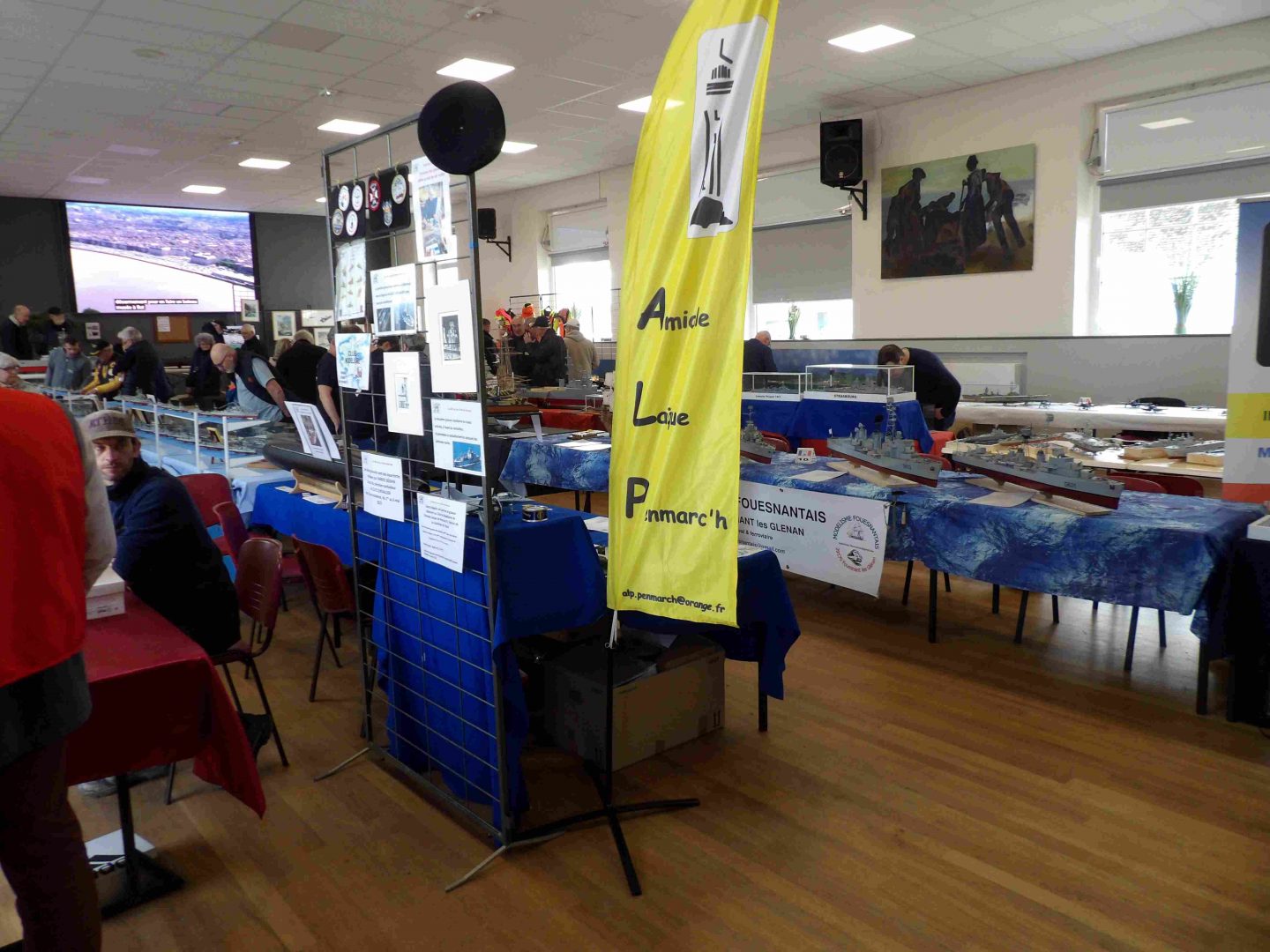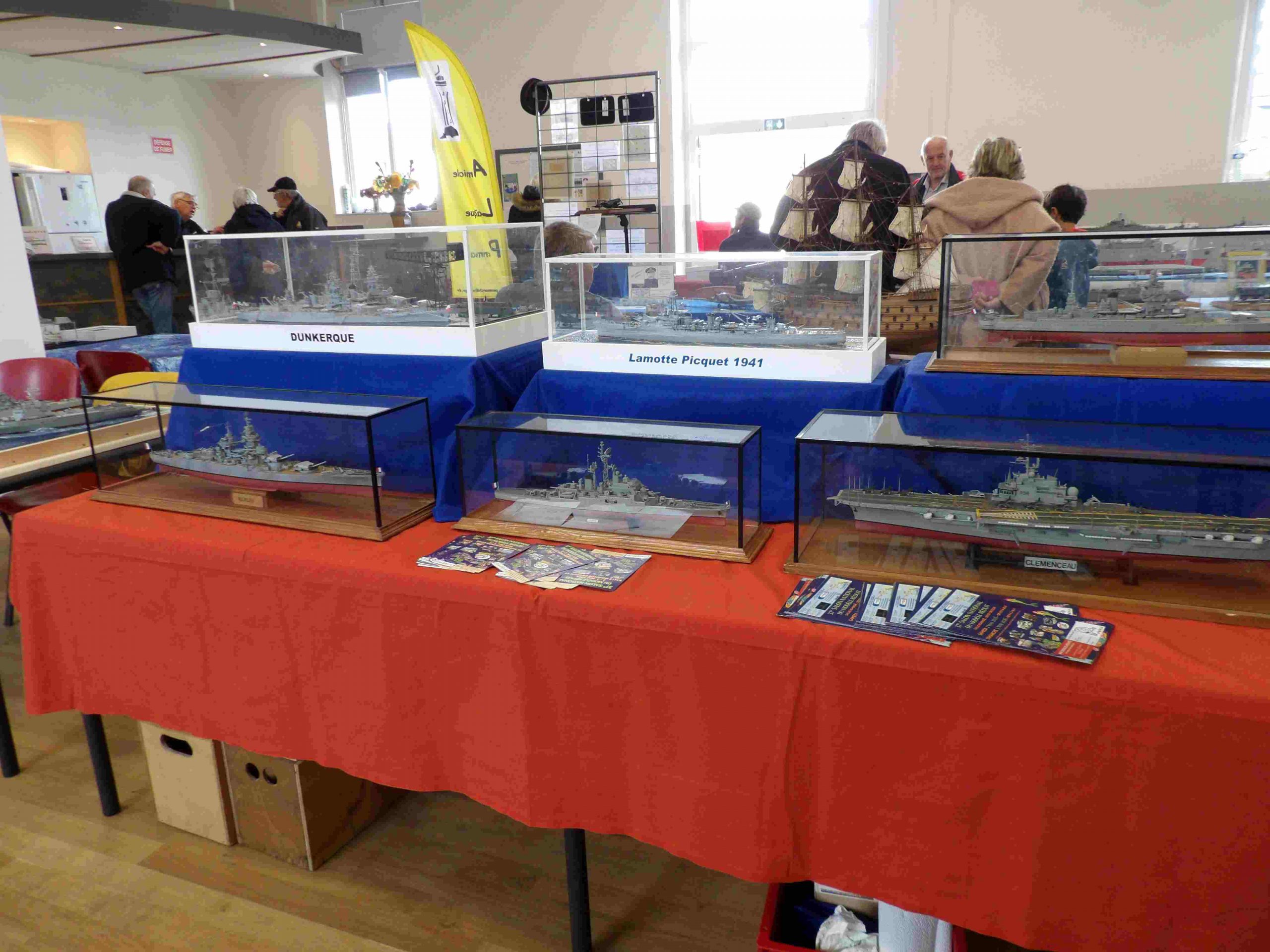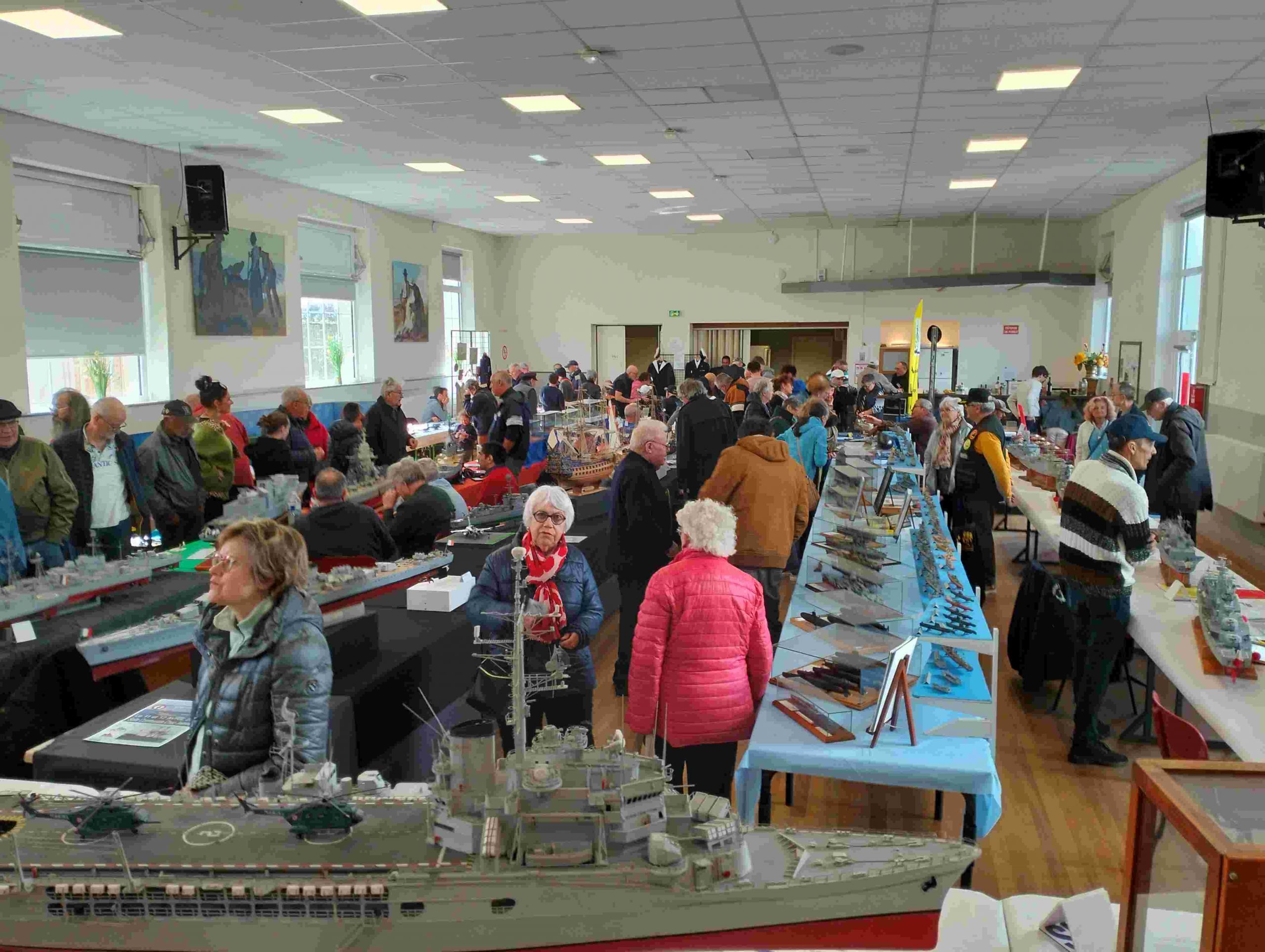 Samedi matin, 8 heures, route CROZON / PLOUHINEC. Jusqu’à Douarnenez, nous étions encore en terre connue. Puis à un moment, direction la pointe du raz, le GPS nous a fait tourner à gauche pour rejoindre PLOUHINEC et là !!!! nous avons eu la sensation d’être sur Mars, des routes méga défoncées, la terre de la désolation. Enfin PLOUHINEC. La salle est bien fléchée. Arrivée sur place, accueil des plus sympas avec Jean Louis et son équipe (rien que des jeunes). On s’installe, Dédé, Domi et Will sont déjà là. Autour de nous que des maquettes de la Marine Nationale. Nous sommes dos à dos avec le MSM 29, un plaisir.