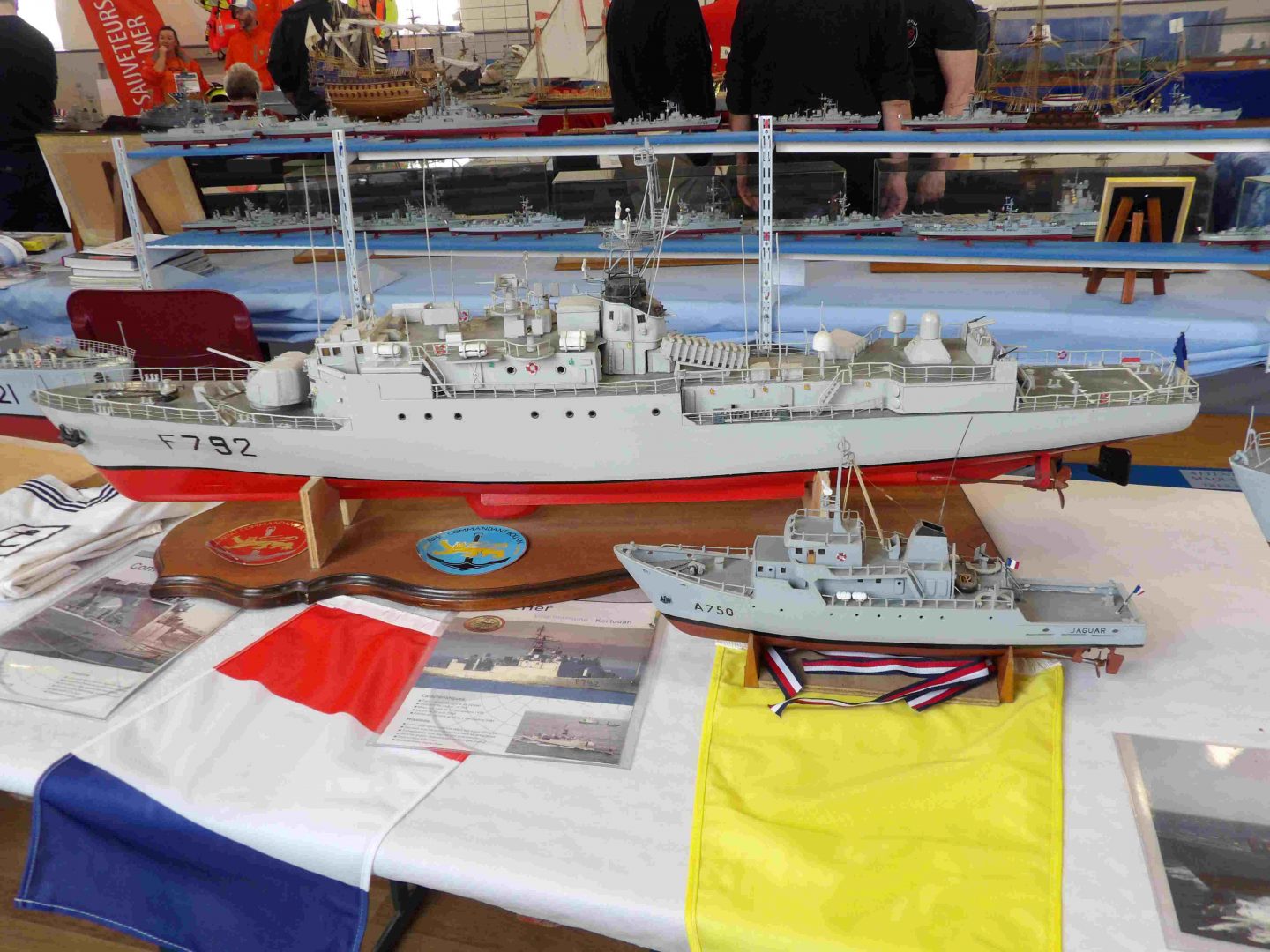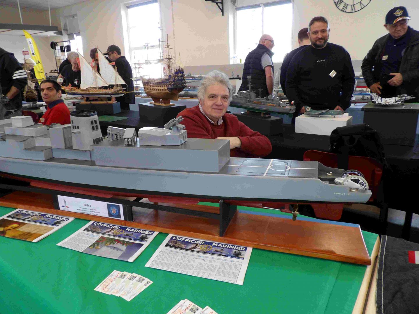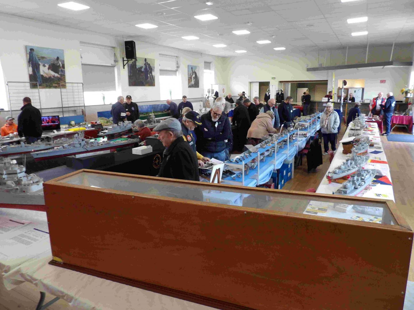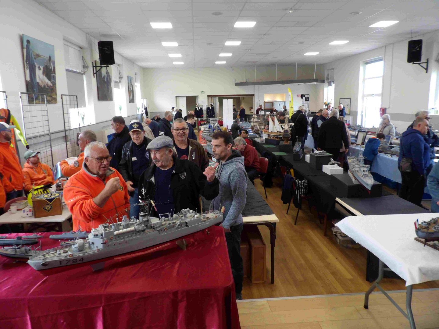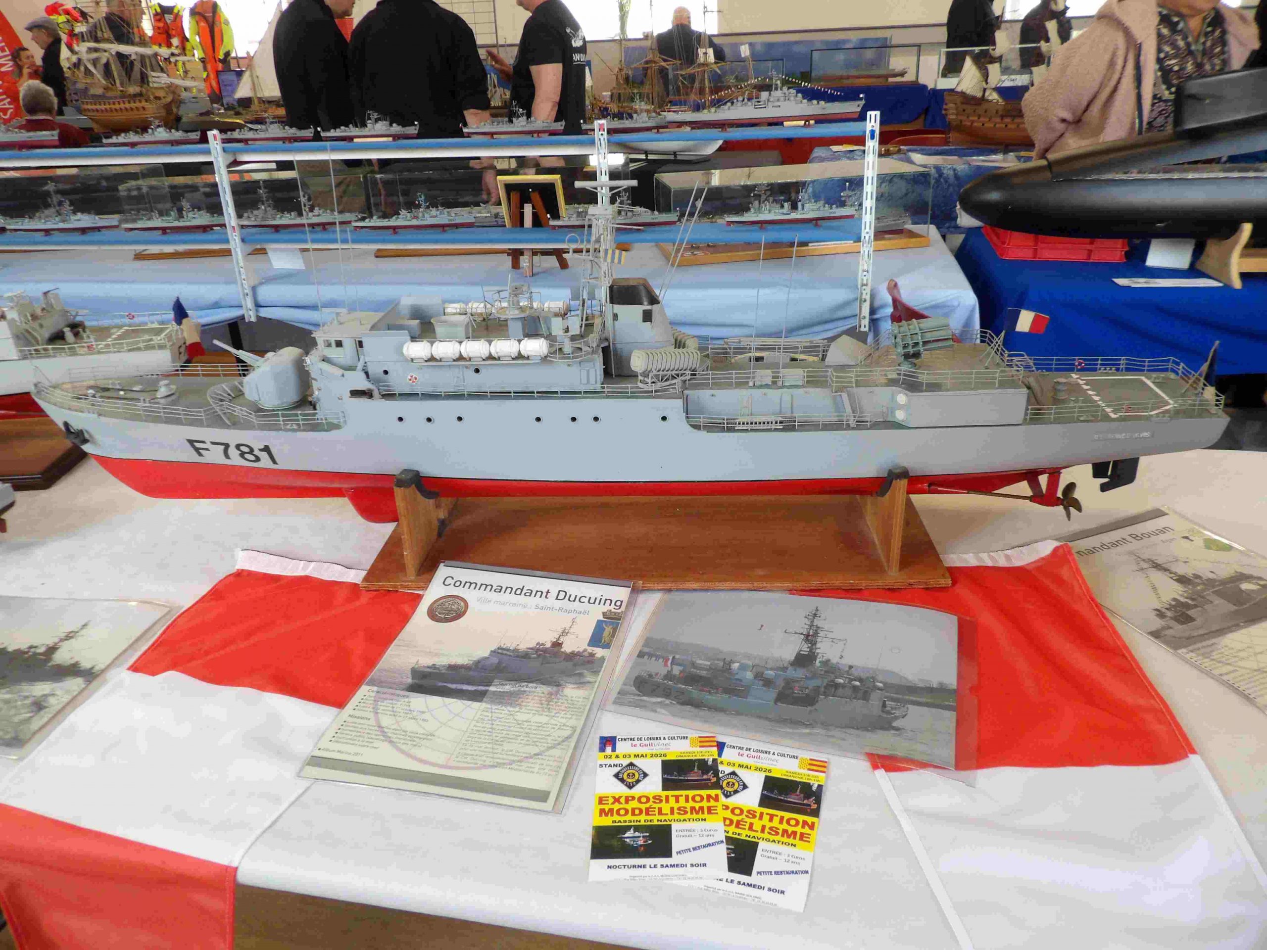 Samedi matin, 8 heures, route CROZON / PLOUHINEC. Jusqu’à Douarnenez, nous étions encore en terre connue. Puis à un moment, direction la pointe du raz, le GPS nous a fait tourner à gauche pour rejoindre PLOUHINEC et là !!!! nous avons eu la sensation d’être sur Mars, des routes méga défoncées, la terre de la désolation. Enfin PLOUHINEC. La salle est bien fléchée. Arrivée sur place, accueil des plus sympas avec Jean Louis et son équipe (rien que des jeunes). On s’installe, Dédé, Domi et Will sont déjà là. Autour de nous que des maquettes de la Marine Nationale. Nous sommes dos à dos avec le MSM 29, un plaisir.