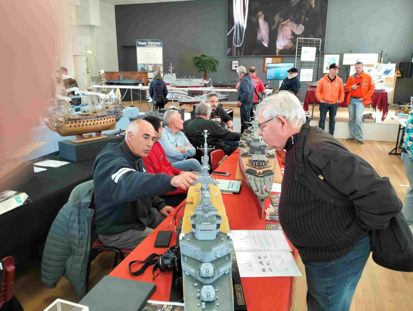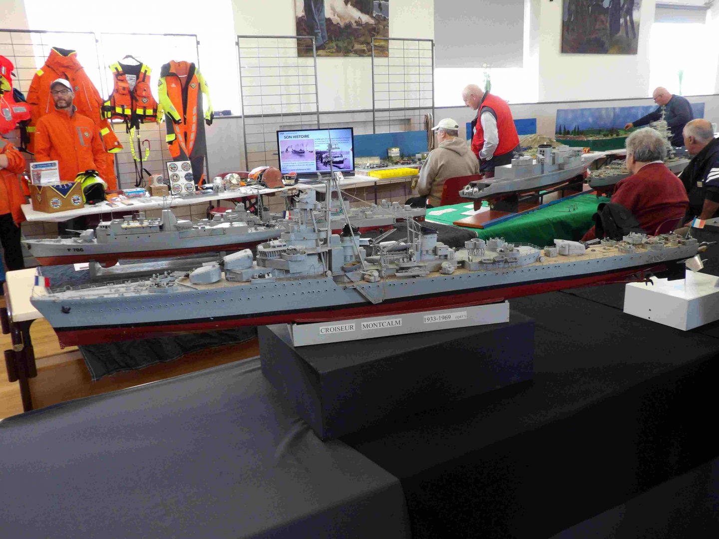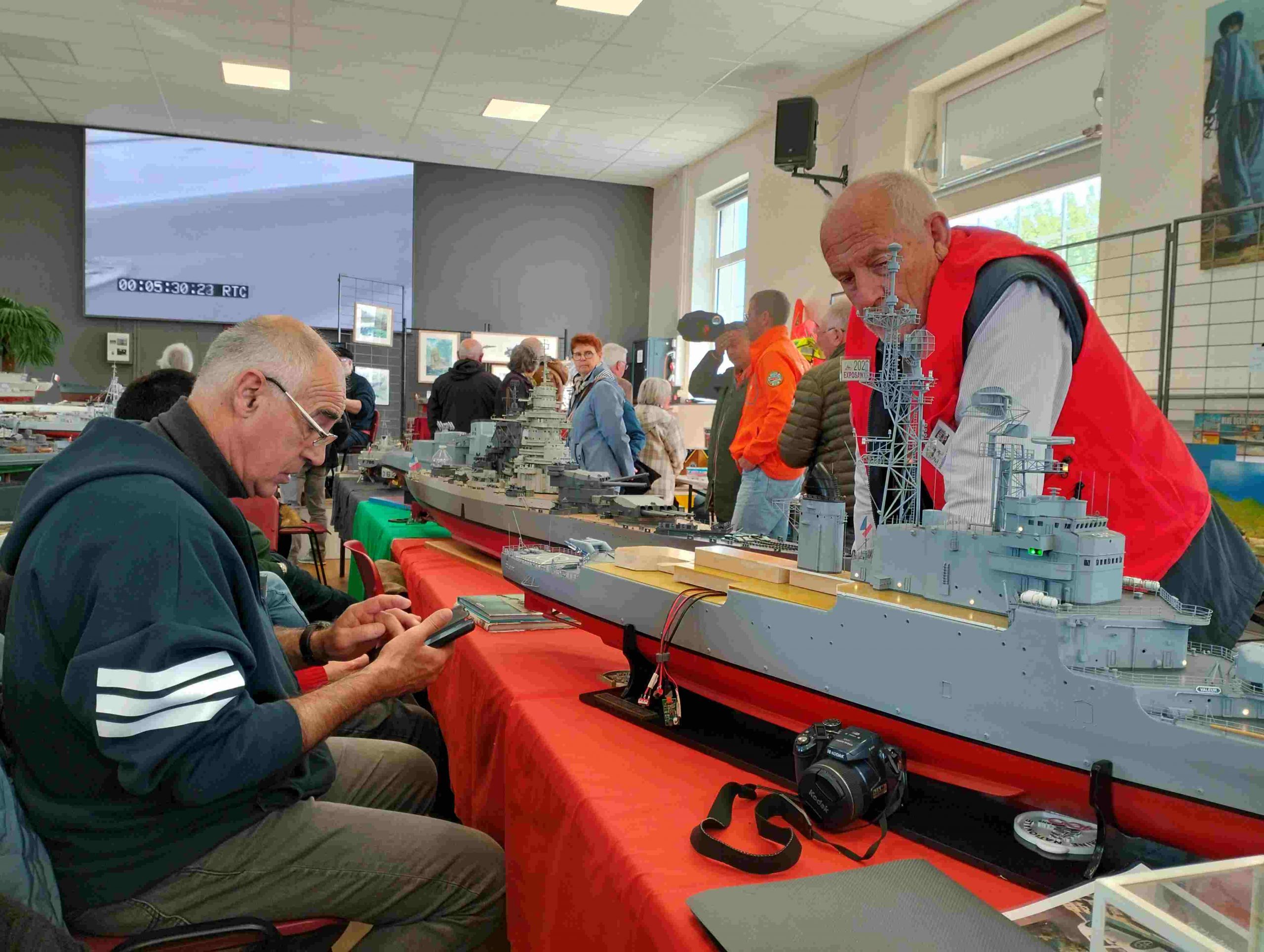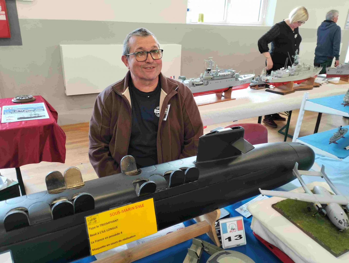 Samedi matin, 8 heures, route CROZON / PLOUHINEC. Jusqu’à Douarnenez, nous étions encore en terre connue. Puis à un moment, direction la pointe du raz, le GPS nous a fait tourner à gauche pour rejoindre PLOUHINEC et là !!!! nous avons eu la sensation d’être sur Mars, des routes méga défoncées, la terre de la désolation. Enfin PLOUHINEC. La salle est bien fléchée. Arrivée sur place, accueil des plus sympas avec Jean Louis et son équipe (rien que des jeunes). On s’installe, Dédé, Domi et Will sont déjà là. Autour de nous que des maquettes de la Marine Nationale. Nous sommes dos à dos avec le MSM 29, un plaisir.
