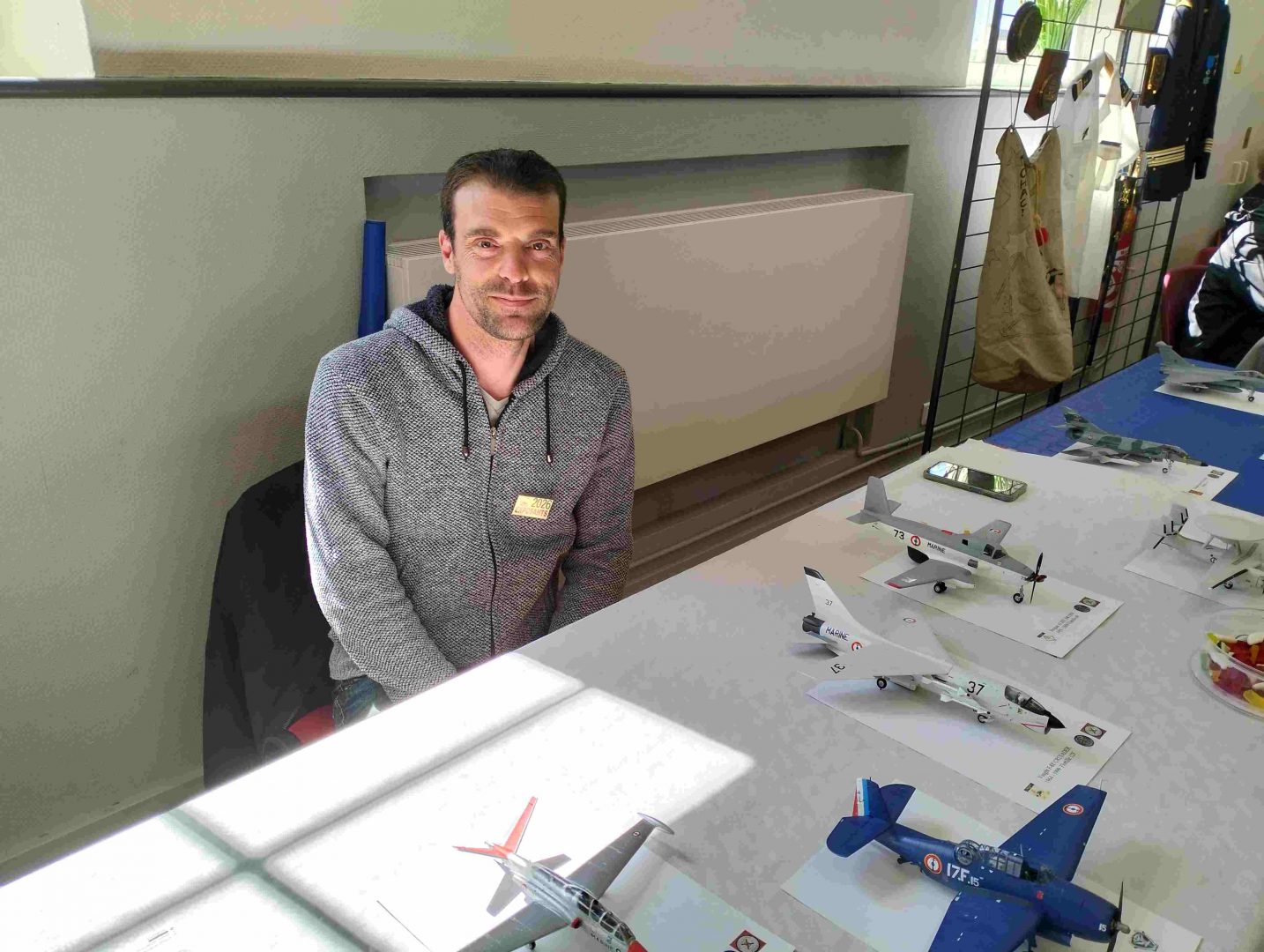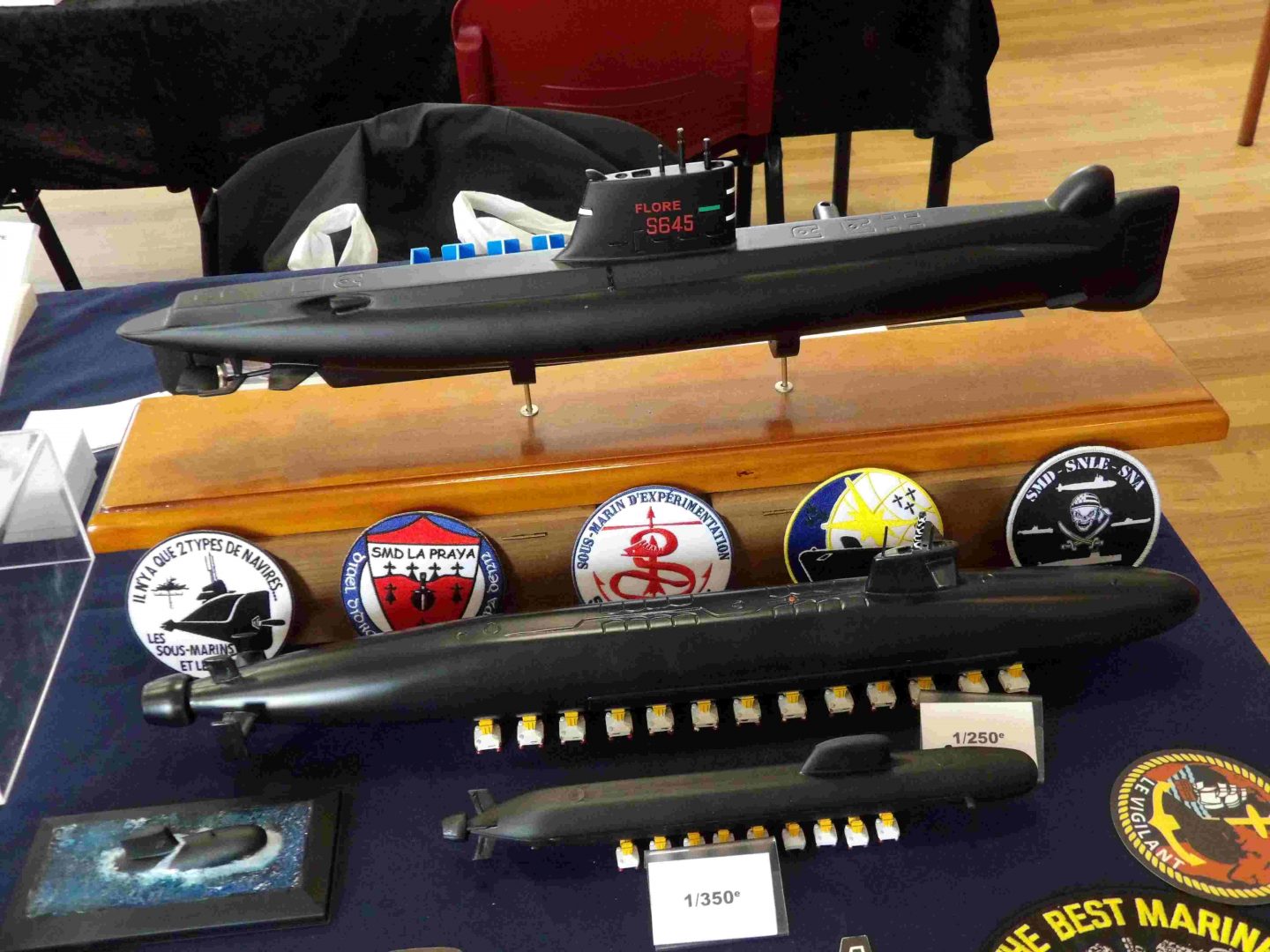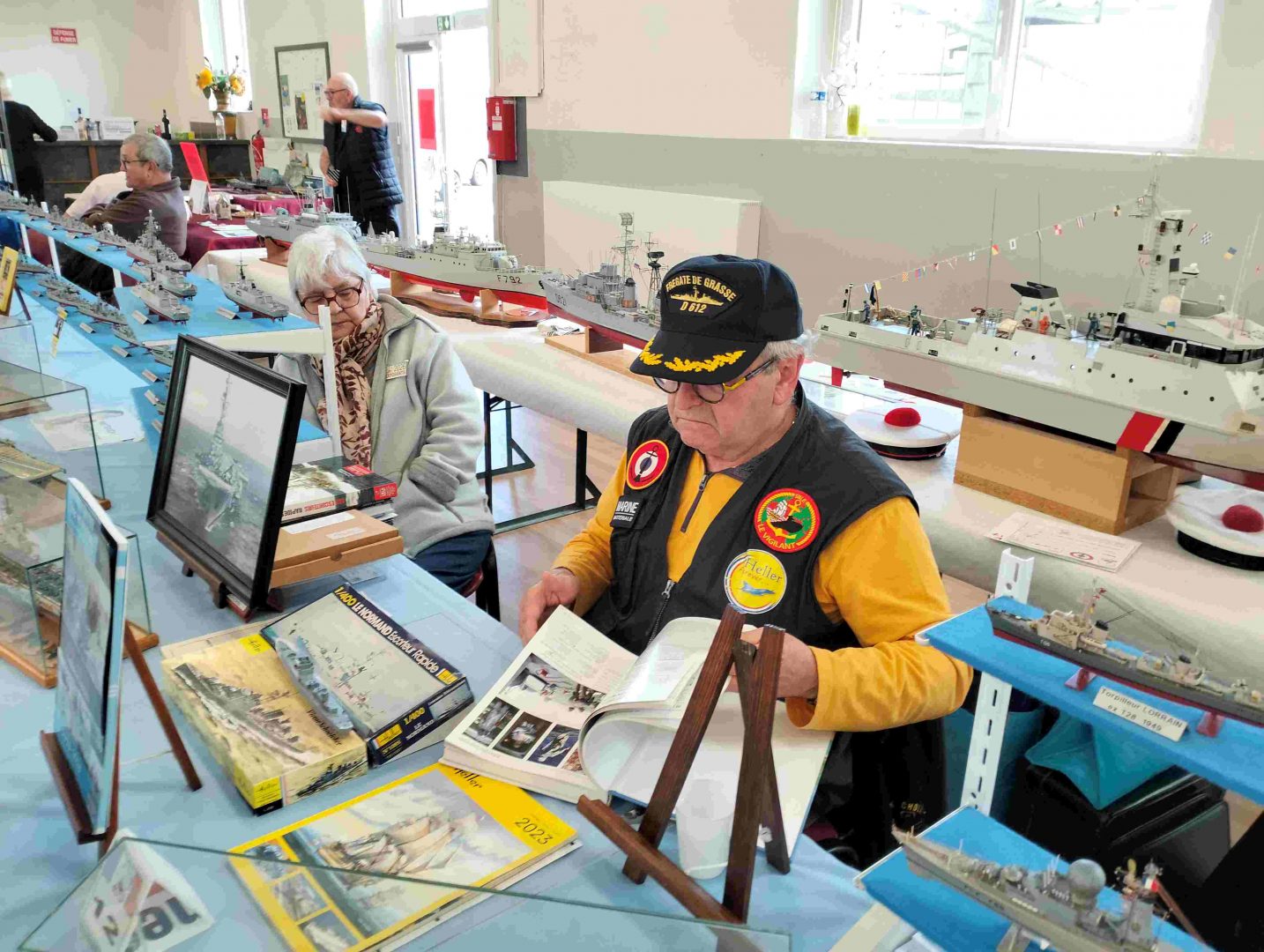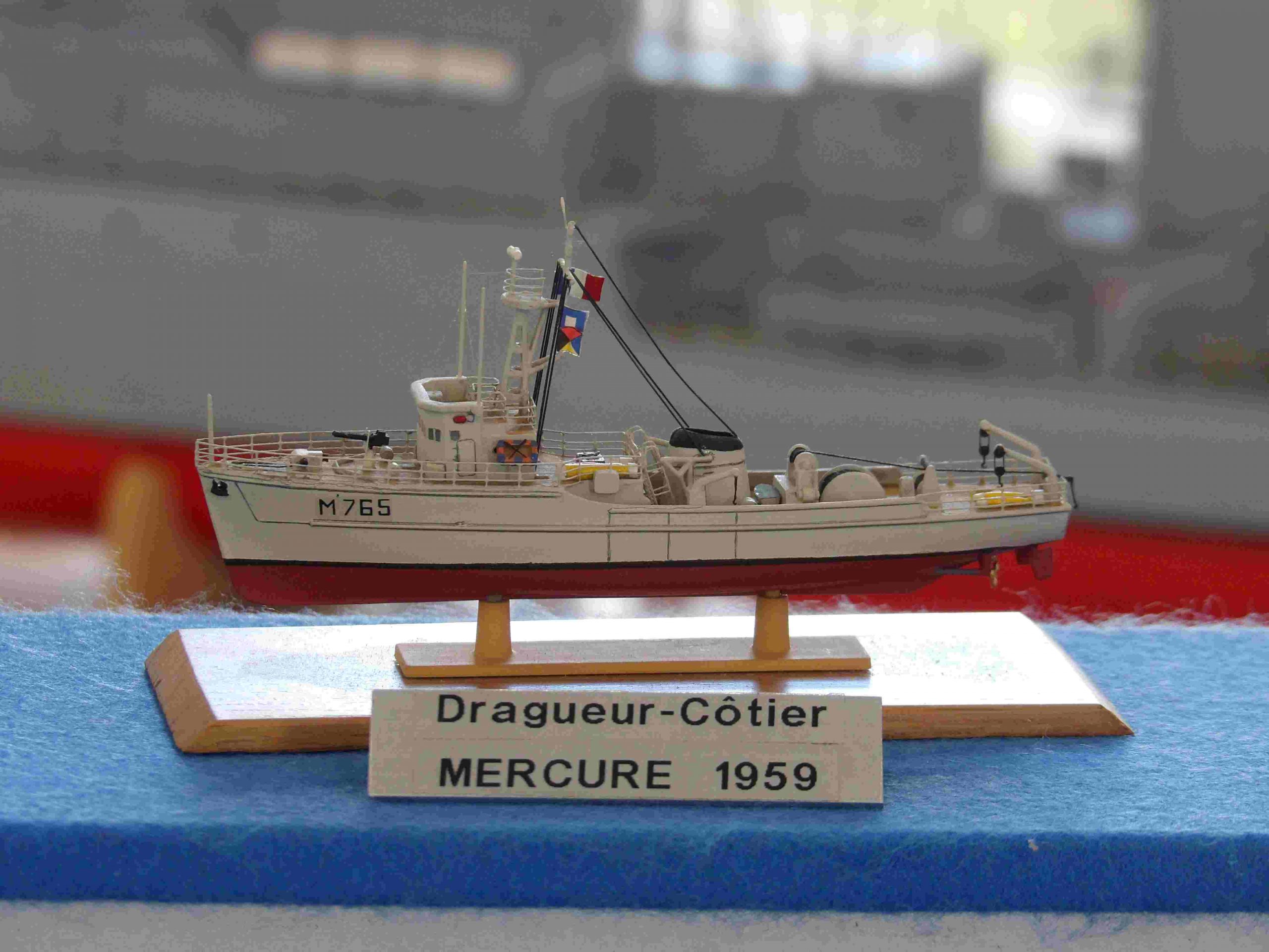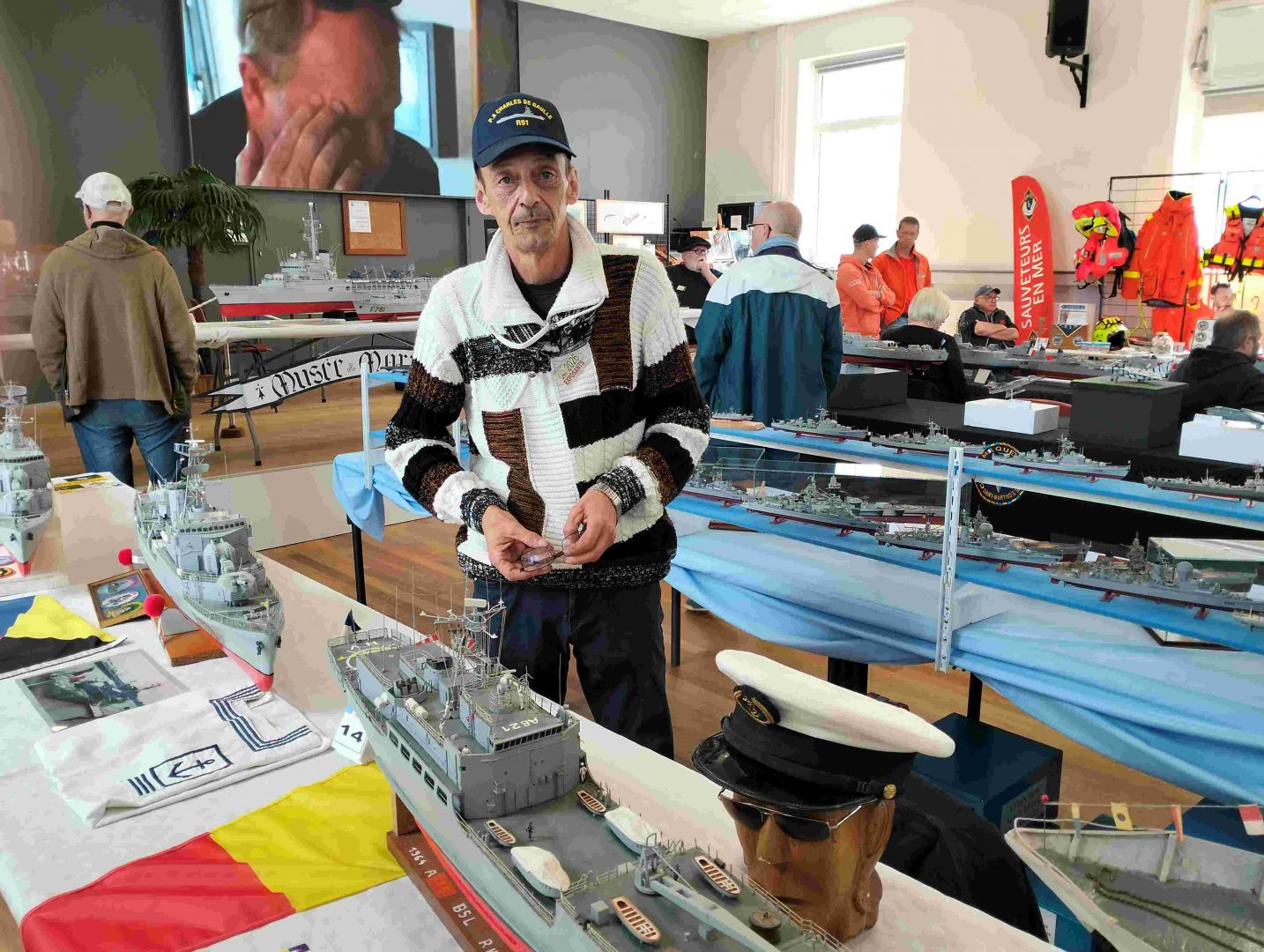 Samedi matin, 8 heures, route CROZON / PLOUHINEC. Jusqu’à Douarnenez, nous étions encore en terre connue. Puis à un moment, direction la pointe du raz, le GPS nous a fait tourner à gauche pour rejoindre PLOUHINEC et là !!!! nous avons eu la sensation d’être sur Mars, des routes méga défoncées, la terre de la désolation. Enfin PLOUHINEC. La salle est bien fléchée. Arrivée sur place, accueil des plus sympas avec Jean Louis et son équipe (rien que des jeunes). On s’installe, Dédé, Domi et Will sont déjà là. Autour de nous que des maquettes de la Marine Nationale. Nous sommes dos à dos avec le MSM 29, un plaisir.