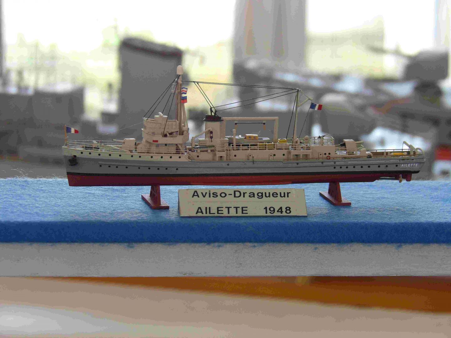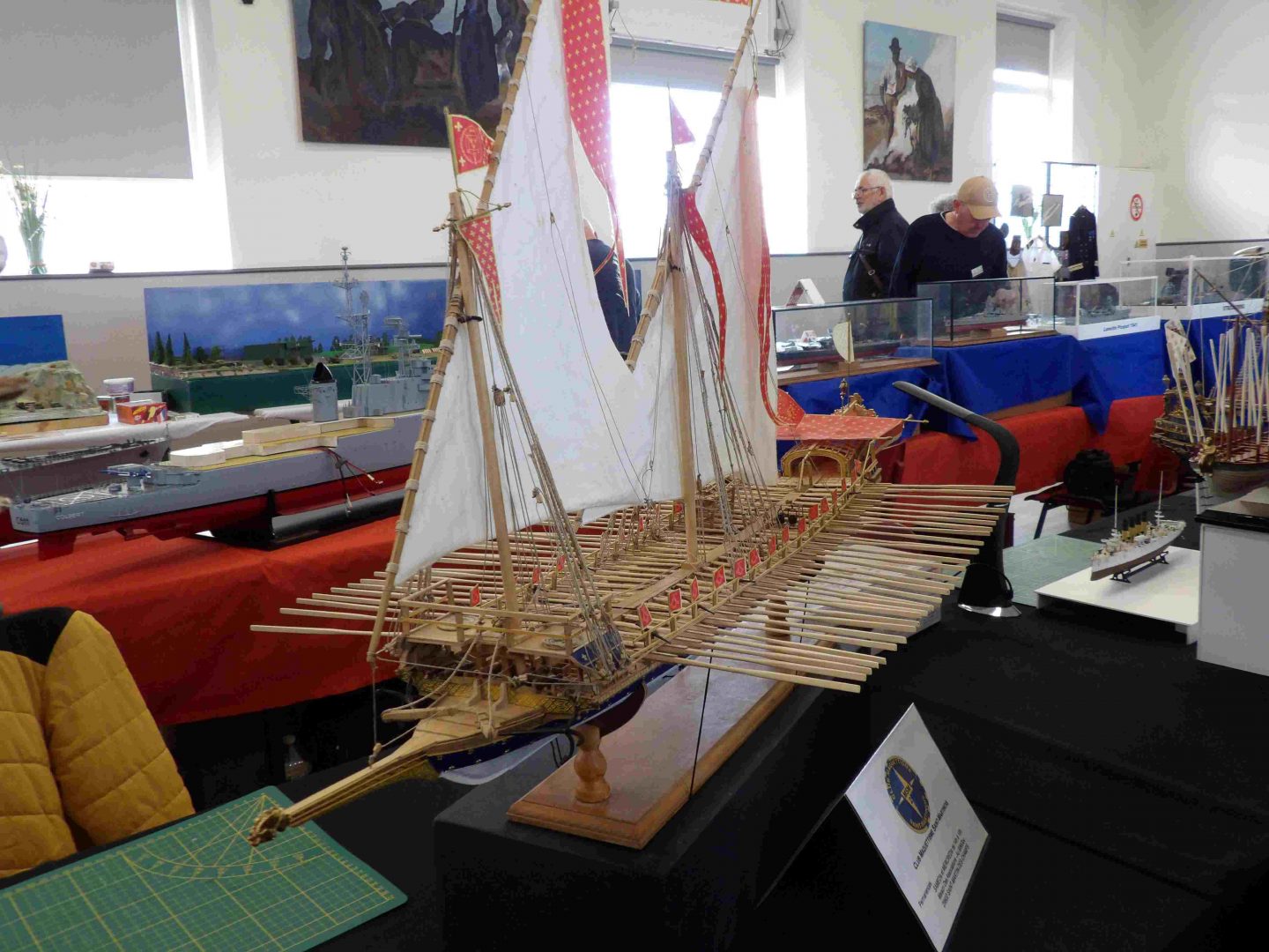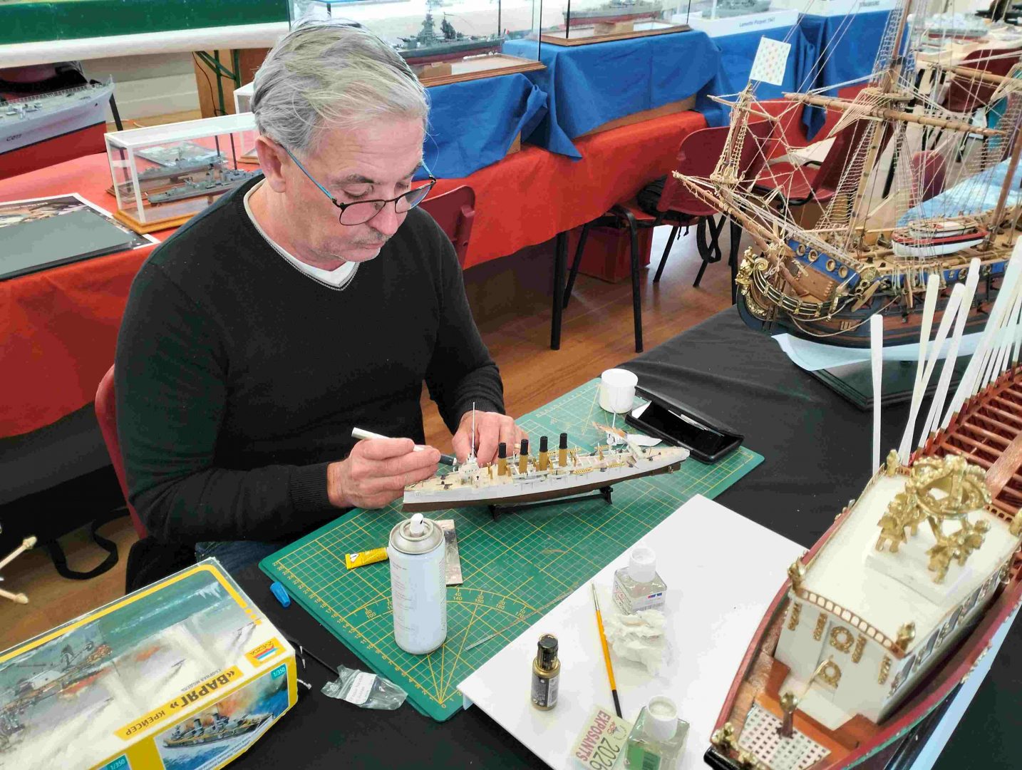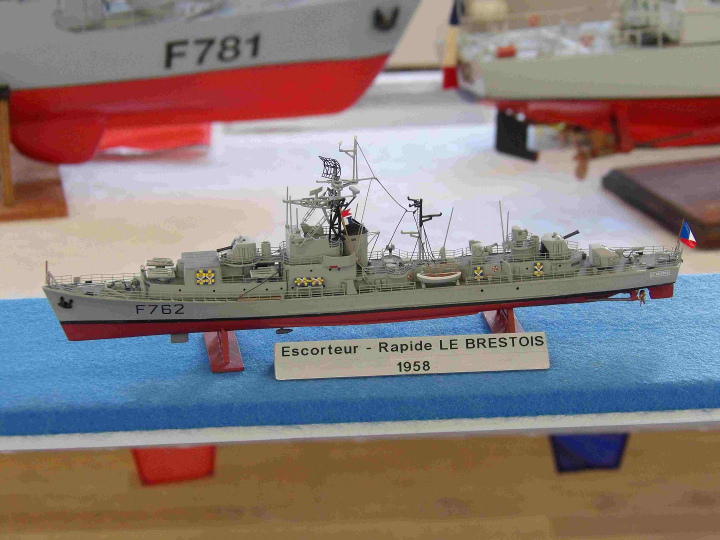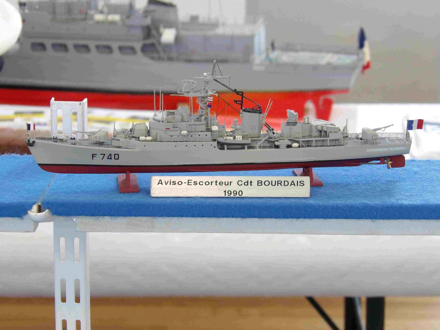 Samedi matin, 8 heures, route CROZON / PLOUHINEC. Jusqu’à Douarnenez, nous étions encore en terre connue. Puis à un moment, direction la pointe du raz, le GPS nous a fait tourner à gauche pour rejoindre PLOUHINEC et là !!!! nous avons eu la sensation d’être sur Mars, des routes méga défoncées, la terre de la désolation. Enfin PLOUHINEC. La salle est bien fléchée. Arrivée sur place, accueil des plus sympas avec Jean Louis et son équipe (rien que des jeunes). On s’installe, Dédé, Domi et Will sont déjà là. Autour de nous que des maquettes de la Marine Nationale. Nous sommes dos à dos avec le MSM 29, un plaisir.