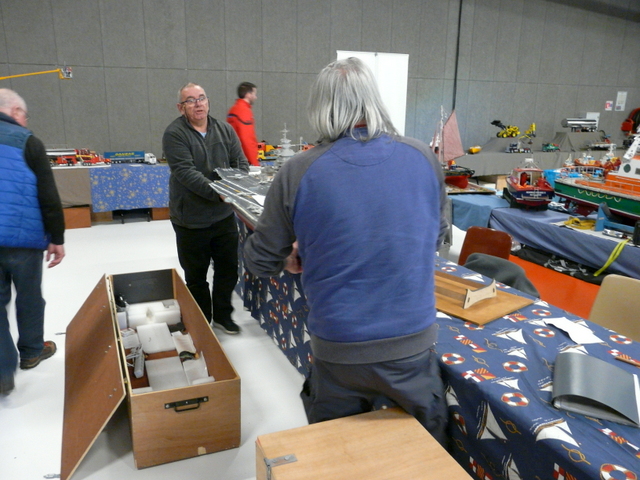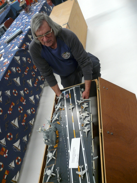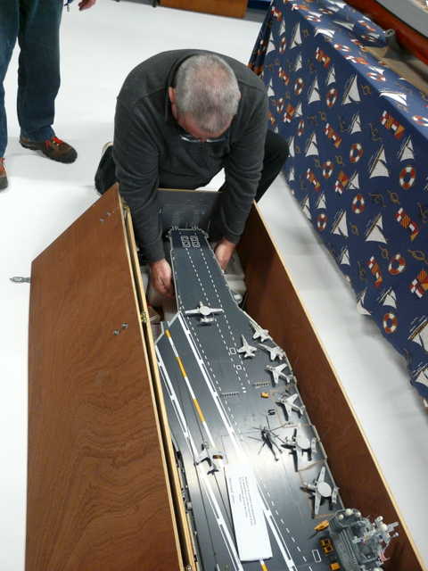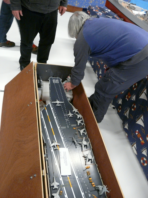 Nappe CAMPI donc posée sur ses 8 mètres à couvrir en quelques secondes. Installation des différentes maquettes, ( bateaux sous vitrines, bateaux navigants, etc…).