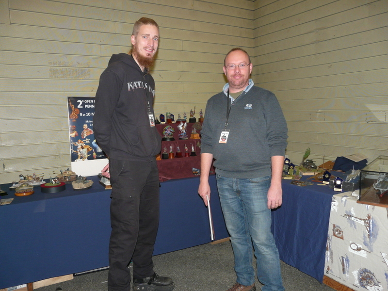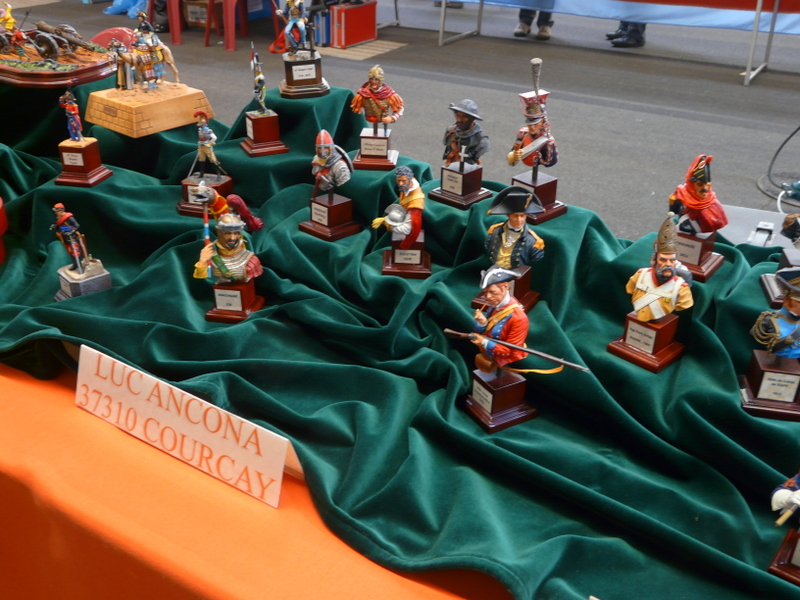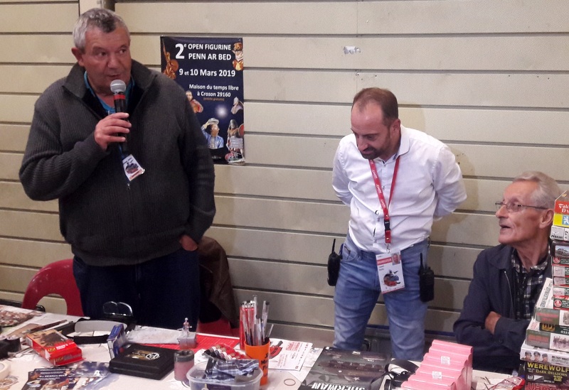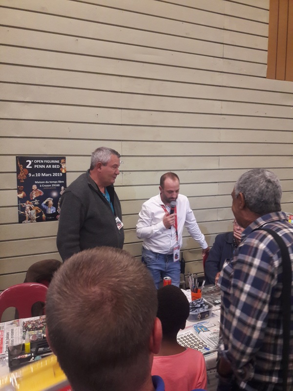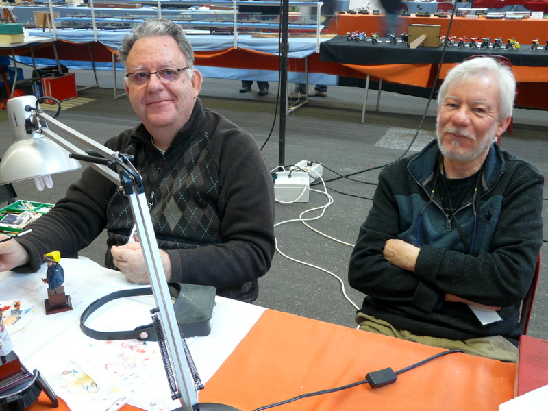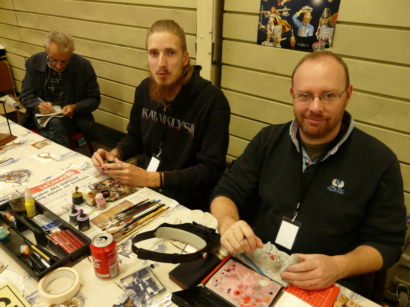Dimanche matin, retour à la salle, pas de changement dans l’accueil, un vrai plaisir. Petit dèj offert. J’attaque mon reportage photo. Une photo égale 10 mn minimum d’échanges verbaux, ça n’avance pas bien vite mon reportage. Nos deux figurinistes font des démos de peinture au stand, qui interpellent pas mal le public qui les félicite souvent pour leur patience et leur passion.