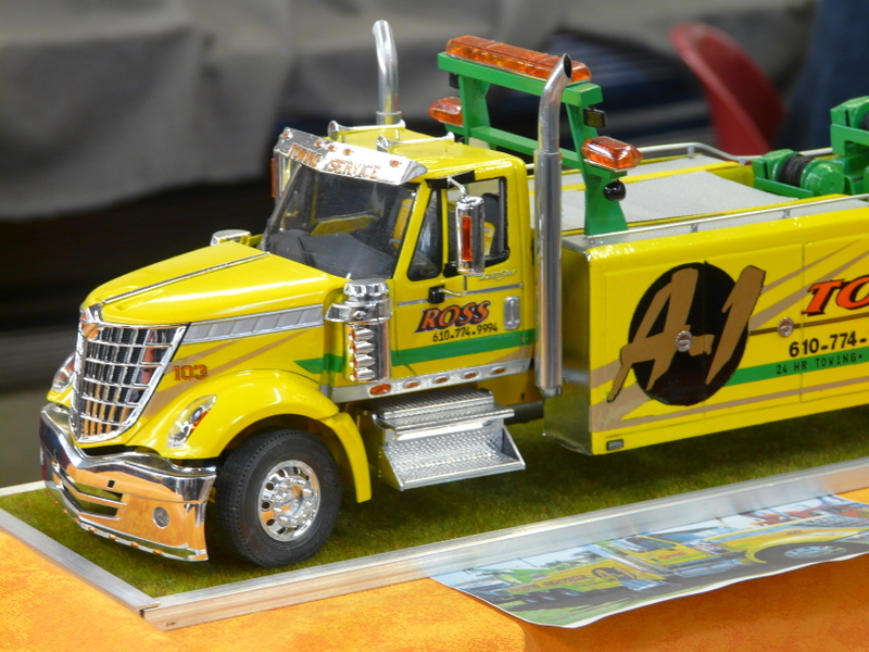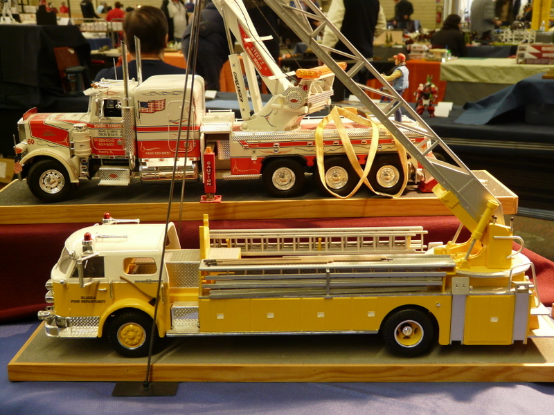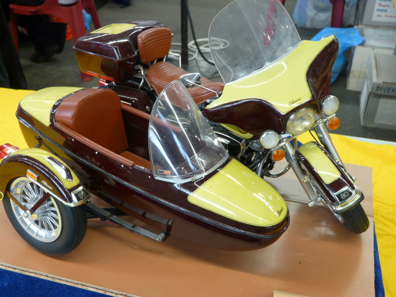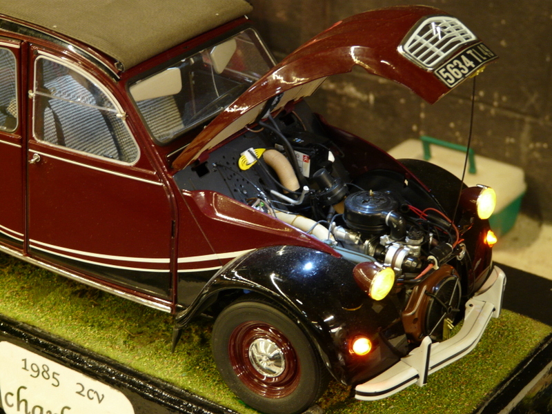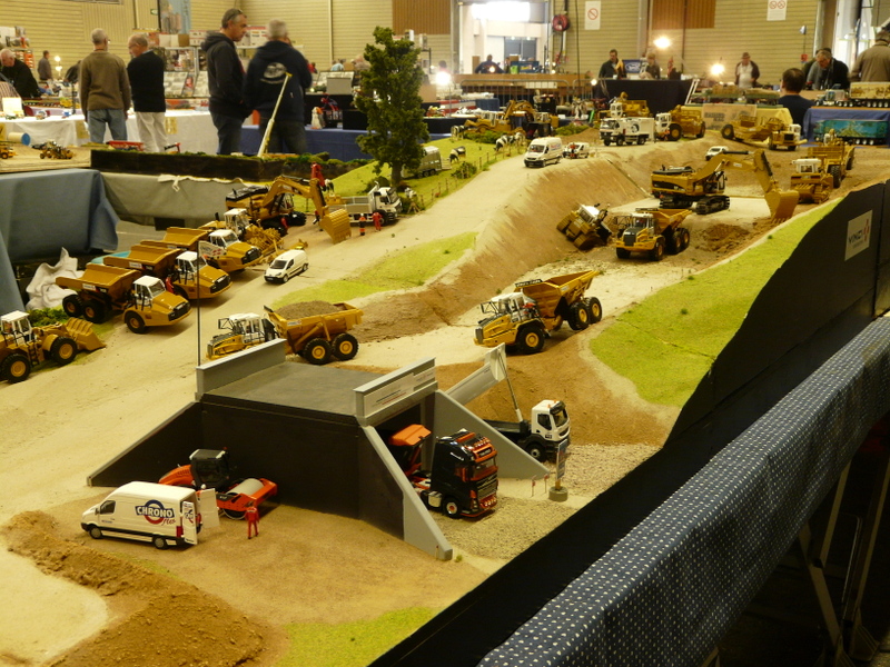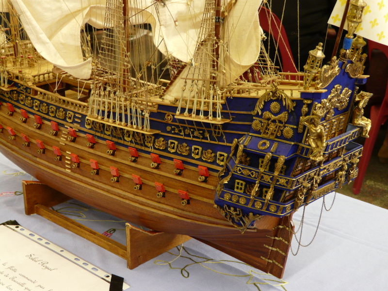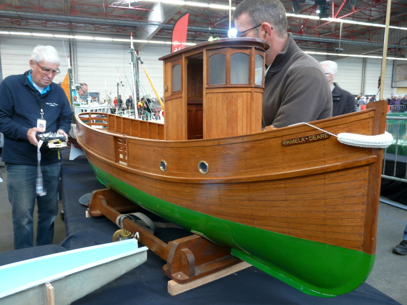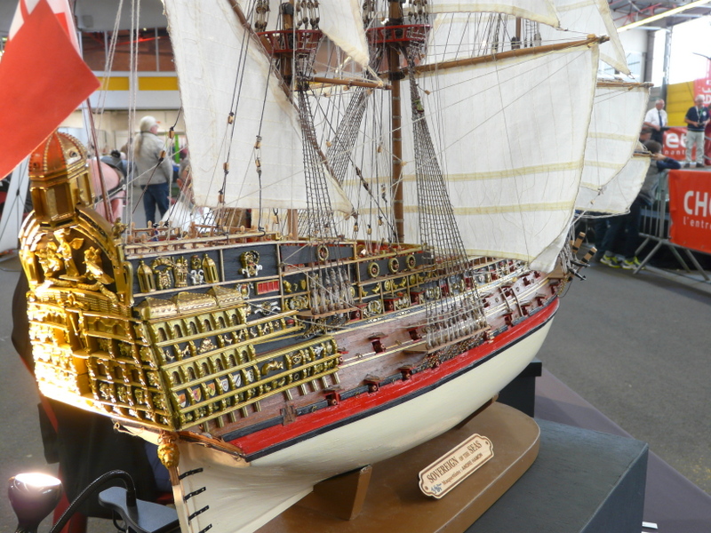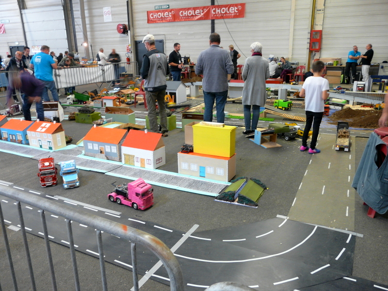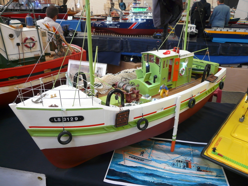 On découvre, en faisant le tour des stands, des merveilles. Une m’interpelle principalement. Un stand de tracteur agricole que j’avais pris au départ pour des jouets. Après un énième passage, j’entame la discussion avec le modéliste. En fin de compte, tout est fait en carton. Il m’explique qu’il choisit un modèle, un John DEERE par exemple, il en trouve un vrai dans son environnement et il va le mesurer sur toutes les coutures pour en établir les plans à l’échelle !!! Tout est fait en carton et en papier. Cela aurait pu en rester là, c’était déjà pas mal, mais non !!! Tout est motorisé, il a même créé un réducteur de force pour imiter le vrai… Chapeau bas, Monsieur ! (je suis un rigolo avec mes bateaux en plastique).