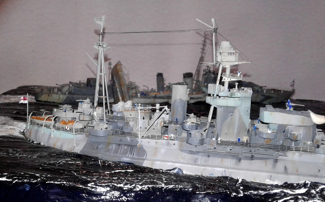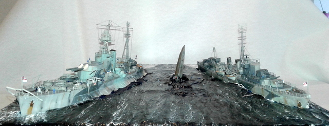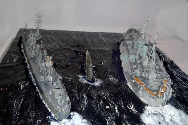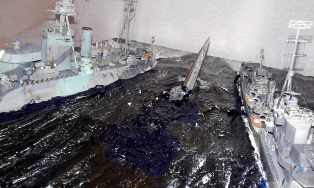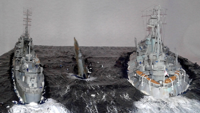 Le diorama se déroule dans la Manche pendant la guerre et montre deux navires anglais qui viennent au secours de l’équipage d’un sous-marin allemand qui est en train de couler…..