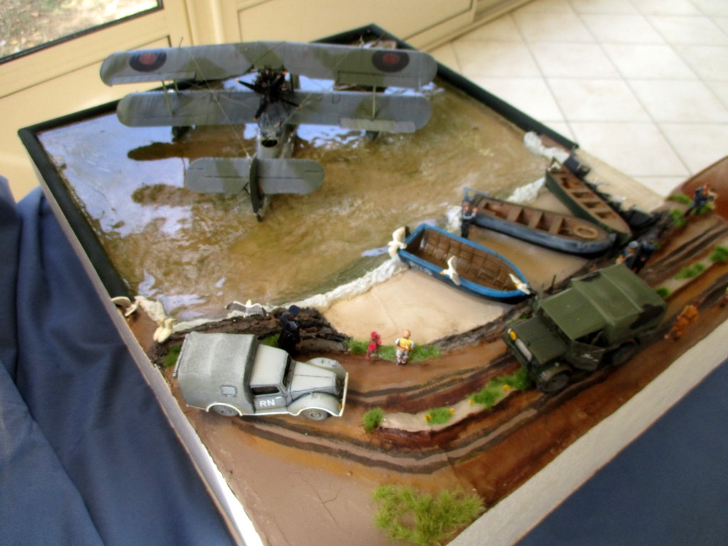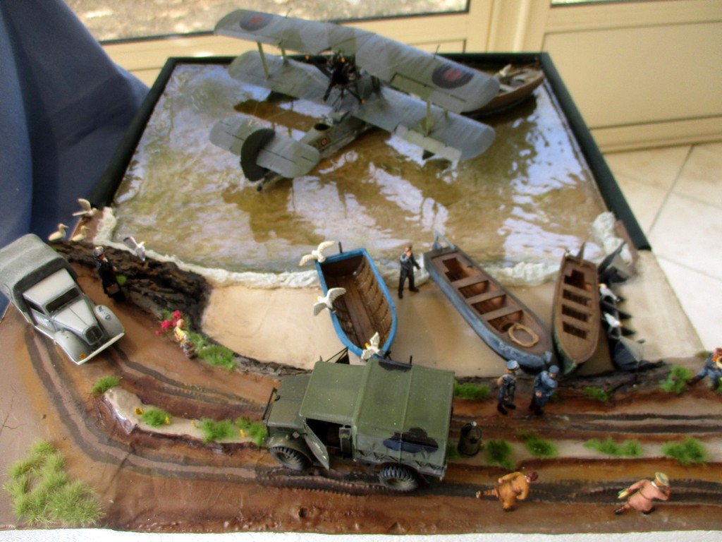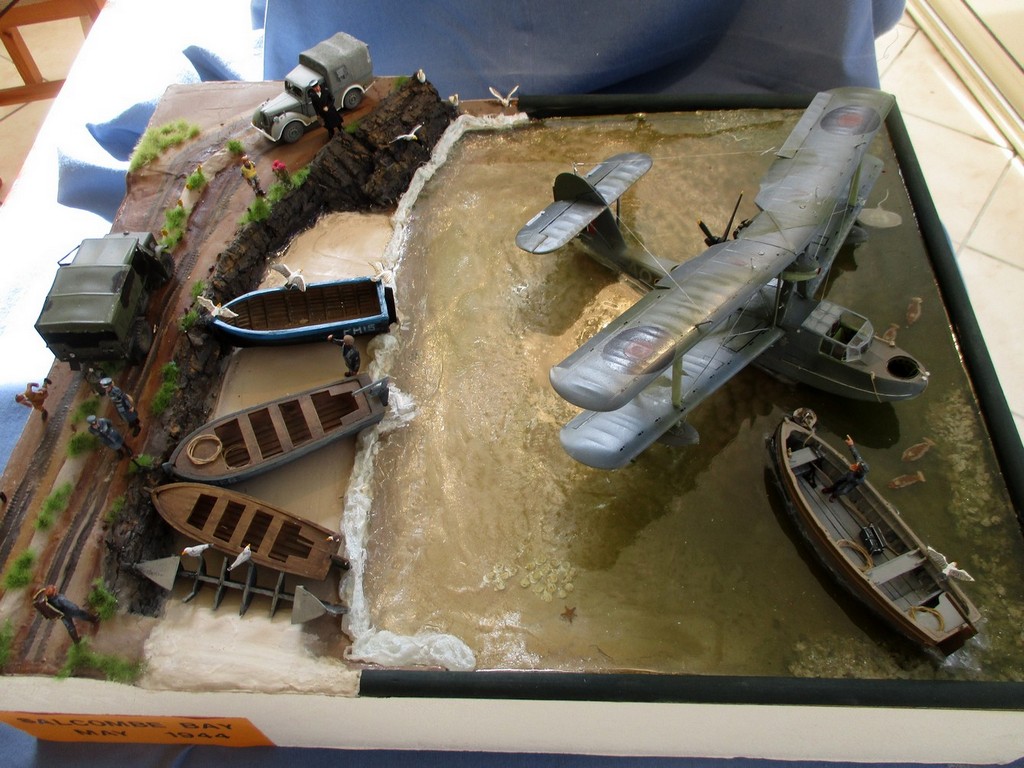 bonjour:::::::::Escadrille de secours en mer ‌Anglaise durant la WW2:::::::::::::Le début de ce service de sauvetage commence à l orée du conflit. 13 vedettes très rapides sont mises en service,dès le début de la guerre. Puis, quelques WESTLAND LYSANDER aident au repérage des pilote ou équipage,tombés en mer, d abord en MANCHE;puis autour de la GRANDE BRETAGNE. A partir de Octobre 1941;le SUPERMARINE WALRUS entre en scène dans le sauvetage en mer,en opérations combinées,avec les LYSANDER et les vedettes rapides.Près de1250 pilotes seront sauvés en mer durant ces 5 années. scenette::le WALRUS provient de chez AIRFIX .Les vehicules sont des kits AIRFIX et DES kits. Les figurines et décor sont de marques diverses . Ce ST BERNARD des mers se situe dans la baie de SALCOMBE dans le DEVON.