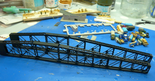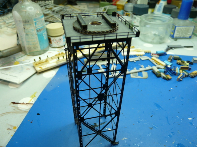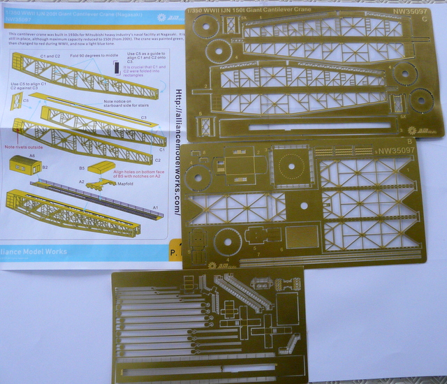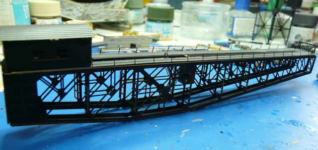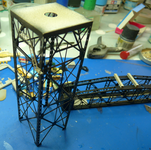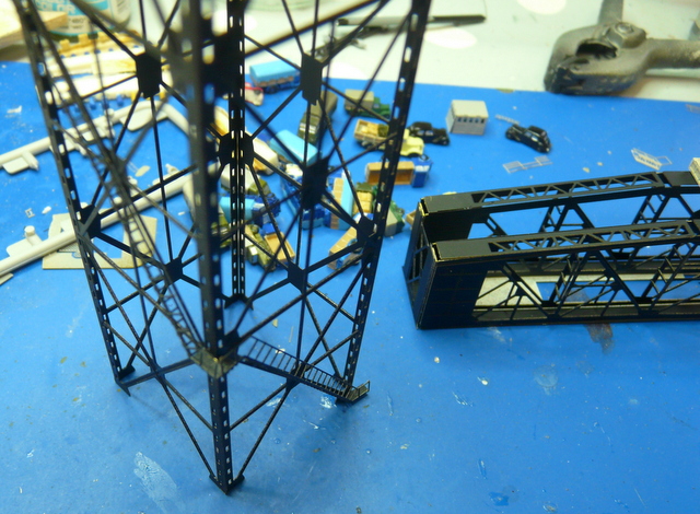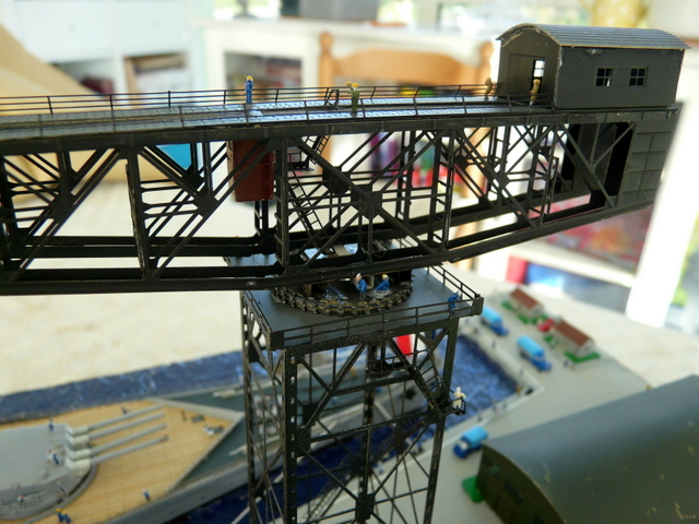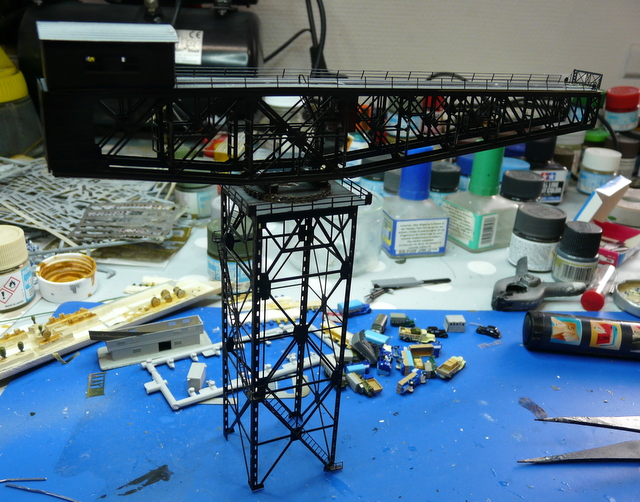 Enfin, la poste me livre la grue tant attendue. Super emballage indestructible, fébrilement, j’ouvre mon paquet. Dans un sachet plastique, 3 grappes de pièces en photodec, de la marque ALLIANCE MODEL WORK, ça n’a pas l’air mal du tout. Un format A4 fait office de plan de montage et là…….Scrongneugneu……je me rends compte qu’il manque la moitié du plan. Réclamation au pays fort fort lointain où je demande simplement au vendeur de m’envoyer copie du plan manquant par mail……..et j’attends….Très peu, car je me mets à le rechercher sur le net et comme l’on trouve tout sur le net, je mets la main sur la page 2 manquante que j’imprime. Je pense que j’ai dû recevoir par mail la page manquante, mais recevant trop d’arnaque, je n’ouvre pas les mails d’origine bizarre. Apprêtage en blanc mat puis couche de noir mat uniforme. Tout de suite, on constate que ce modèle ramène la même grue en ABS précédemment découverte aux oubliettes. Le montage est facile, enfin relativement facile, car le plan n’est pas très explicite, voir pas du tout, d’ailleurs c’est marqué dessus, qu’il faut trouver de la doc. Pas de problème, j’en trouve. Je ralentis sur le montage de l’escalier qui permet de monter tout en haut, je ne sais pas où il va. A force de recherche et l’avis de ma charmante épouse, je constate que cet escalier est à coller à l’extérieur. Elle a de la gueule cette grue, mais problème, elle est lourde avec sa photodec très épaisse. Nouveau problème en vue, l’implanter dans le quai en polystyrène ? Avec son poids et son peu d’accroche, cela ne tiendra jamais. J’ai collé à chaque pied , une tige de ferraille que j’ai enfoncée profondément avec de la cyano dans le polystyrène. Pour l’instant, cela tient. On verra dans l’avenir après un voyage dans une future expo. Le tout est peint en noir satiné, (HELLER 85). Quelques notes de couleurs sont rajoutées avec les toits des cabines en gris.