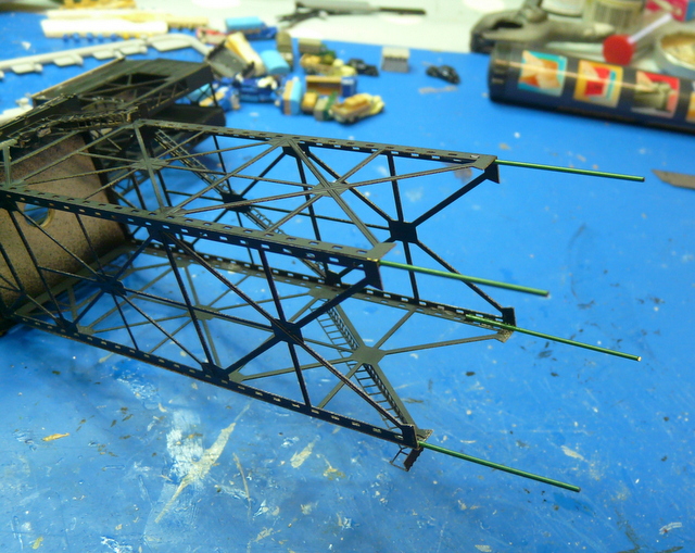 Arrivé à ce stade, il est très difficile d’accéder au quai central sans toucher ou accrocher les matures des navires. Zut ! Je n’y ai pas pensé à temps. Ma bonne idée a été d’incliner fortement le dio. Et paf ! La potence de ma grue est tombée, le collage n’a pas tenu. Recollée, la même mésaventure m’est arrivée une deuxième fois. Srongneugneu de scrongneugueu………..J’ai tenté un collage à l’ARALDITE LENTE, trop lente pour un résultat merdique, j’ai fini par tout bourrer à la cyano……….. ALEA JACTA EST !!!!!!!!!!!!!