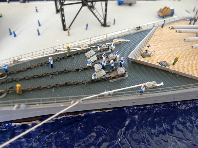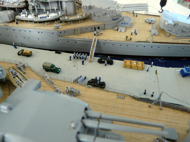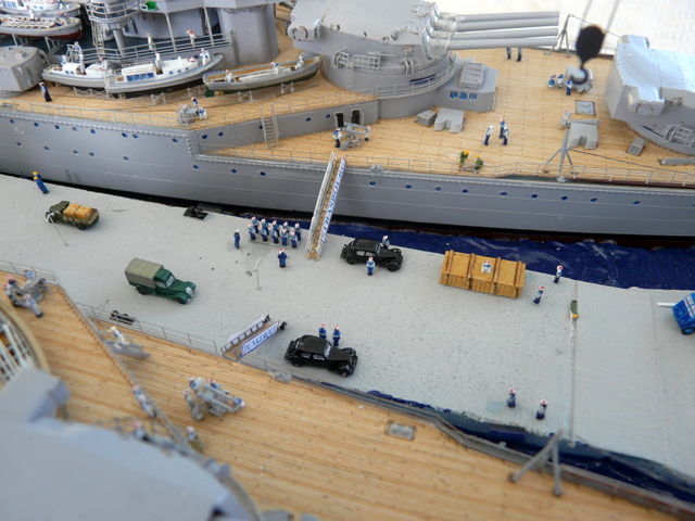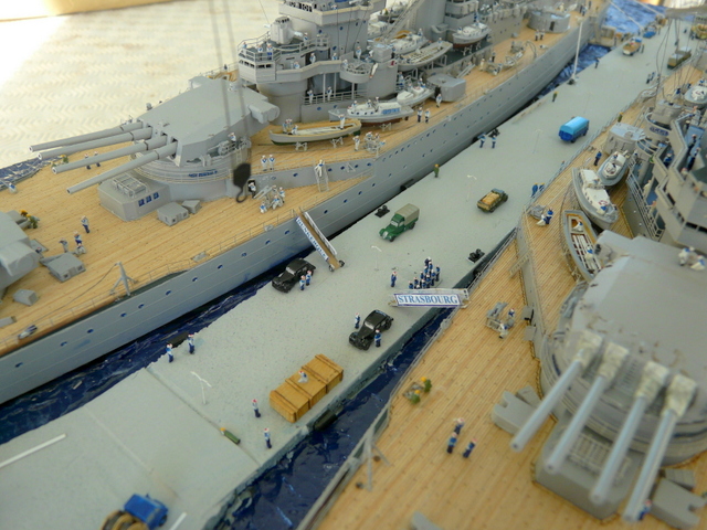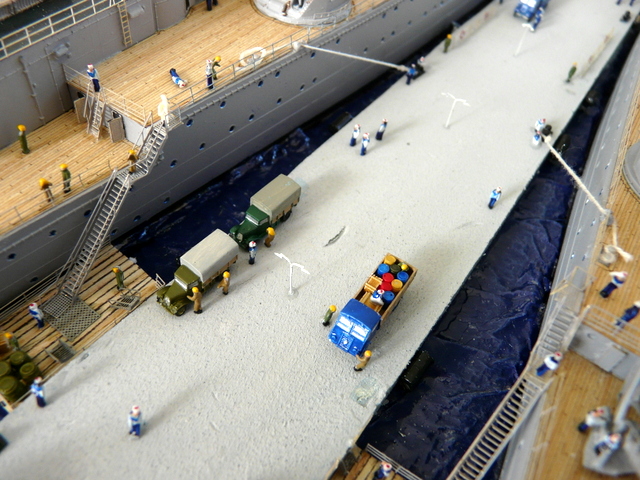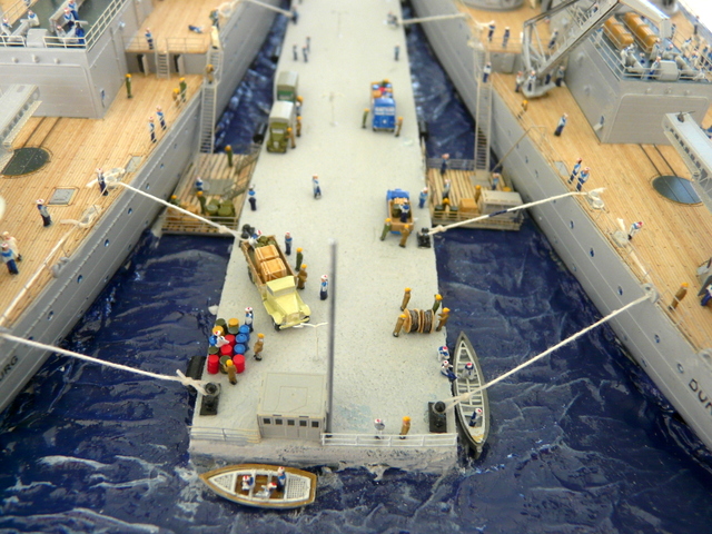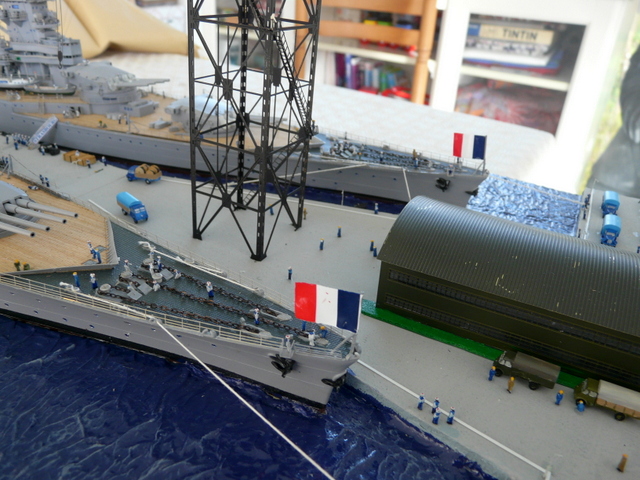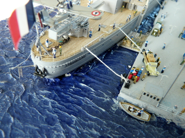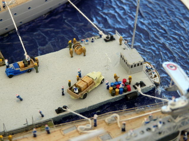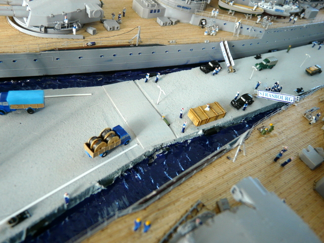J’ai réussi à meubler le quai central avec des véhicules, des marins et des ouvriers. Deux belles échelles de coupée avec les noms des navires sont posées à l’avant et sur le quai. Deux belles tractions noires brillantes attendent de part et d’autre une autorité.