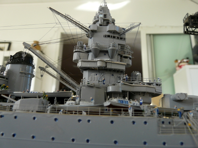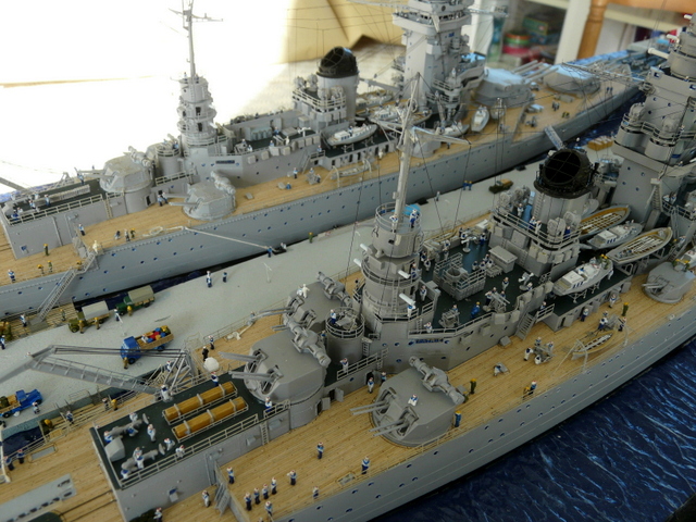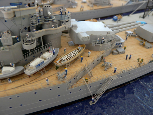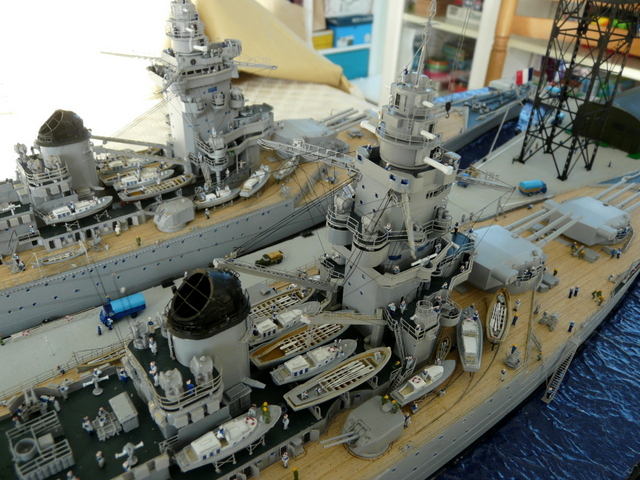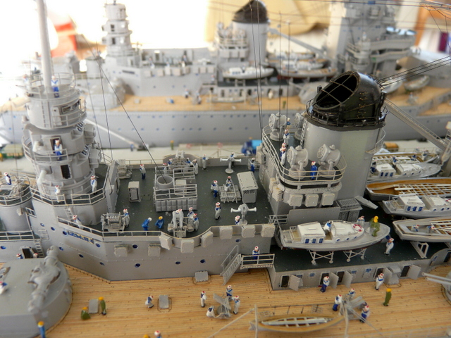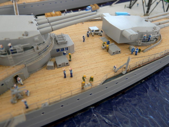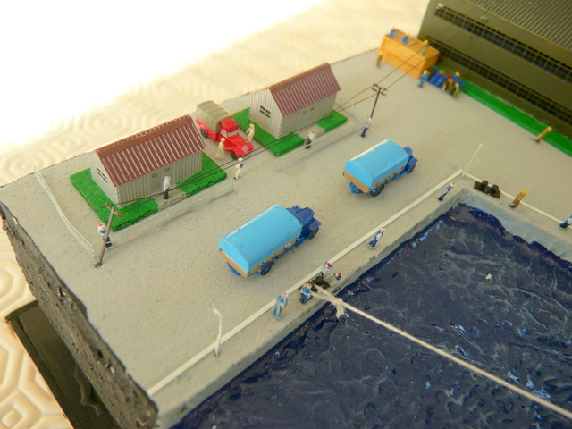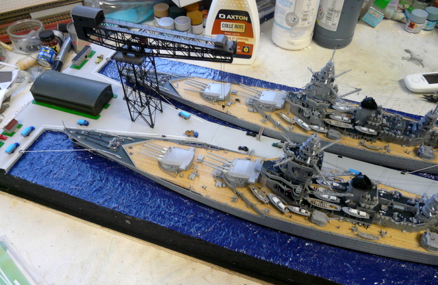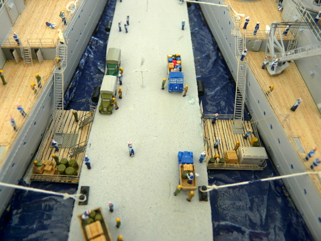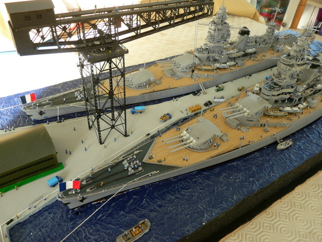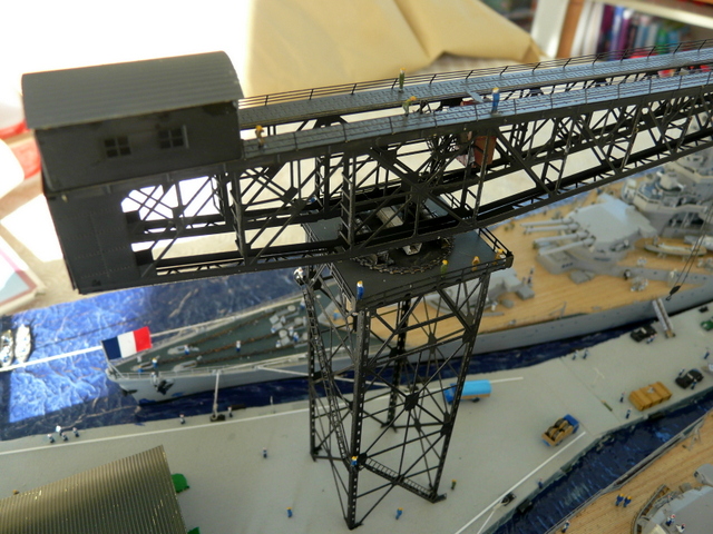 J’ai réussi à meubler le quai central avec des véhicules, des marins et des ouvriers. Deux belles échelles de coupée avec les noms des navires sont posées à l’avant et sur le quai. Deux belles tractions noires brillantes attendent de part et d’autre une autorité.