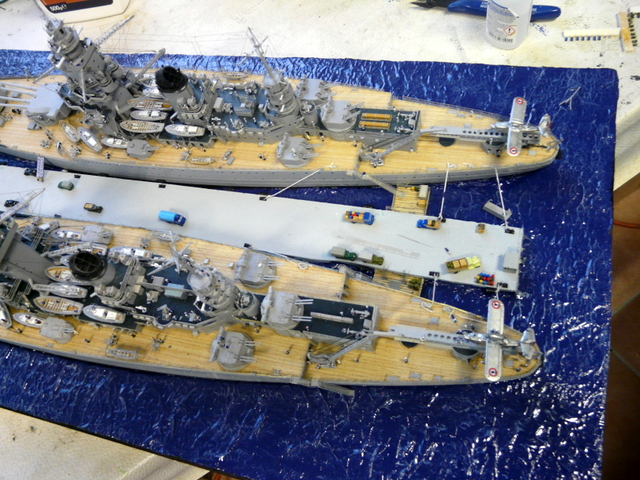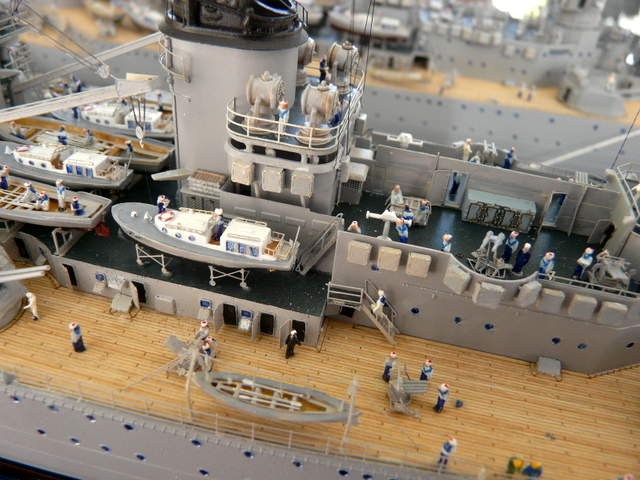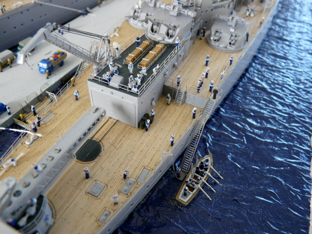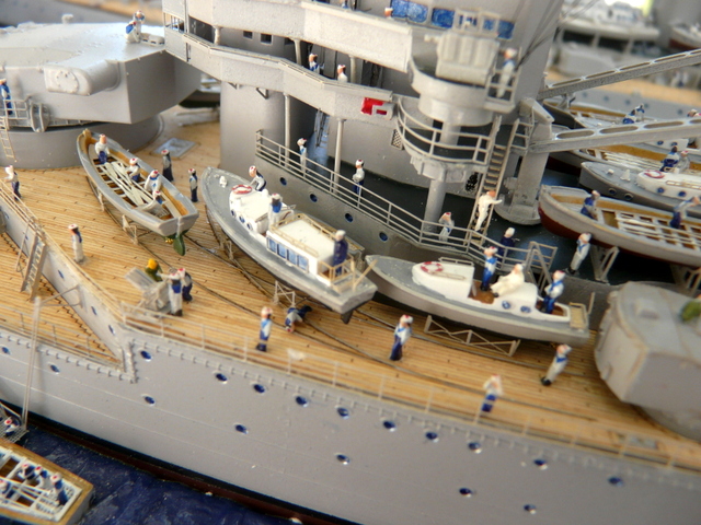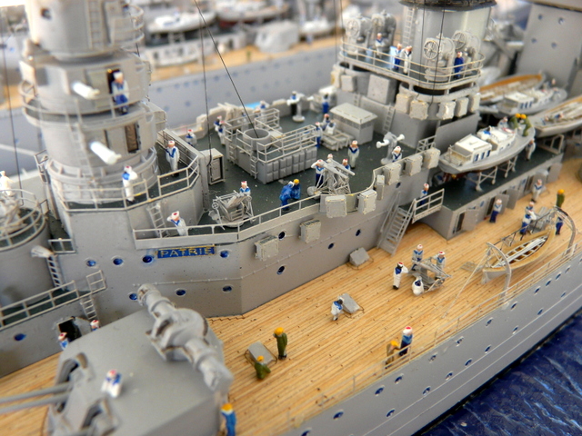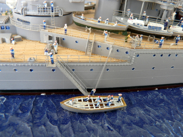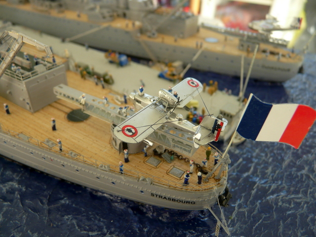 Un deuxième ponton est fabriqué pour le STRASBOURG . Des canots à rame sont piochés dans la boîte à rabiot et peints. Agrémentés de marin, ils sont mis en situation. Une très belle péniche de débarquement BLACK CAT MODELS est chargée de caisses et de marins. Pas de mitrailleuse dessus, nous sommes en temps de paix.