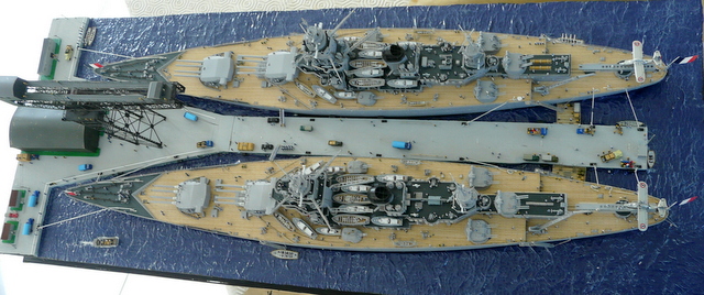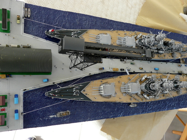 Mon diorama ressemble bien à ce que j’avais imaginé au départ. Et comme, je le dis souvent, le plus dur pour moi est de terminer le projet, vous savez quand il ne reste plus grand chose à faire, mais que cela vous saoule d’avance avec l’envie de passer à autre chose. Alors !!! Un moment, j’ai dit STOP. Je rappelle que mon but était de présenter ces deux navires l’un à côté de l’autre et parfaitement visible des deux côtés et sur le dessus. N’y chercher pas un port existant ou une réalité historique, mon décor est purement fantaisiste et ne sert qu’à la présentation des deux navires sur une surface raisonnable. Les puristes pourront me jeter la pierre en me disant que c’est totalement fantaisiste, que la grue ne sera pas fonctionnelle, etc……………..Mais je m’en fiche, je me suis fait plaisir et puis c’est tout. Ce chantier aura duré une bonne année.