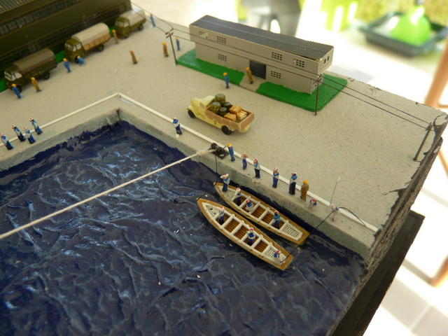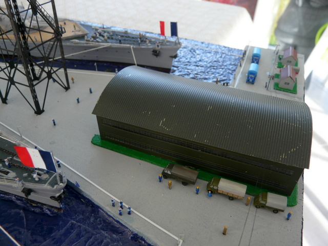 De l’autre côté du hangar, on trouve, une réserve de carburant avec des fûts 200 litres ARSENAL et une grosse caisse en bois ( j’avais pris aussi les caisses bois chez ARSENAL, des petites et des grosses, mais les grosses sont vraiment très, trop grosses). Dans cette zone de stockage, pas mal d’ouvrier s’activent. Deux camions de la marine passent devant l’infirmerie, carrosserie bleu roi et bâche bleu clair. Des marins déambulent le long du quai. Pour faire un semblant de trottoir, j’ai utilisé une fine baguette EVERGREN pour faire une délimitation.