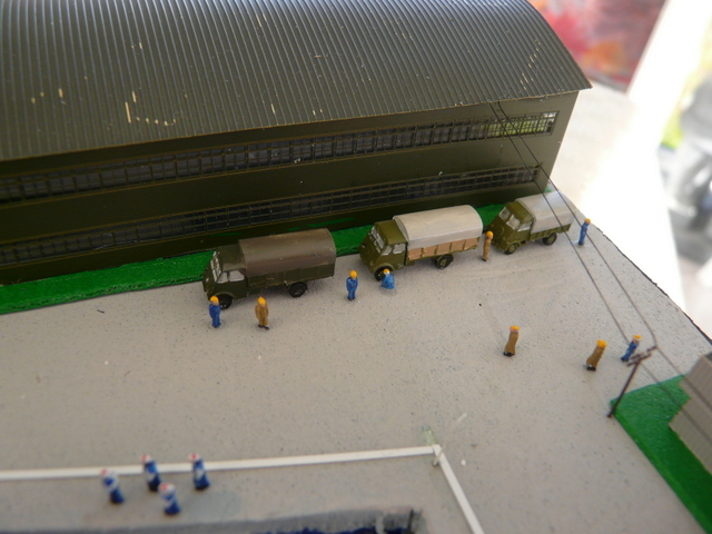 Avec les petites caisses ARSENAL, j’ai rempli les camions. Au bout, trouvé dans la boîte à rabiot, un petit parallélépipède plastique auquel j’ai rajouté porte et fenêtres (rabiot photodec), il fera office de bureau. Un mat jouxte ce bureau. Des fûts de 200 litres multicolores constituent un dépôt de carburant.