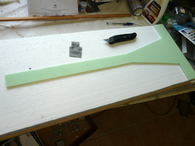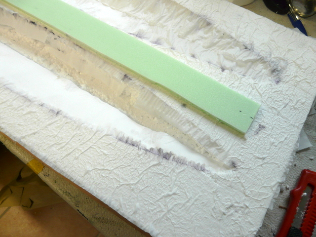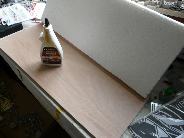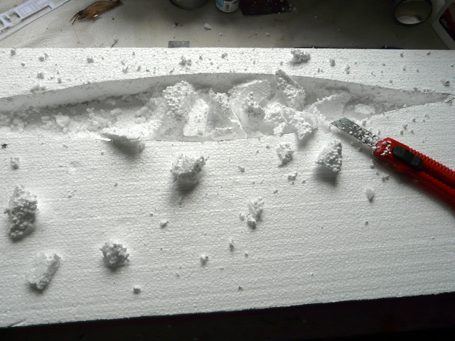Mon dio fera 75 cm par 30 cm, un record de gain de place pour ces deux navires. Découpe du fond, dans une planche de contreplaqué 10 mm, de 76 par 31 pour prévoir la vitrine. Taille du polystyrène de 75 cm par 30 cm dans un morceau de 30 mm d’épaisseur plus une couche de 10 mm. J’aime bien que mes fonds aient de l’épaisseur de façon à ce que le bateau ne semble pas posé à plat sur la table.A l’aide du patron, je découpe mon quai dans des feuilles 5 mm de plaque HEKY, (modélisme ferroviaire) …………….que je colle à leur place. Et je creuse l’emplacement de chaque navire. Quelques essais délicats et les souilles sont enfin prêtes.