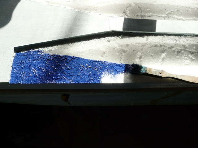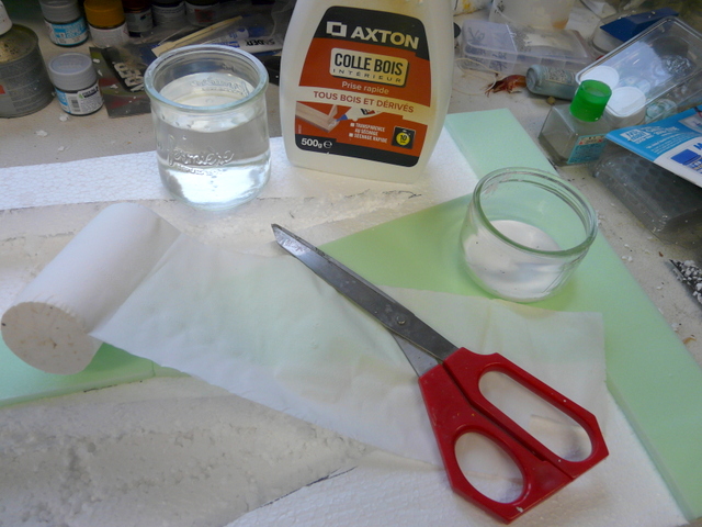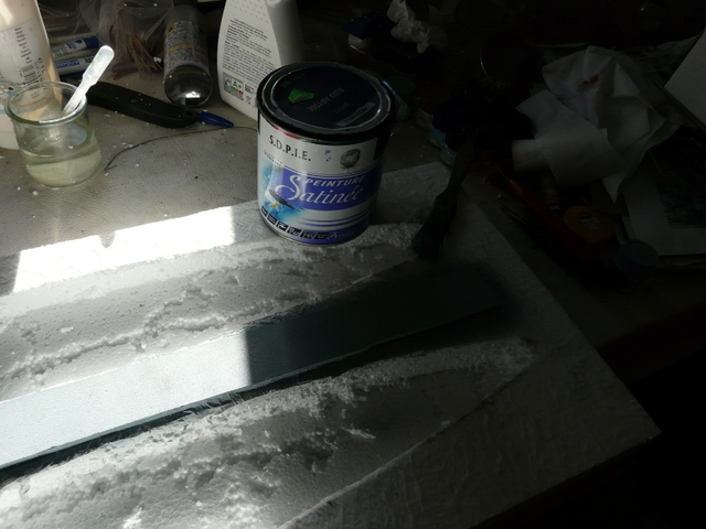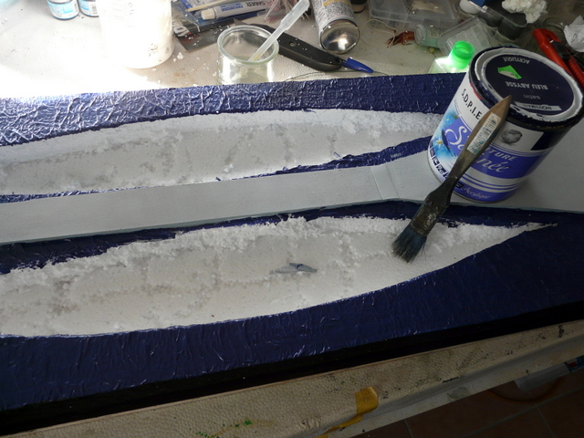 Fabrication des vagues avec toujours la même technique, papier WC blanc de la pire qualité, colle à bois diluée à l’eau. Je ne reviens par sur cette technique dont on a déjà parlé 100 fois. A noter qu’il faudra deux couches sur deux jours, pour faire disparaître l’aspect granuleux du polystyrène. Ensuite, peinture de la mer en bleu…..Mon vieux pot et un gros pinceau, il faudra deux couches, le papier « ouaoua » étant comme vous le savez, très absorbant.