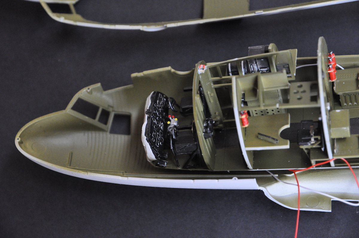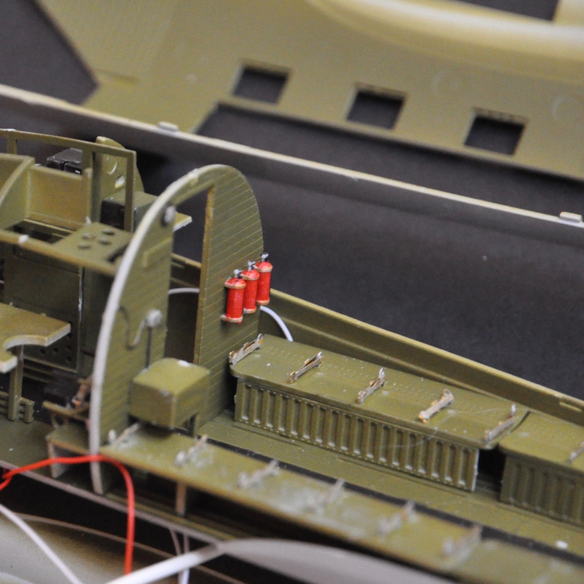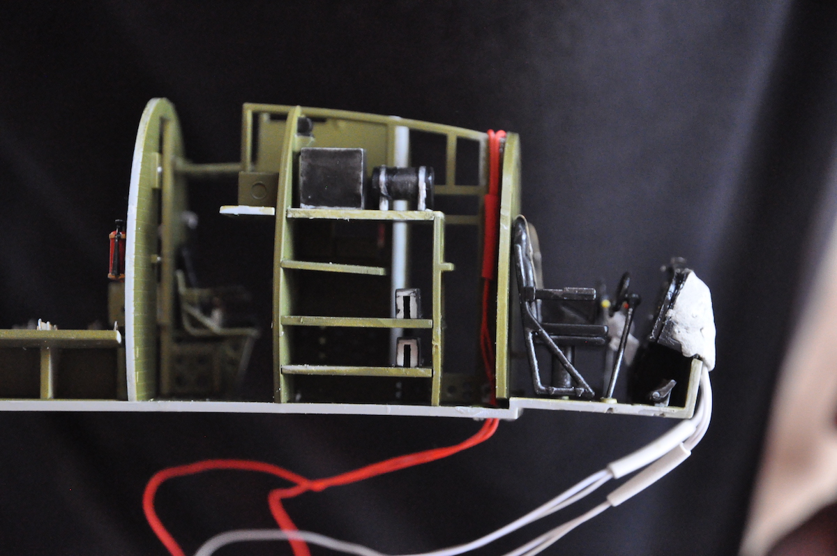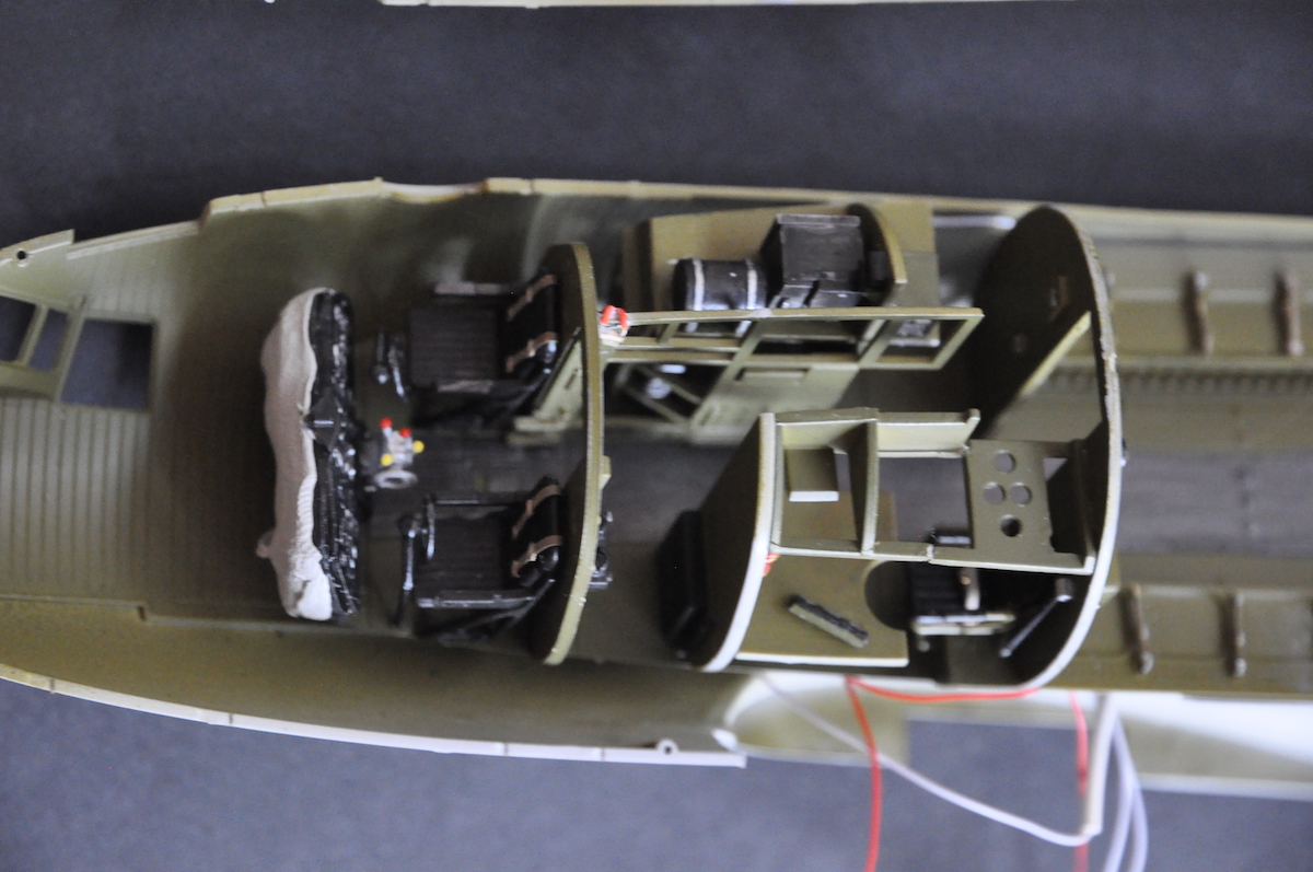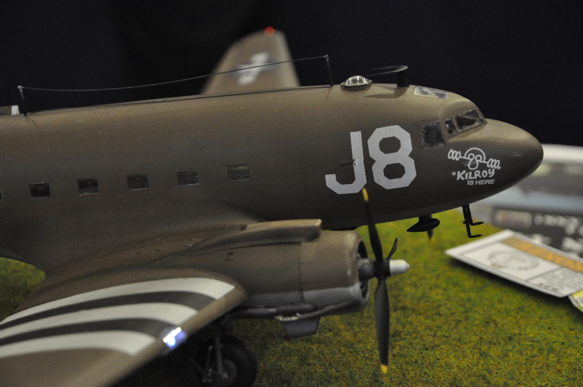 Au 1:48, elle date de 2008. Neil y tenait. Il le reçut un peu en avance de Noël 2017. 2018 allait être l’année de sa construction. Il y eut des échanges entre Thierry et Neil, qui étaient très décidés à éclairer la bête. Au montage, plastique et photo découpes, de l’intérieur, qui lui prit pas mal de temps, il avait décidé d’en faire un écorché sur un côté de l’avion, pour laisser visible, cockpit et aménagements. Deux fenêtres orthogonales ( comme des découpes de pièces de la carlingue) montrent l’intérieur éclairé par une légère lumière bleue. Les feux de position, en Leds, sont aussi éclairés. La décoration choisie est celle d’un appareil engagé dans l’opération Market Garden, au-dessus des Pays-Bas. Les bandes d’invasion, apparues en juin pour le débarquement en Normandie, étaient conservées.