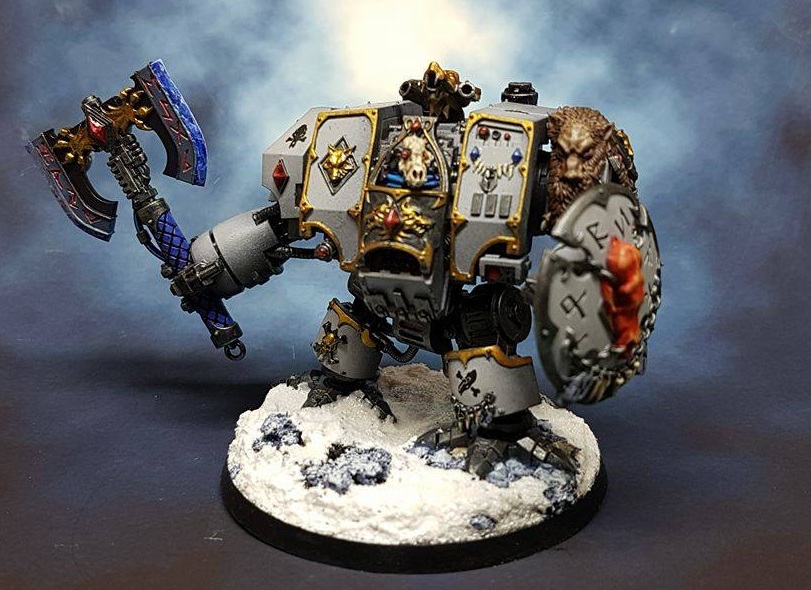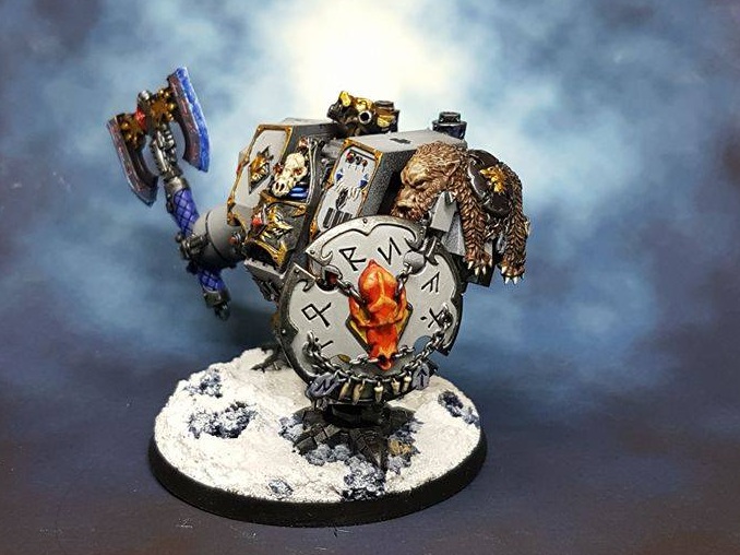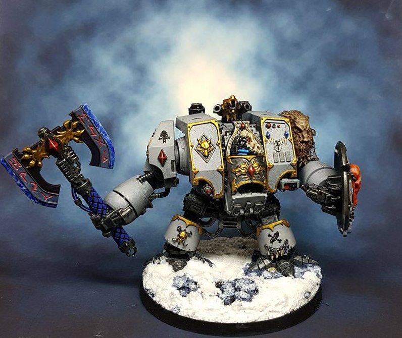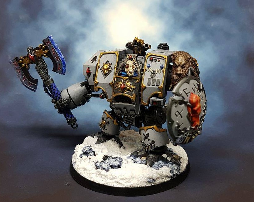 Mon Dreadnought vénérable est un lié aux space wolves, la faction de space marines de mon armée. Il est équipé de la grande hache de Fenris et d’un bouclier blizzard. Réveillé par sur les ordres de Logan Grimnar, il est fin près a en découdre avec les Xénos et en particulier les Thousand son la Némésis de mon chapitre.