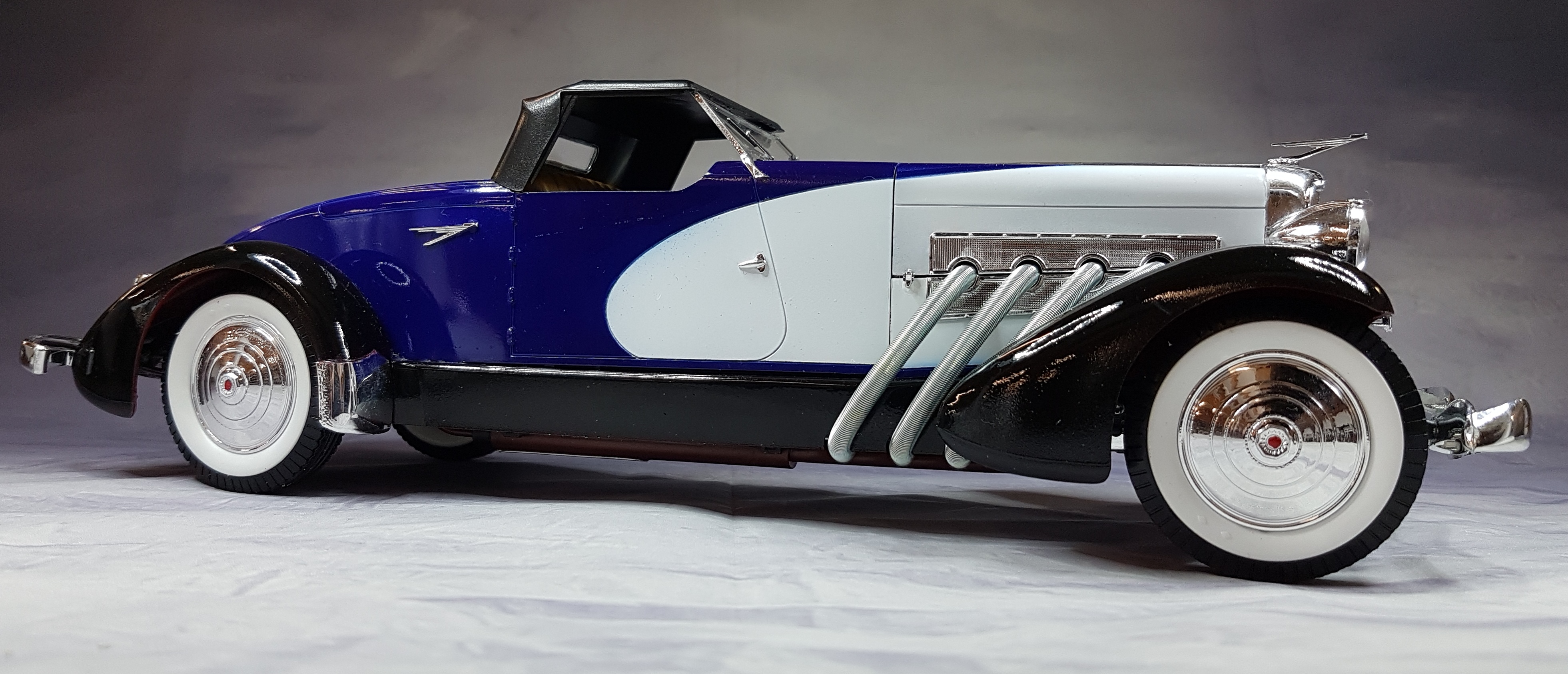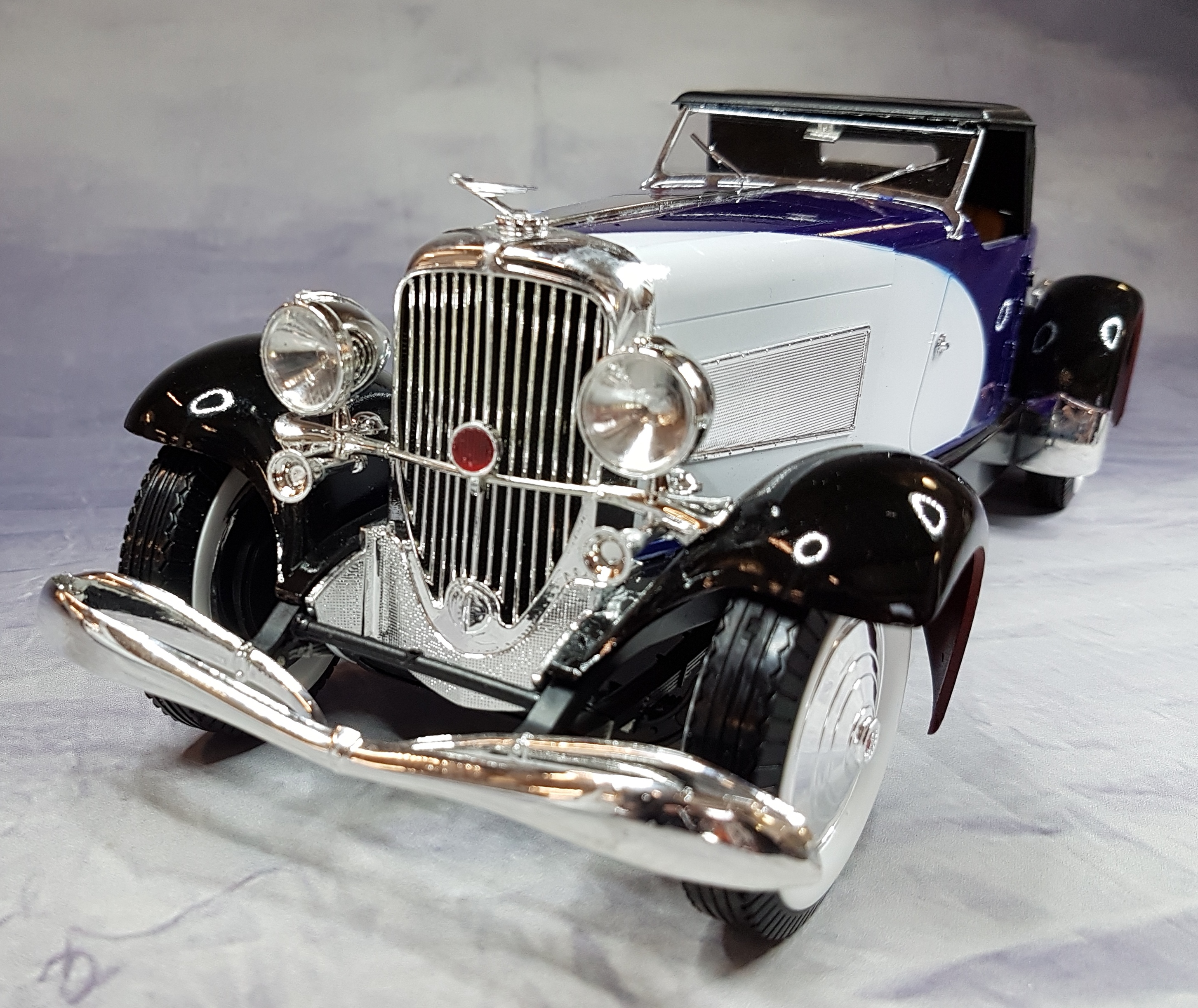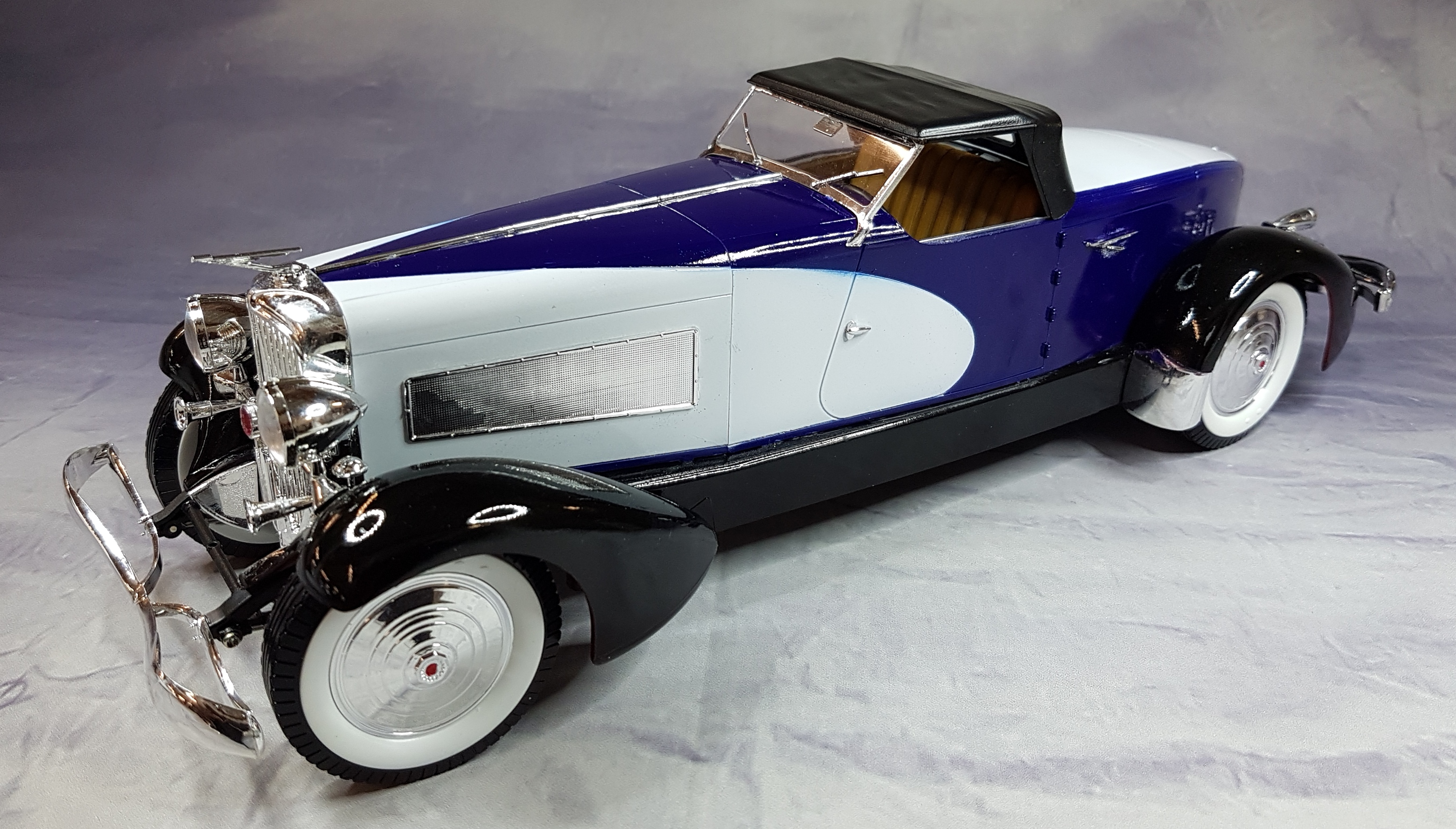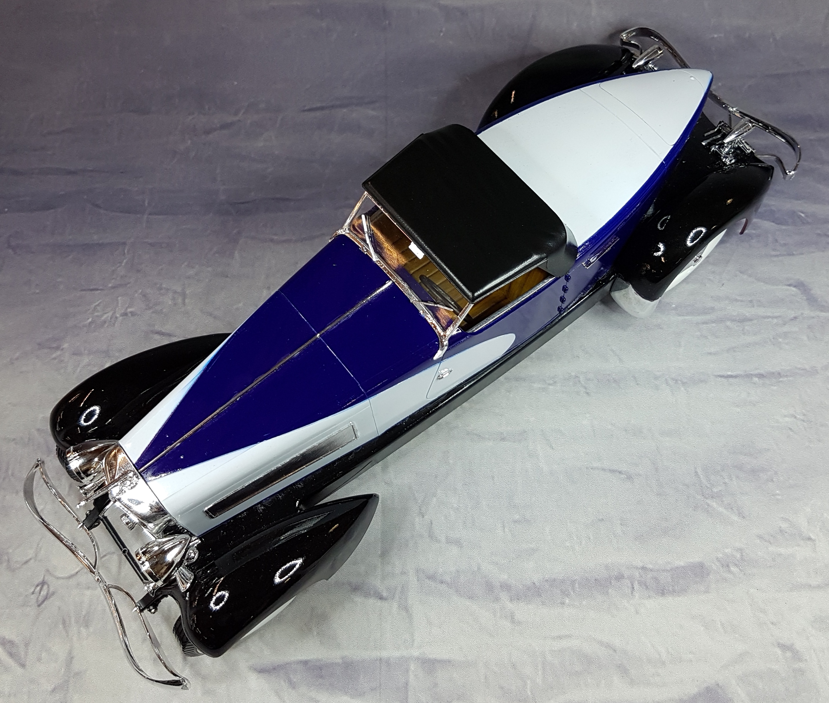 En attendant de recevoir ma boite de photodec de la part de LUCKY, pour commencer mon IJN KAGA, j’ai flirté sur ebay, rayon maquette, le plus grand magasin de maquettes d’occases de France et de Navarre. Amateur de grosses voitures au 1/16, elles sont rares et souvent hors de prix, pas loin d’une centaine d’euros et sans compter les frais de port. J’ai été attiré par une annonce pour une DUESENBERG 1933 au 1/16 BANDAI neuve, enchère en cours 30 euros. Je l’ai mise dans mes favoris et à l’heure de fin de transaction, aux toutes dernières secondes, j’ai misé et remporté la bête pour 30 euros et quelques centimes. Le colis est arrivé nickel et super neuf conforme aux indications.