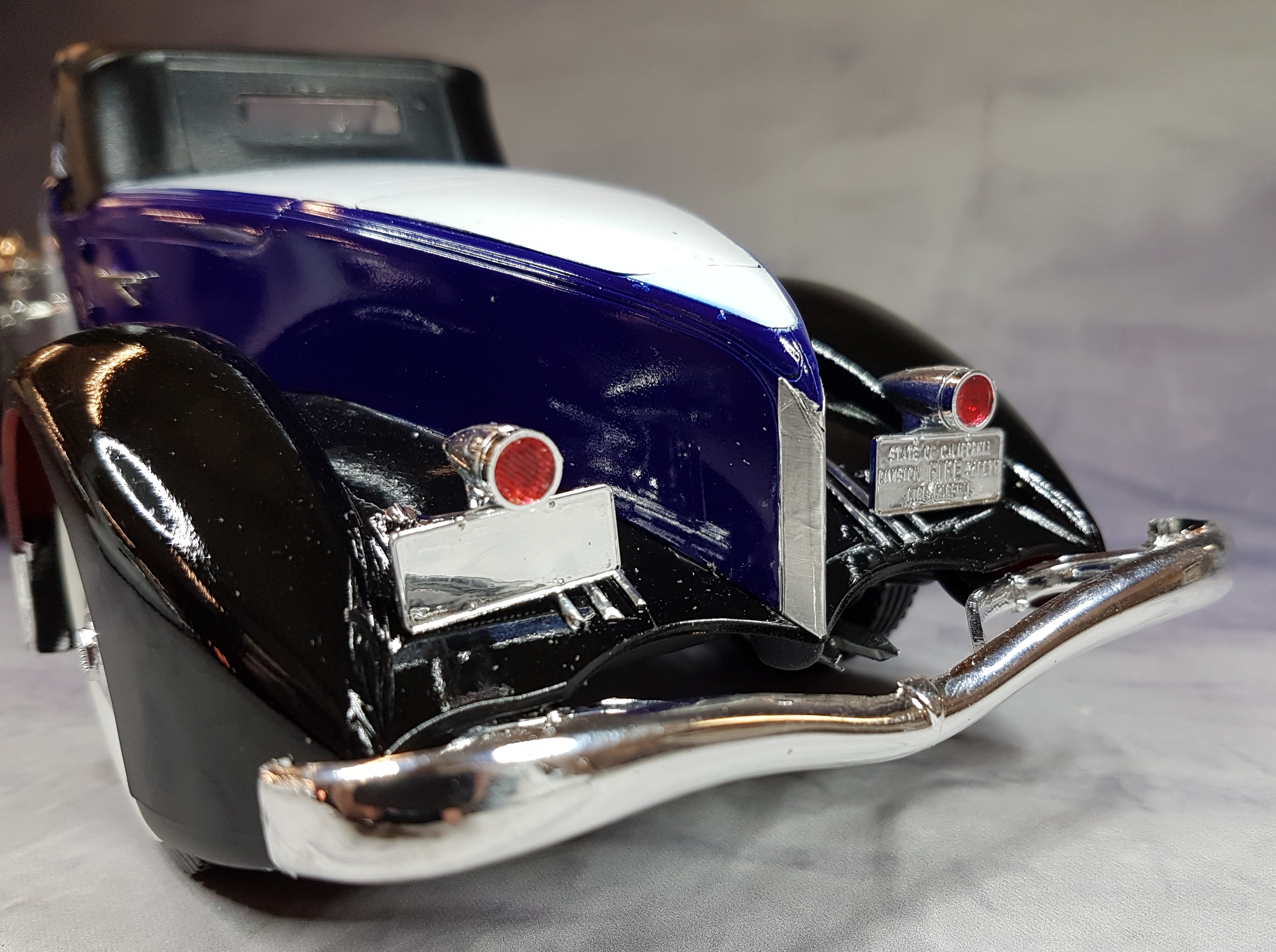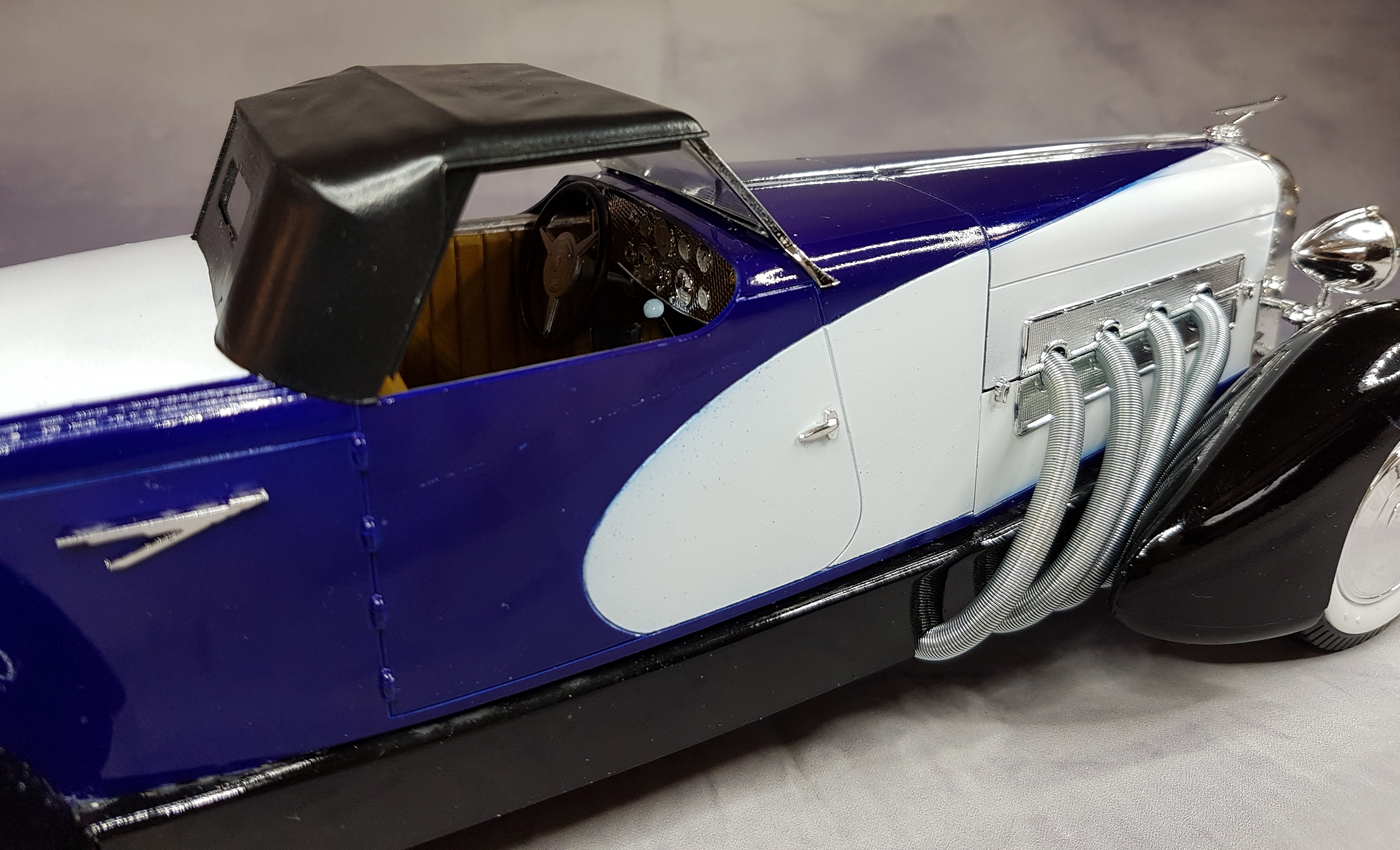 L’opération délicate, va consister à la pose de la carrosserie sur le châssis. Entre temps la sellerie a été traitée comme précédemment , ( peinture couleur voile GUNZE et patine à l’huile, terre de sienne). Si je mets la carrosserie bien en place, mon bolide ne repose plus que sur trois roues. J’ai du tricher pour y arriver, mais je ne vous dirai pas où. Le reste des pièces chromées se pose sans problème. Cependant, il faudra enlever le chrome des parties à encoller. Les feux rouges sont peints en translucide GUNZE . La plupart des pièces sensibles seront collées à la colle blanche TAMIYA. La capote sera peinte en noir satiné HELLER 85. Une fois terminée, la capote posée et collée, je me suis rendu compte que j’avais oublier de mettre le volant, ( et ouais ! Incroyable hein!).