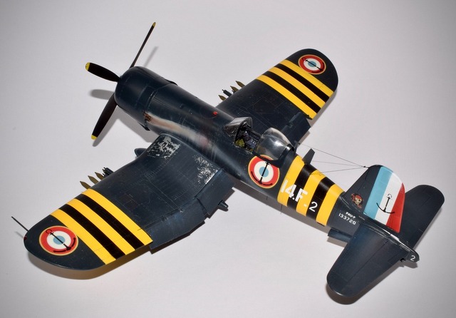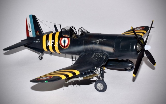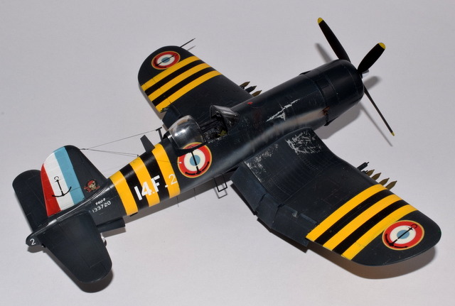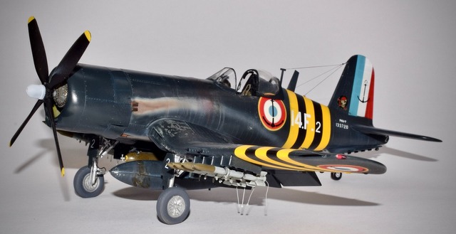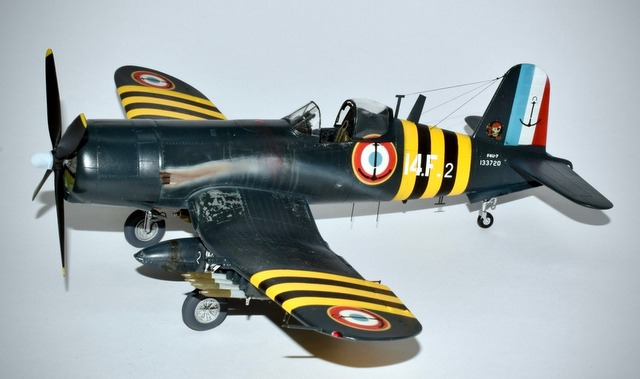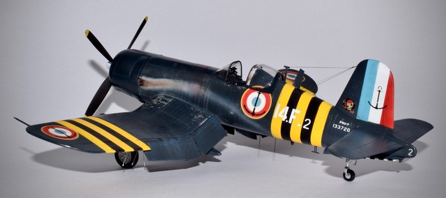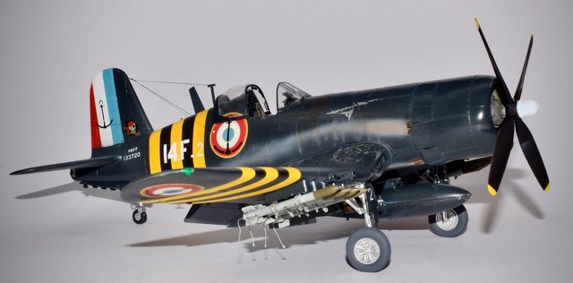 94 de ces appareils furent construits pour l’Aeronavale de début 52 à fin 53. En Octobre 56 ces appareils furent engagés lors de l’opèration « Mousquetaire » en coopération avec les Anglais, pour « libérer » le canal de Suez que Nasser venait de nationaliser. Durant cette opération les avions engagés portaient des bandes jaunes et noires d’identification. C’est un de ces « Corsair » que j’ai représenté. Appartenant à la 14F, »Le Corsaire Borgne », basé sur le’ PA « Arromanches ».