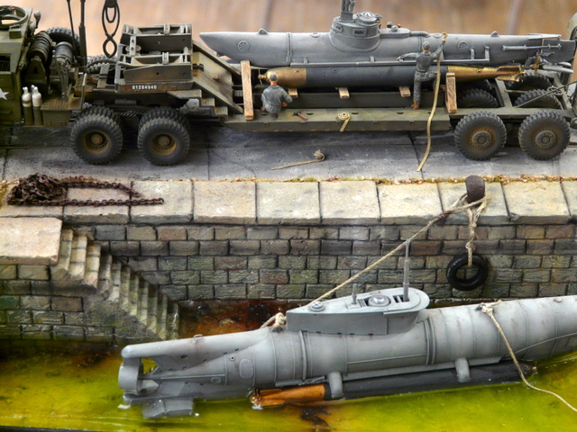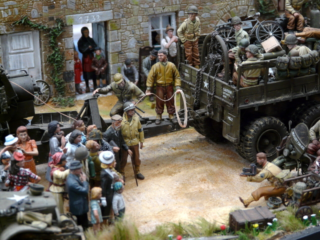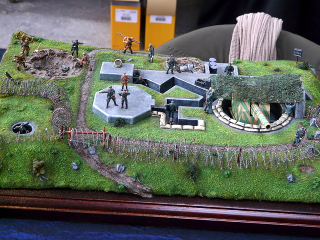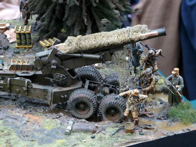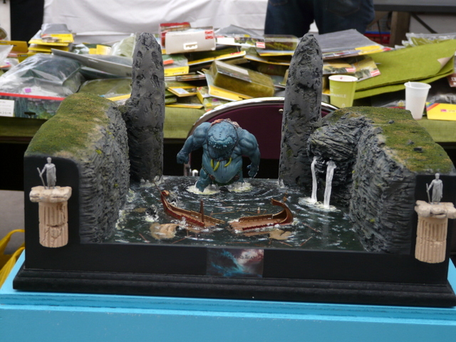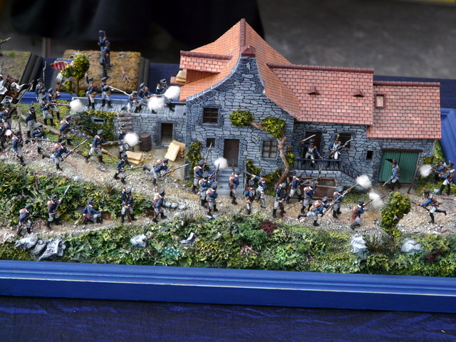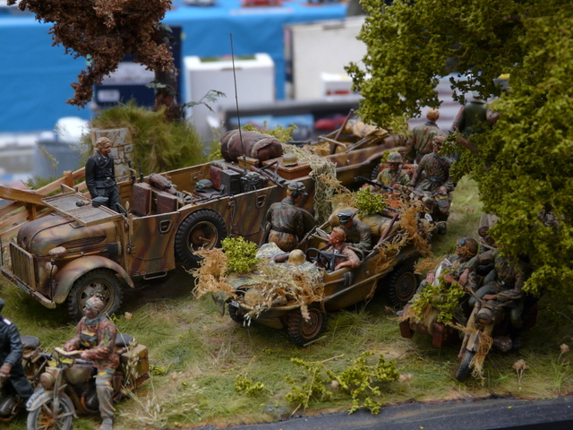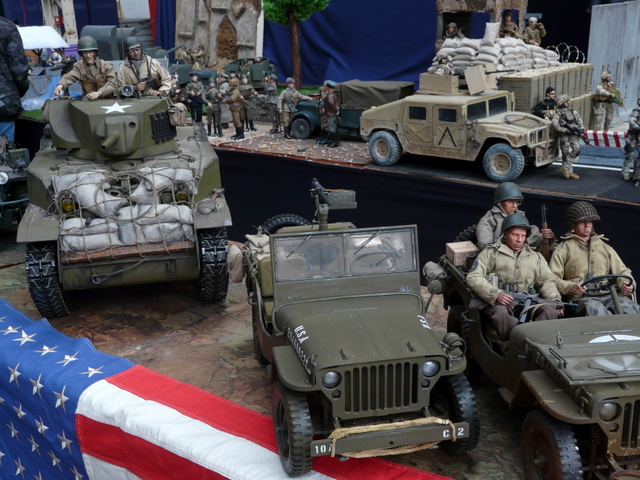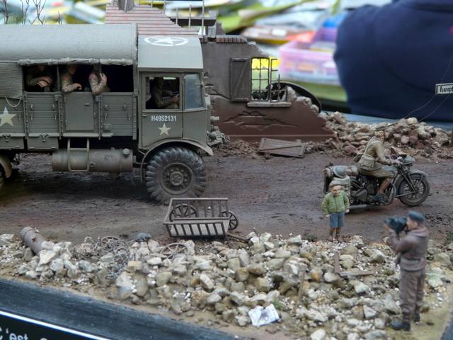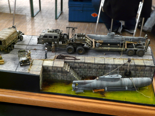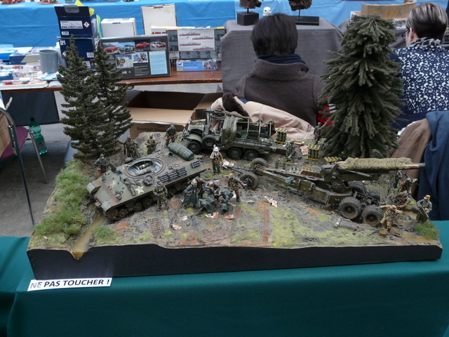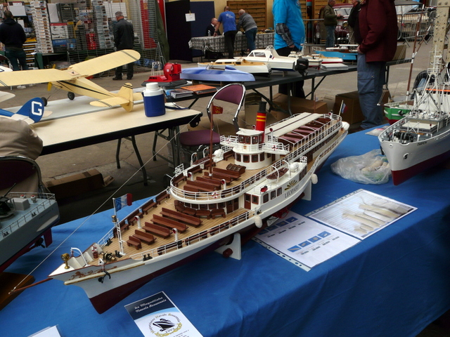 Samedi matin, frais et dispos nous quittons l’hôtel vers 8 h 30, (à 28 mn de la salle). Nous retrouvons le parc des expositions en bordure d’un grand boulevard. Un petit tour par les arrières et un gentil MP Américain nous guide sympathiquement dans la cour, (qu’il en soit remercié pour son accueil et sa gentillesse). Prise de contact avec l’organisation, notre stand de 8 m est tout proche de notre porte d’accès, que du bonheur. Le stand est rapidement monté. Déjà mes deux compères furètent dans les allées. Au café d’accueil nous avons le plaisir de retrouver nos amis Jean Louis et Josette, (merci à eux pour leur accueil et le café) 4000 m2 de salle d’expo, ça ne rigole pas ! Il y a de quoi voir, rencontrer, discuter et c’est ce que nous ferons très très bien tout le WE au gré des retrouvailles avec les copains maquettistes. A notre stand, les bateaux et les figurines à Pierrot ont un grand pouvoir d’attraction, «vous venez d’où ?», «de la Presqu’île de Crozon !». On a l’impression que tout le monde connaît la presqu’île, un souvenir d’école de voile dans l’enfance, un service militaire dans la Marine, etc… Les novices se voient offrir une superbe documentation préparée par l’office du tourisme. La journée se passe très très tranquillement, retour au camp de base.