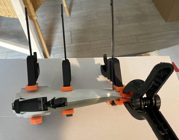 Lors du montage, j’ai pu réutiliser mes serres joints très efficaces pour le maintien du fuselage ! Bon, il faut quand même faire attention à ne pas serrer trop fort au risque de déformer la pièce … During the assembly, I was able to reuse my very effective clamps for maintaining the fuselage! Well, one must still be careful not to squeeze too tightly at the risk of distorting the part …