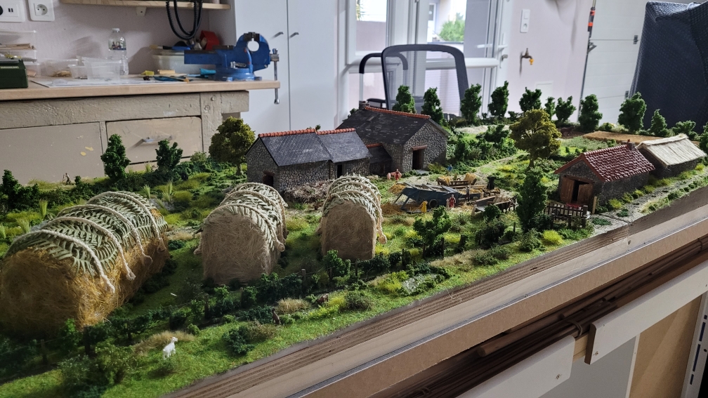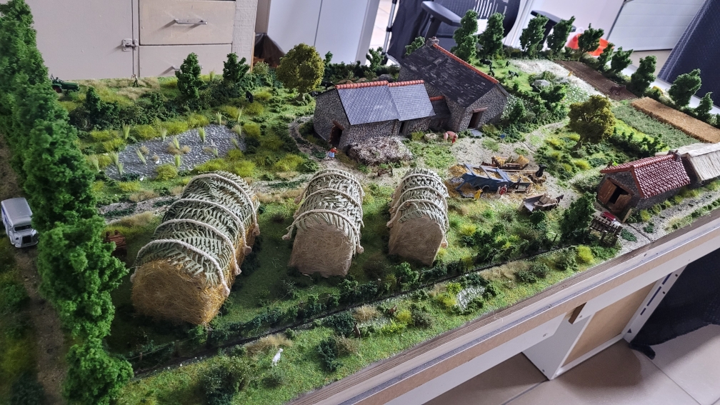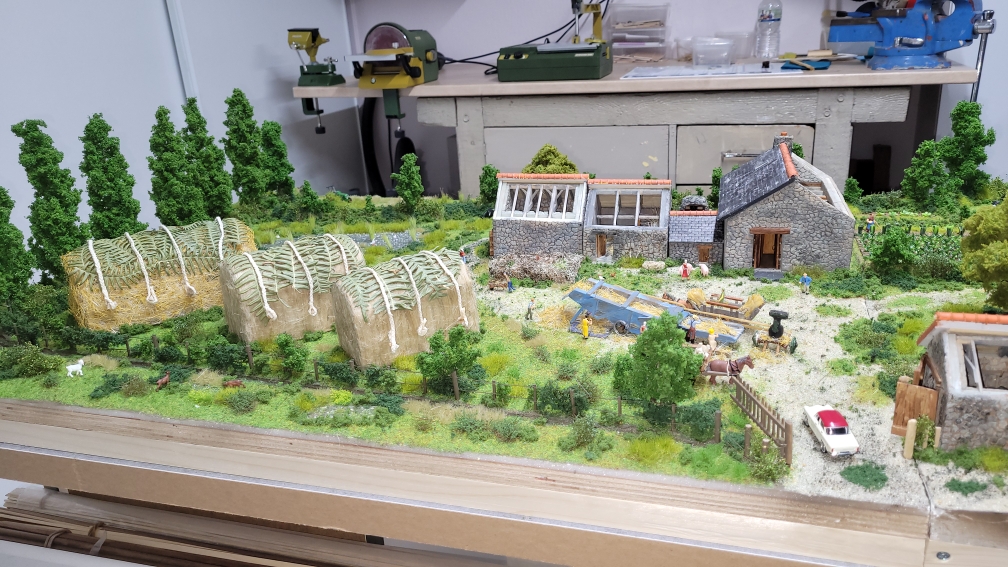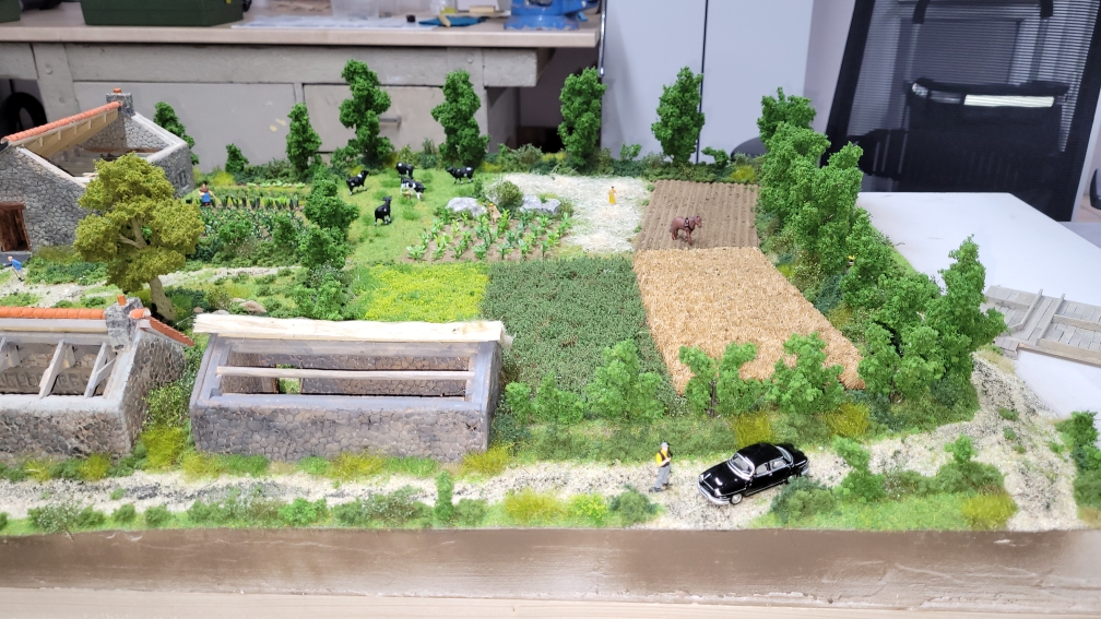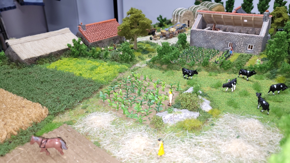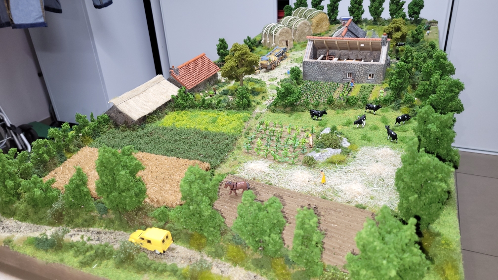Le champ attenant. Dans le champ, j’ai voulu montrer les différentes cultures. C’était déjà la répartition agraire qui était pratiquée. Dans chaque champ, le cultivateur le divisait selon ses besoins pour une rotation des cultures. De nos jours on n’a rien inventé. Dans cette représentation, j’ai une parcelle de blé, de colza, de luzerne et de choux pour les animaux. Une autre partie représente les prés pour les vaches. Le ramassage du foin se faisait à la main.