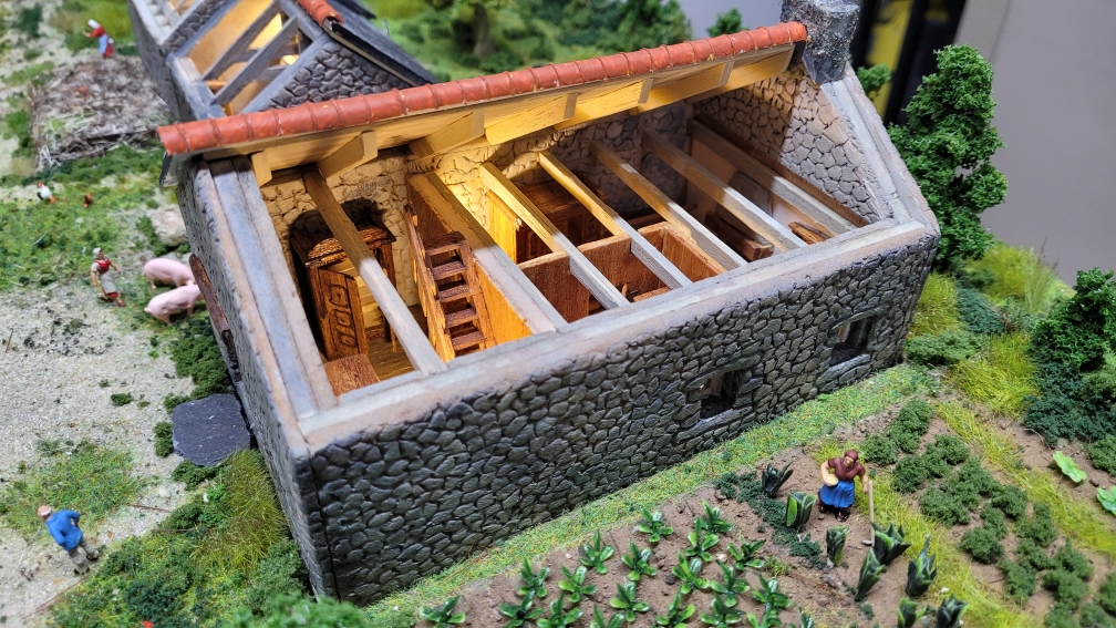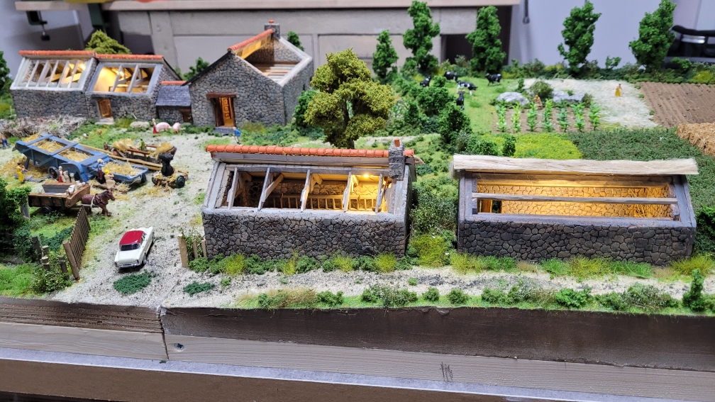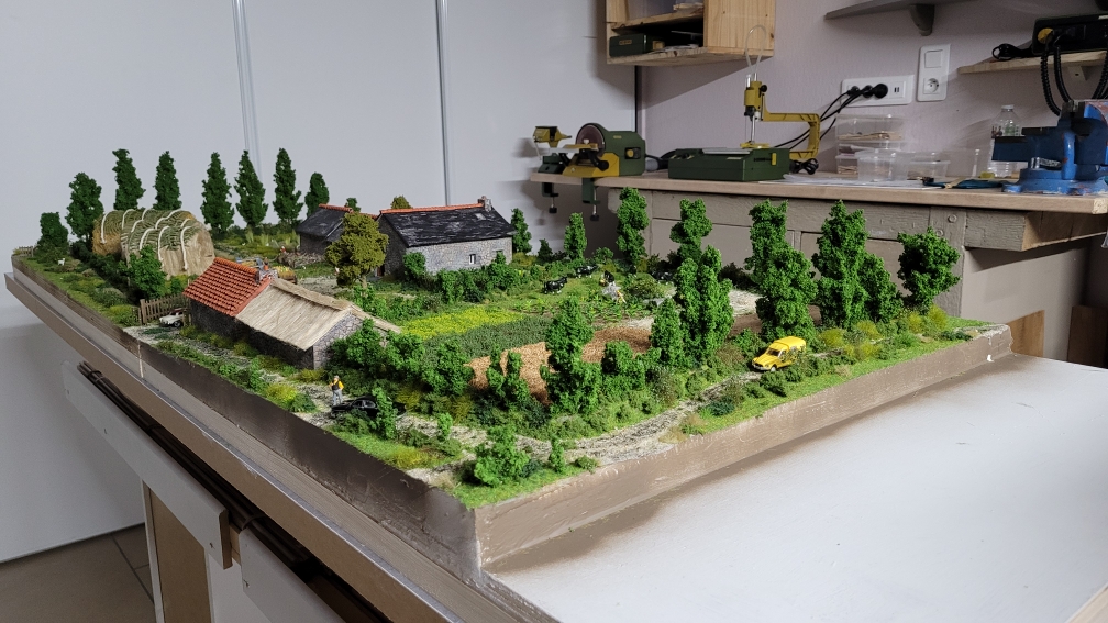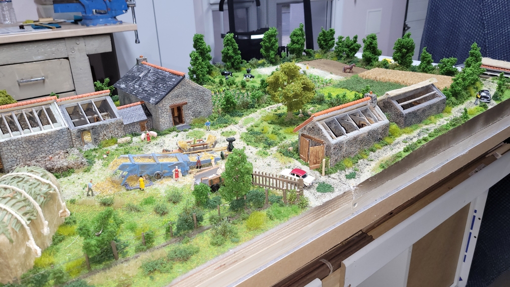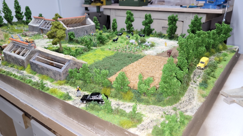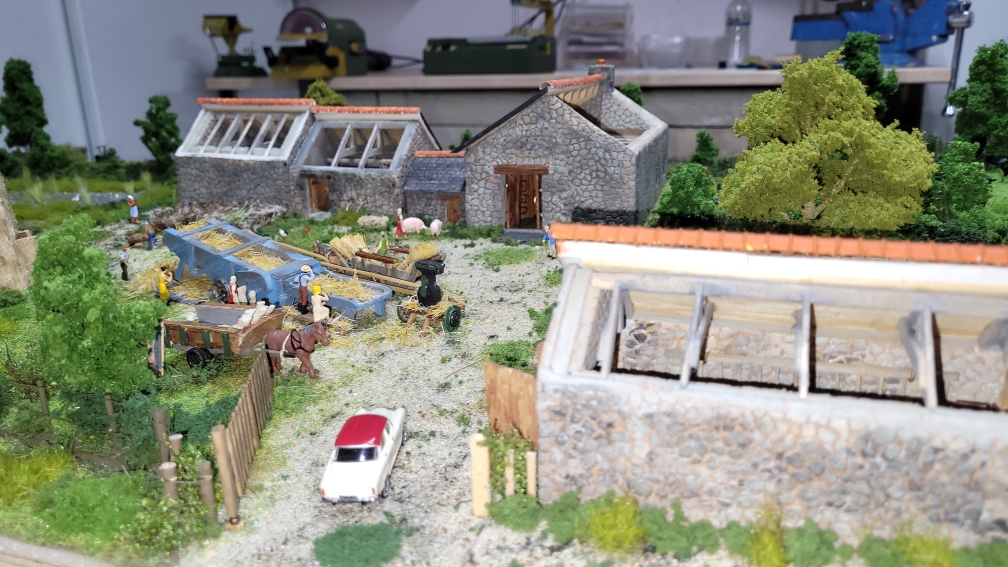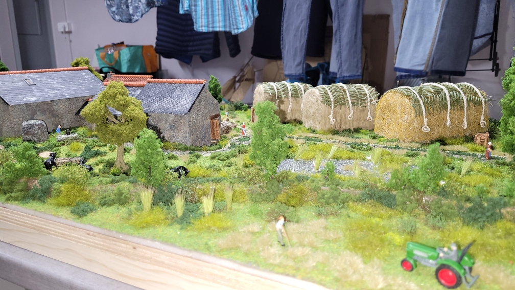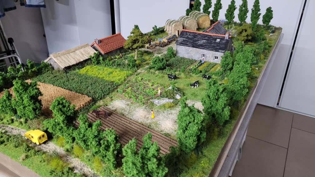 Depuis 4 ans, confectionnant des maquettes de bateaux sur le patrimoine côtier (coquillier rade, Thonier, Recouvrance, Hermione, Bisquine, etc.), j’ai décidé de rendre hommage à mes grands-parents avec la construction de leur lieu de vie. Cet ensemble est construit au plus près de la réalité des années 30 à 60. Monsieur TALARMIN maire et Monsieur GUERMEUR m’ont autorisé à photographier des extraits de cadastre. La base sera ces extraits cadastraux de 1870 conjuguée au regroupement de tous mes souvenirs d’enfance. Les dimensions des bâtiments ont été calculées par rapport à la longueur d’un lit clos. La dimension intérieure d’un bâtiment trouvée, le calcul par rapport au cadastre devenait simple. Mon objectif : donner une vie à l’intérieur des bâtiments afin de découvrir le quotidien des cultivateurs de cette époque. L’échelle retenue sera au 1/65 (plus favorable à la recherche pour les personnages). Dans cette réalisation, deux modules de 80 cm sur 60 cm s’encastrent. Tous les bâtiments construits sont conformes à la réalité des années 1900 à 1970. Avec leur vie de petits cultivateurs, mes grands-parents non propriétaires ne pouvaient pas évoluer. C’est pourquoi, cette maquette a la particularité de montrer au-delà du périmètre de la ferme, le début de la modernité en marche dans les fermes environnantes (tracteur, voiture, etc.). En 1974, coup d’arrêt, la plupart des bâtiments ont été détruits par le fermier acheteur. Seule la grange aux tuiles rouges a été gardée et rehaussée… Aujourd’hui, elle est utilisée en maison d’habitation. Une partie du