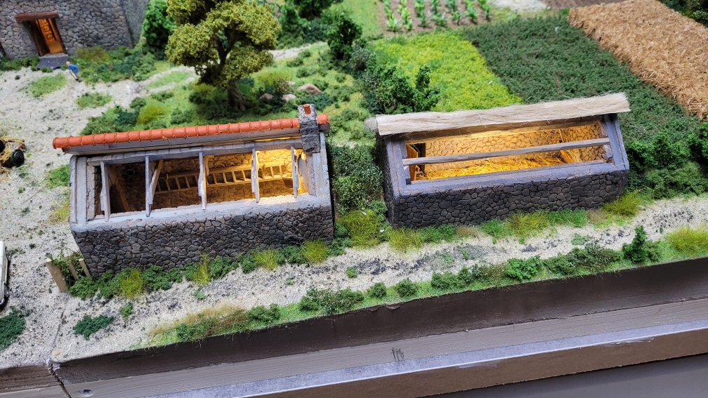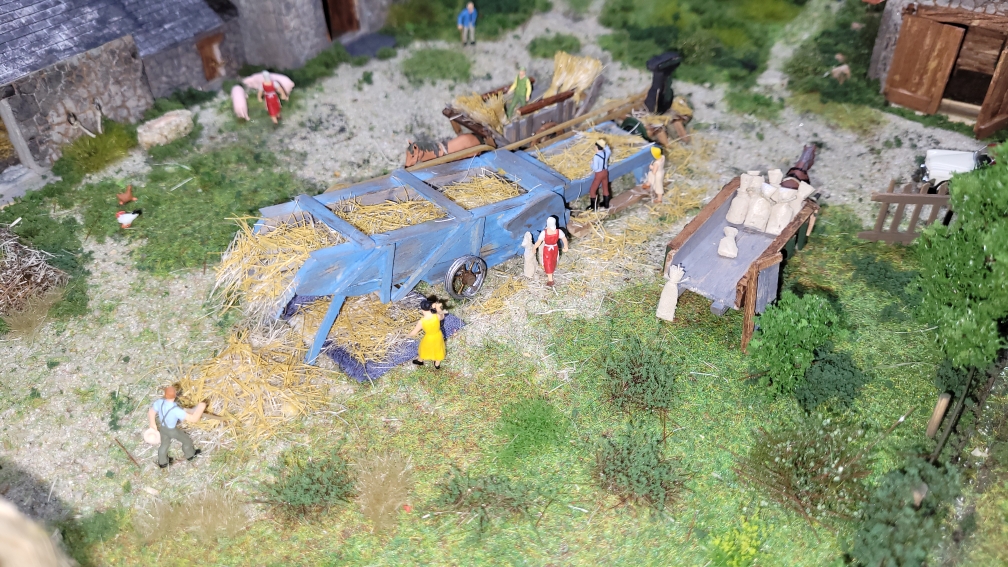 Cour de la ferme La scène de la moisson est représentée avec batteuse, moteur thermique, meule de paille, de foin. D’autres scènes comme la traite du soir, le ramassage du foin, le puisage de l’eau, etc… La partie arrière de la cour était toujours humide…