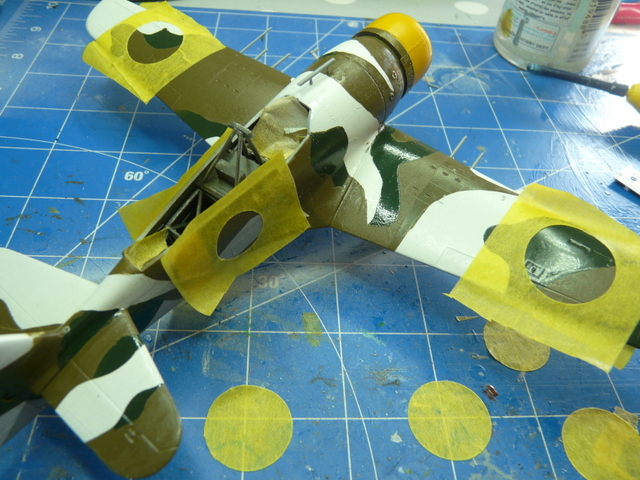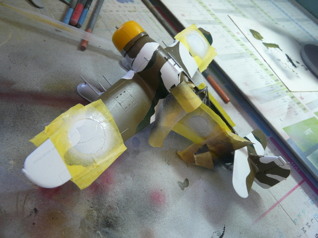 Apprêtage de tout l’avion en blanc mat à l’aéro. Reprise de quelques joints au mastic puis couche de blanc. J’ai choisi la version où il y a une silhouette de chasseur tout blanc qui courre. Pour me rapprocher au plus près de la planche couleur, j’ai pris un gris GUNZE 61, puis pour le dessus, un vert olive drab 80 et un vert 59. Comme l’avion était déjà blanc, j’ai forcé en épaisseur sur les parties à peindre en blanc. Sans oublier le jaune 413. La peinture, pour moi, est un réel plaisir, tout à l’aérographe. Il y aura une succession de masquage, ( c’est très long). Puis au déballage final, le résultat est là. Quelques retouches au pinceau par-ci et par-là.