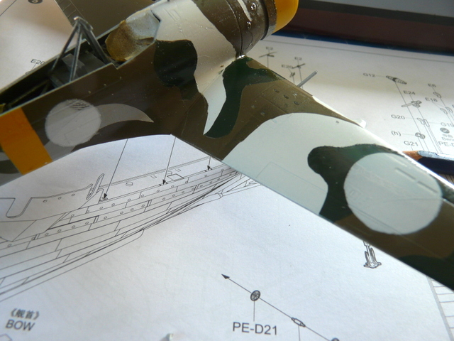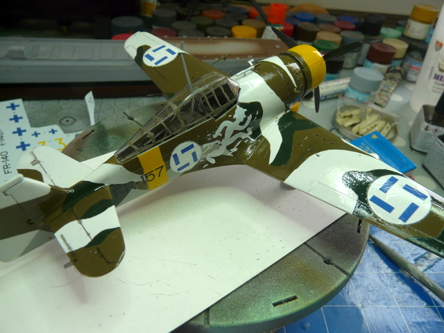 Vernis intégral de l’avion en brillant. Une bonne journée de séchage. Utilisation des produits assouplissants GUNZE et pose des décalques. Ils sont extrêmement fins. Tout va bien en place. Des difficultés tout de même pour le chasseur, grande surface ultra fine. Après une lutte acharnée, j’ai sauvé le coup. Séchage une nuit, puis vernis intégral en mat.