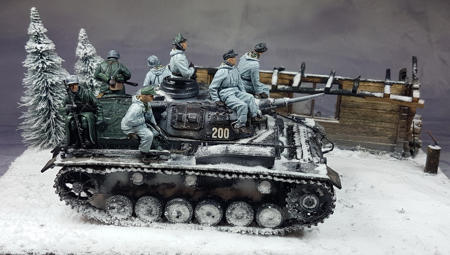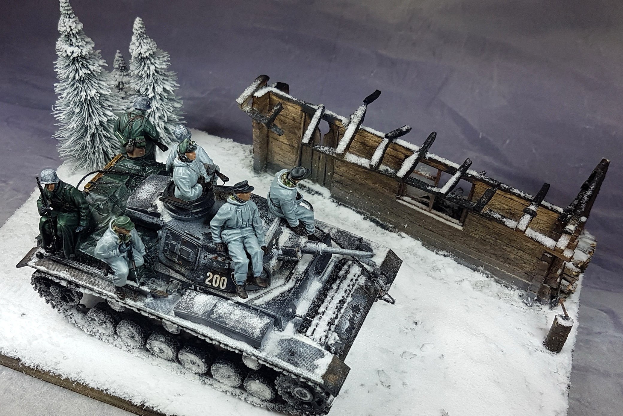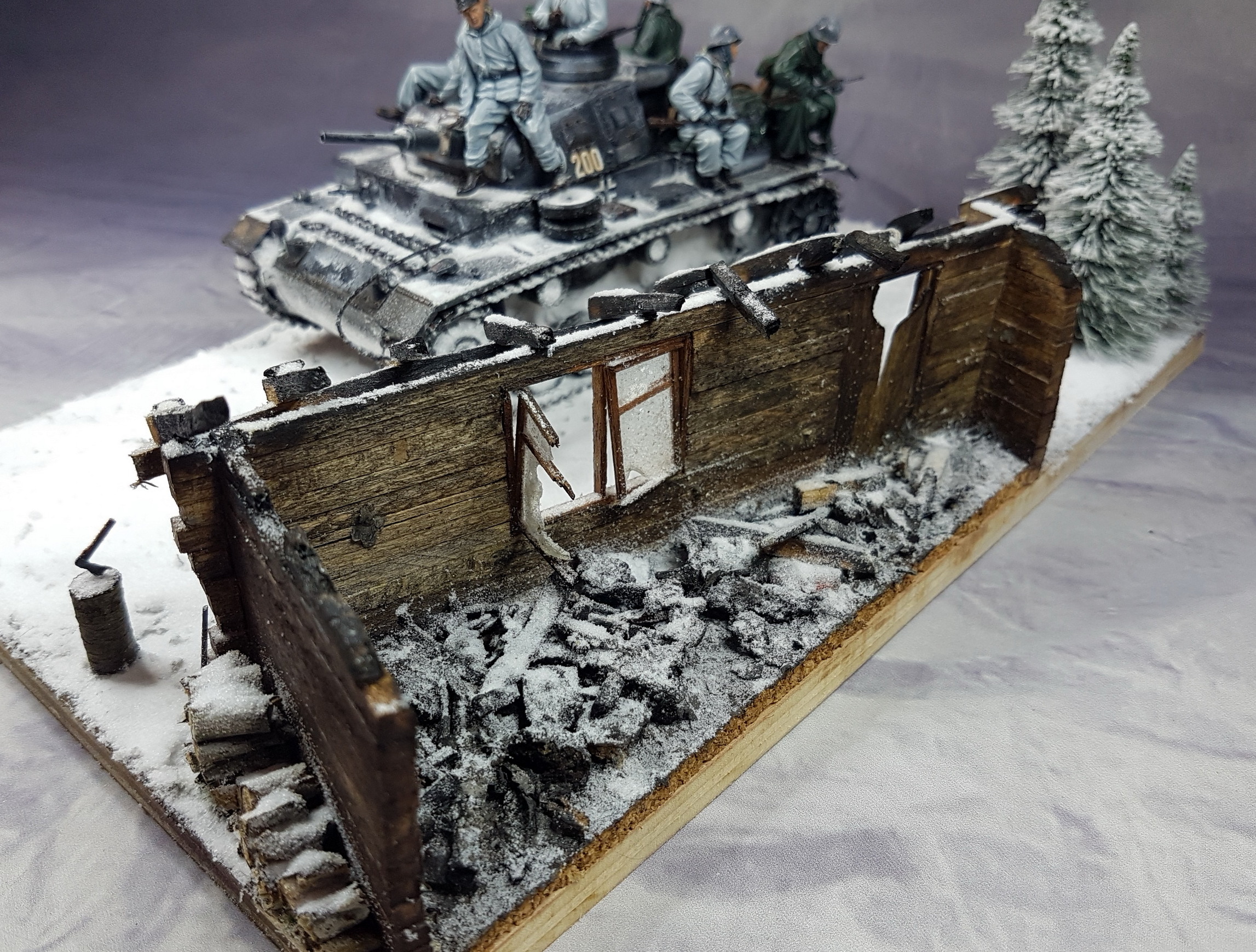 Front le l’est, hiver 1941/42. Un panzer III ausf-J et son équipage de la 18 ème panzer division avance sur le sol russe à la recherche d’un abri pour la nuit. Ils passent devant une Hisba abandonnée, brûlée par ses occupants suite à l’ordre donne cette été par Staline, de pratiquer « la terre brûlée » le panzer III est un modèle de la marque dragon. Il a été monté directement en sortie de boîte, sans kit de détaillage inutile pour ce modèle. La base de la peinture à été faite à l’aérographe, et le camouflage hiver à été réalisé à l’aide d’une technique eau chaude/laque.