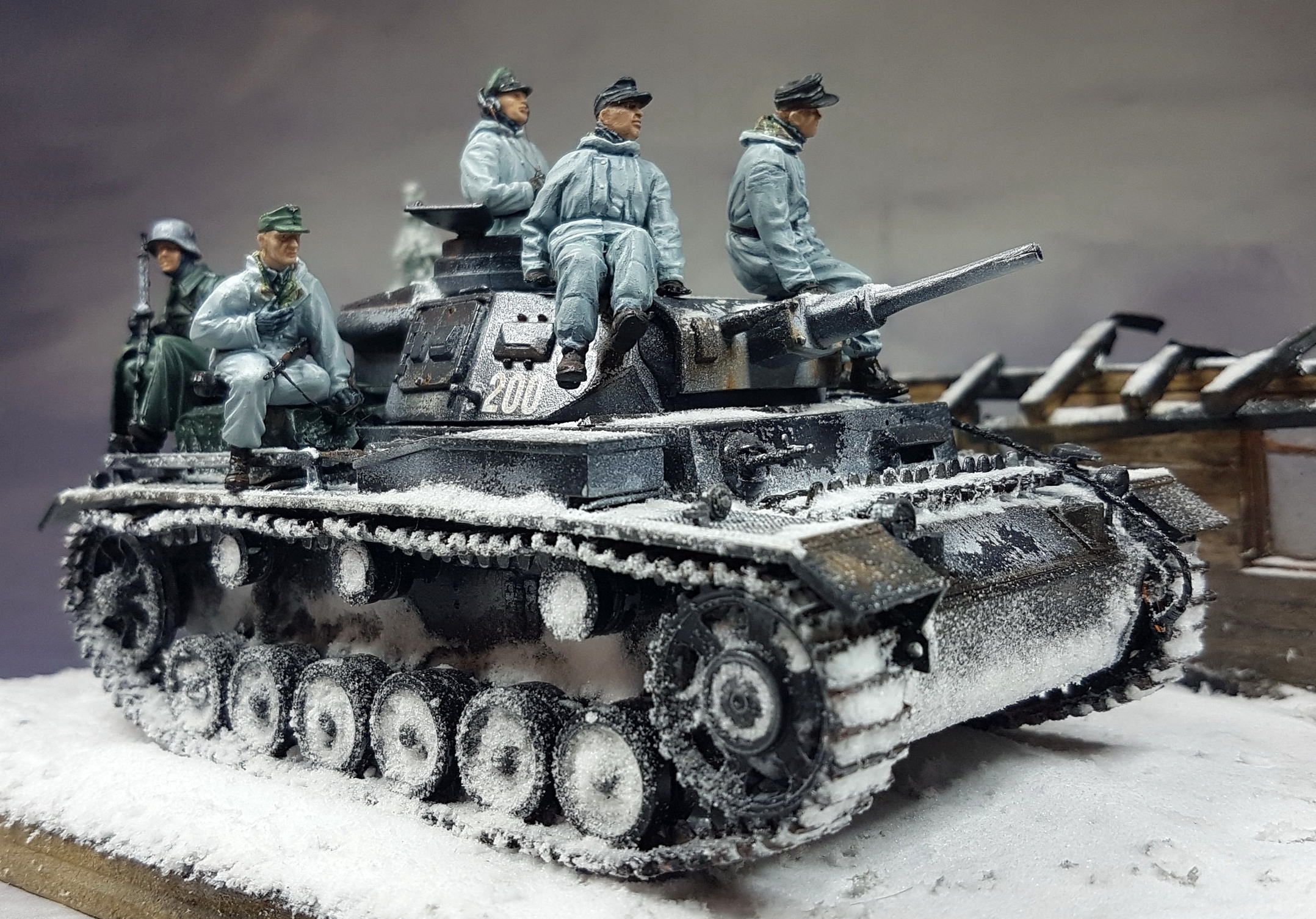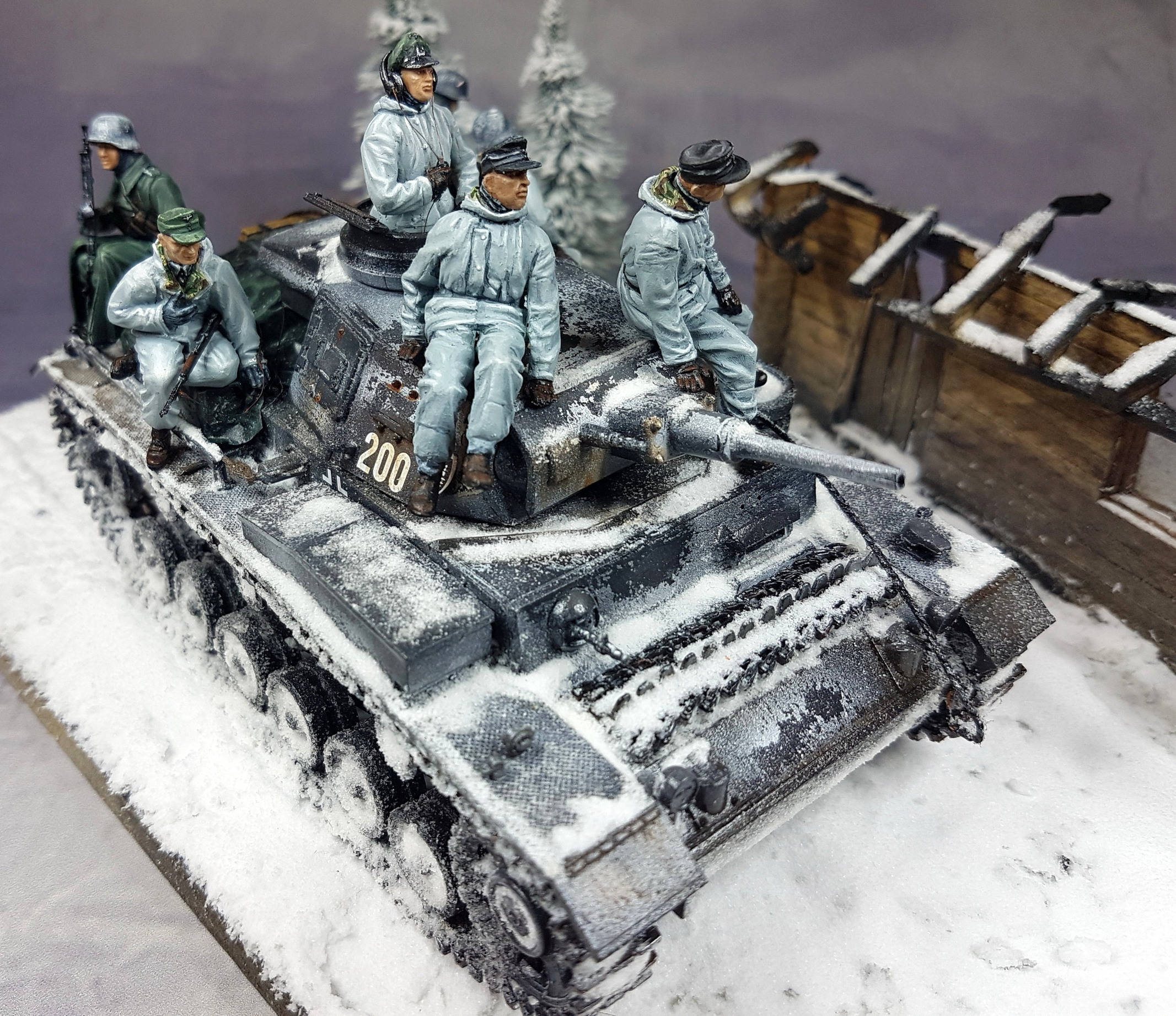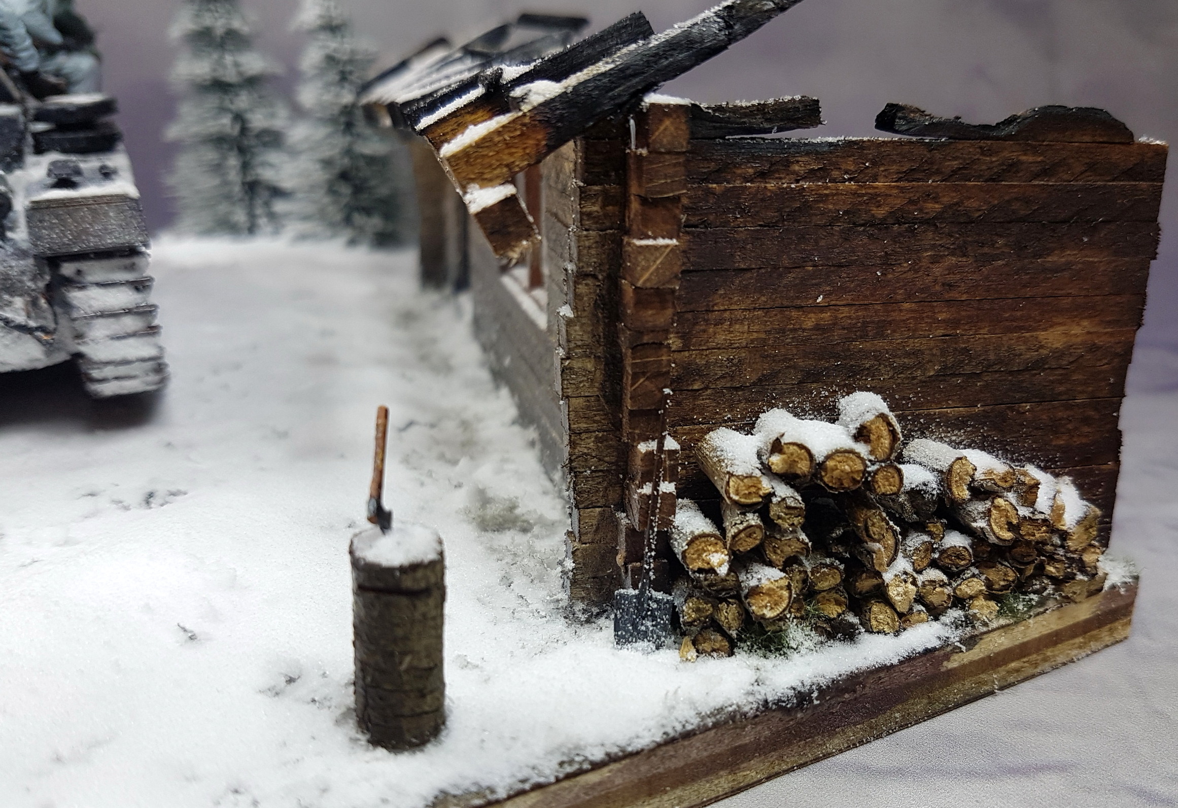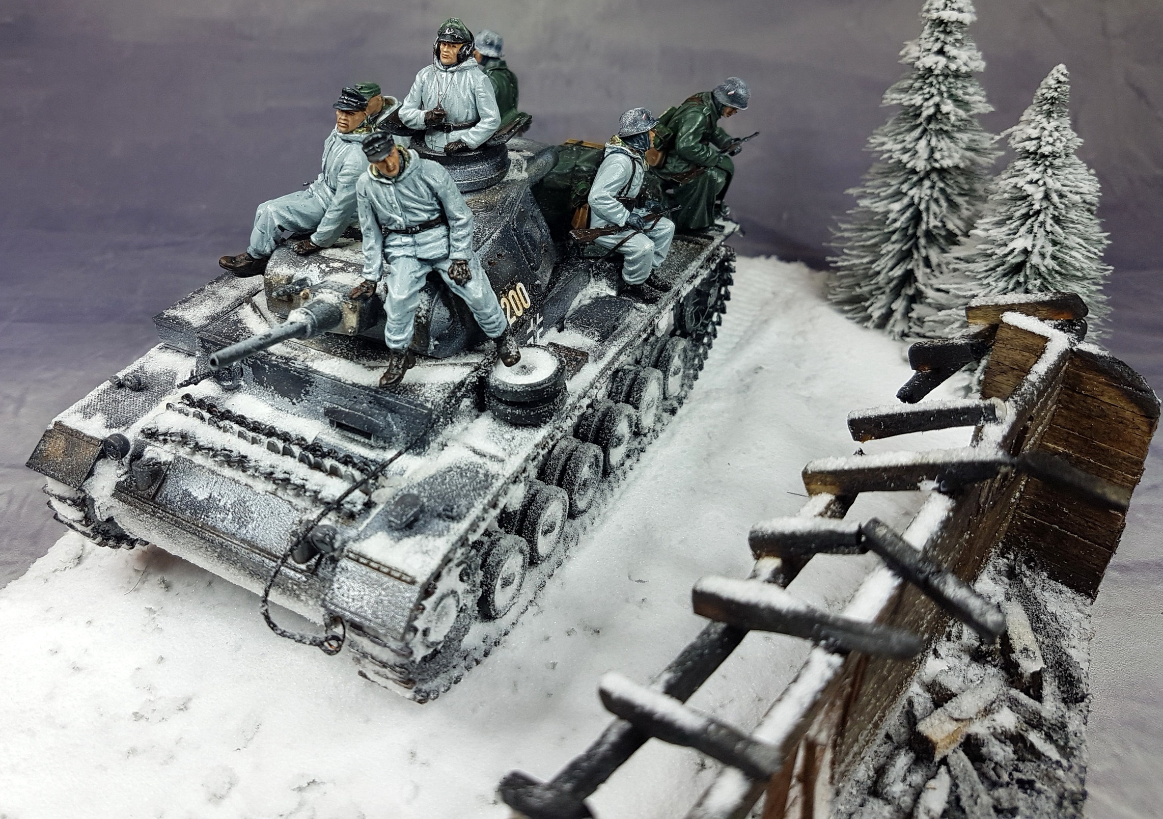 Front le l’est, hiver 1941/42. Un panzer III ausf-J et son équipage de la 18 ème panzer division avance sur le sol russe à la recherche d’un abri pour la nuit. Ils passent devant une Hisba abandonnée, brûlée par ses occupants suite à l’ordre donne cette été par Staline, de pratiquer « la terre brûlée » le panzer III est un modèle de la marque dragon. Il a été monté directement en sortie de boîte, sans kit de détaillage inutile pour ce modèle. La base de la peinture à été faite à l’aérographe, et le camouflage hiver à été réalisé à l’aide d’une technique eau chaude/laque.
