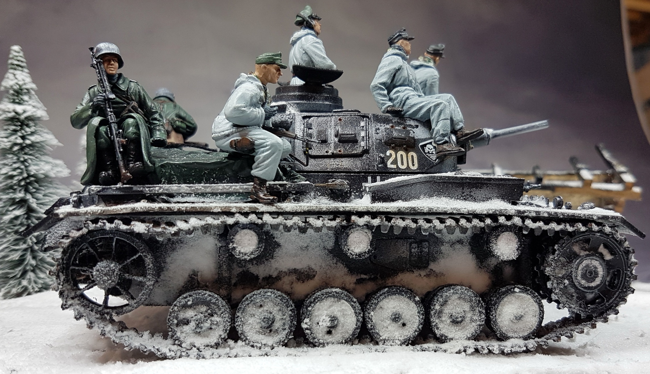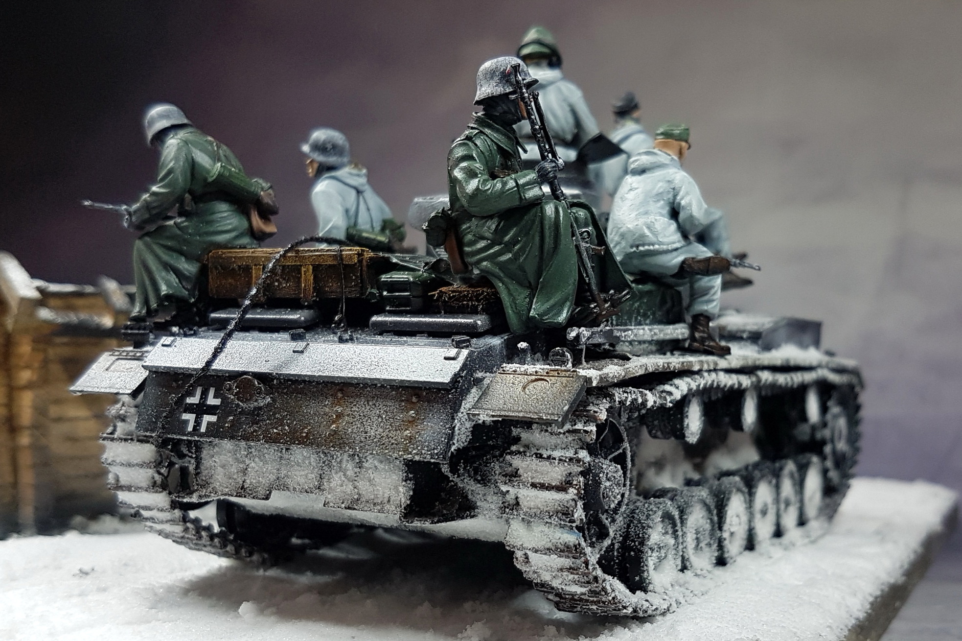 Les tankistes sont de la marque Miniart et les panzergrenadier de chez dragon. Peinture acrylique réalisée au pinceau. |