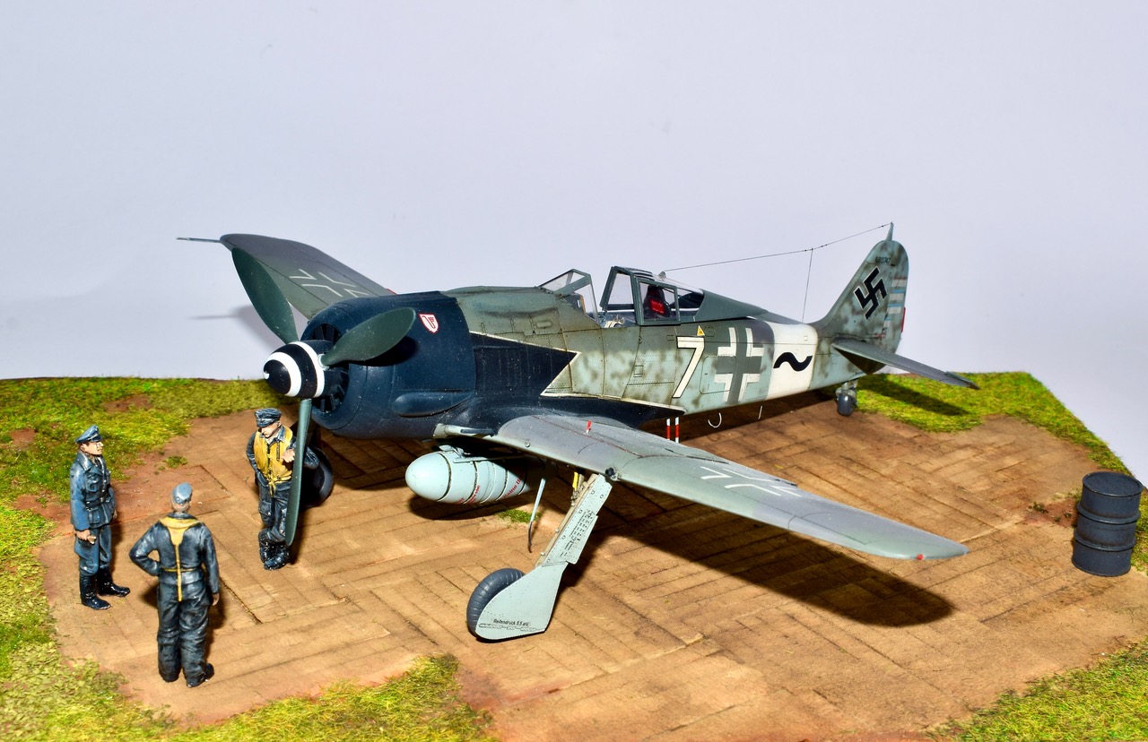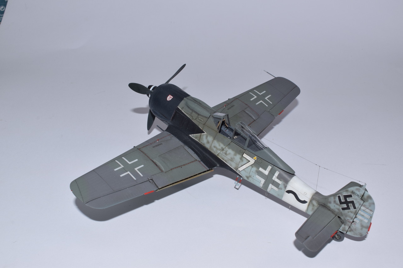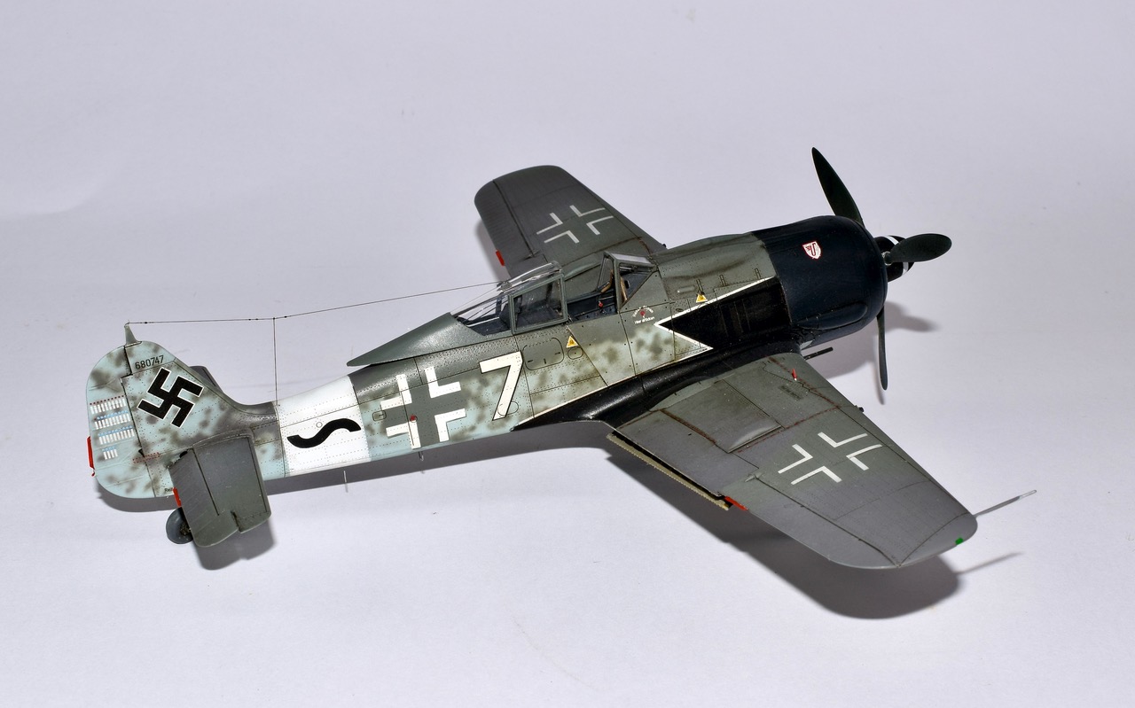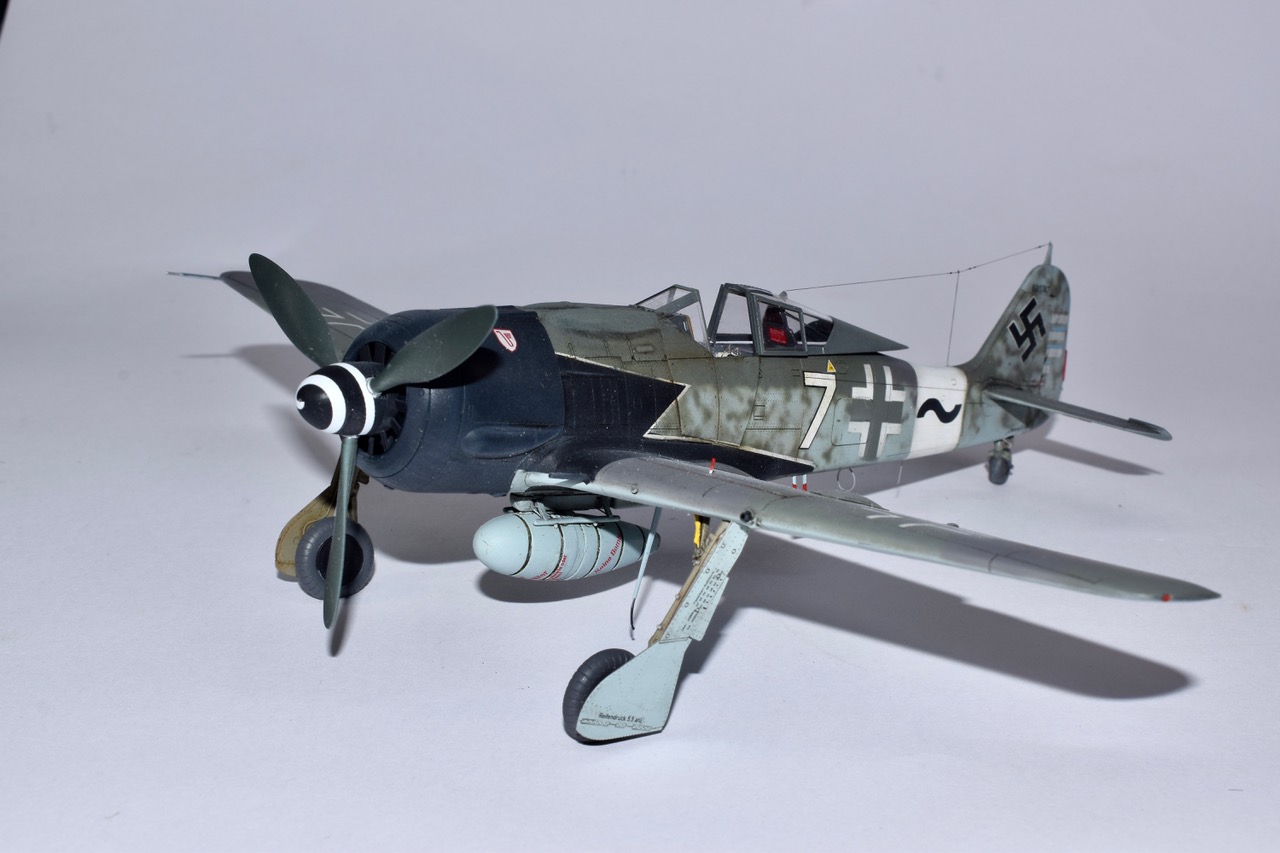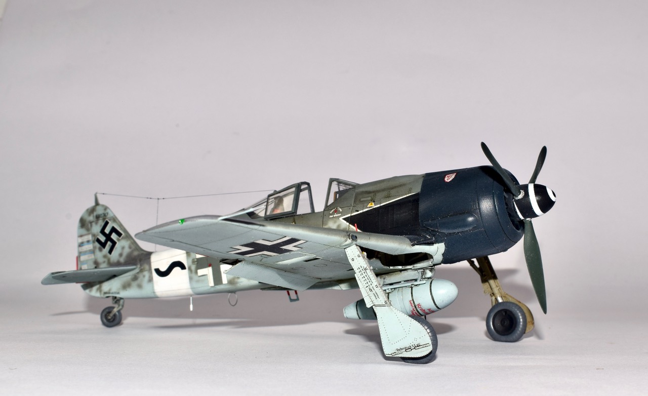 L’histoire de cet avion mythique est un peu indissociable des groupes d’assauts de la Luftwaffe déstinés à casser les boxes de B-24 et de B-17 qui bombardaient l’Allemagne tous les jours. Cette version du 190, surnommée « Sturmbock » (Bouc d’assaut) était lourdement armée et blindée. Les succés furent immédiats mais les pertes aussi, et les Groupes d’assaut firent régner la terreur jusqu’à l’apparition de la chasse d’escorte US. Parmi les unités équipées du « Sturmbock », la 10/JG3 commandée par l’Oblt Hans Weik, crédité de 20 quadrimoteurs! Ce dernier survécut à la Guerre, fit des études d’Architecture tout en se passionnant pour le modélisme naval! La déco se trouve dans la boite Eduard mais j’ai préféré utiliser des pochoirs chaque fois que c’était possible. La maquette est un vrai plaisir à monter, je n’ai rajouter que les volets mais la chirurgie nécessaire n’est pas des plus simple. En attendant bon confinement et soyez forts!