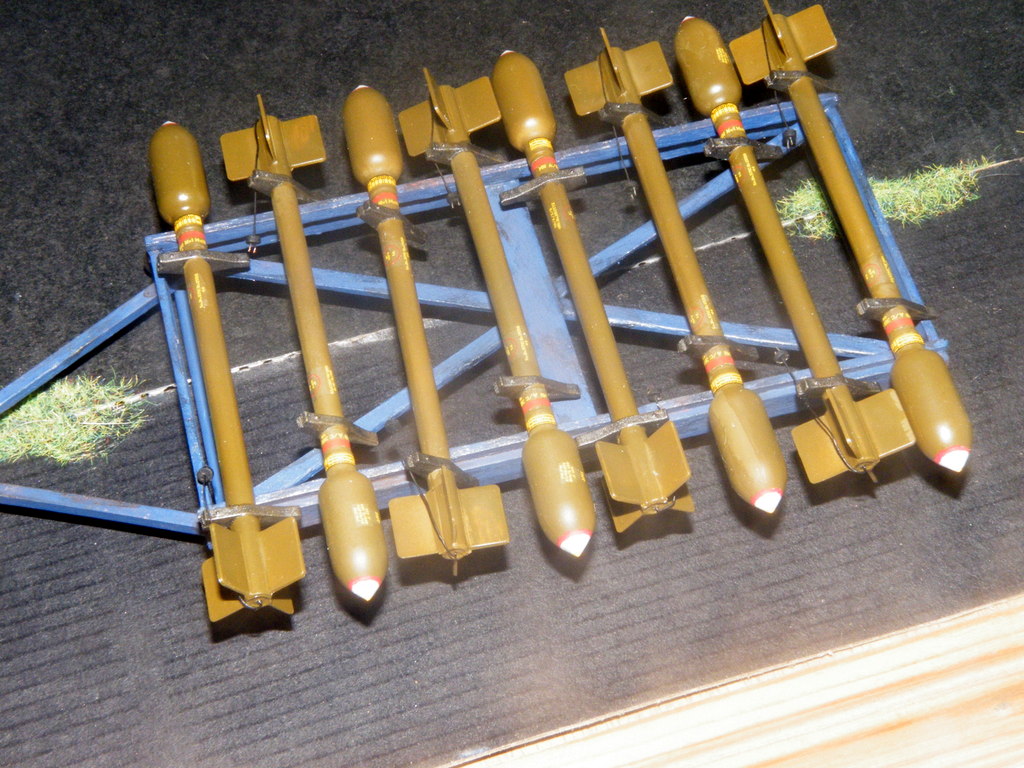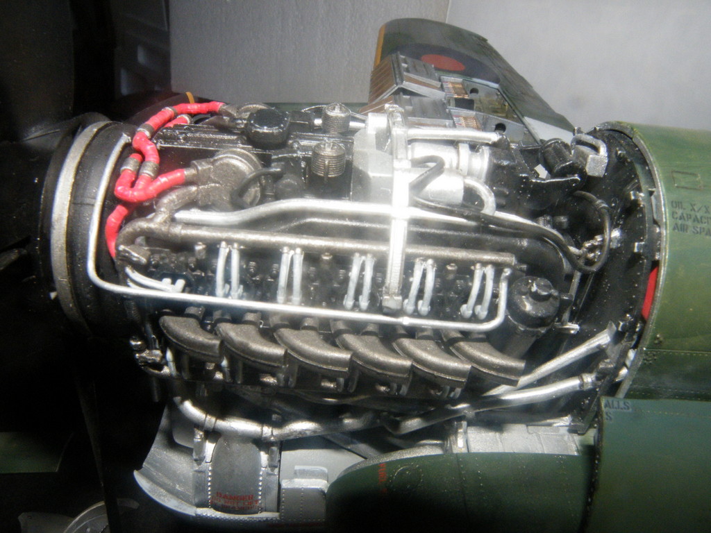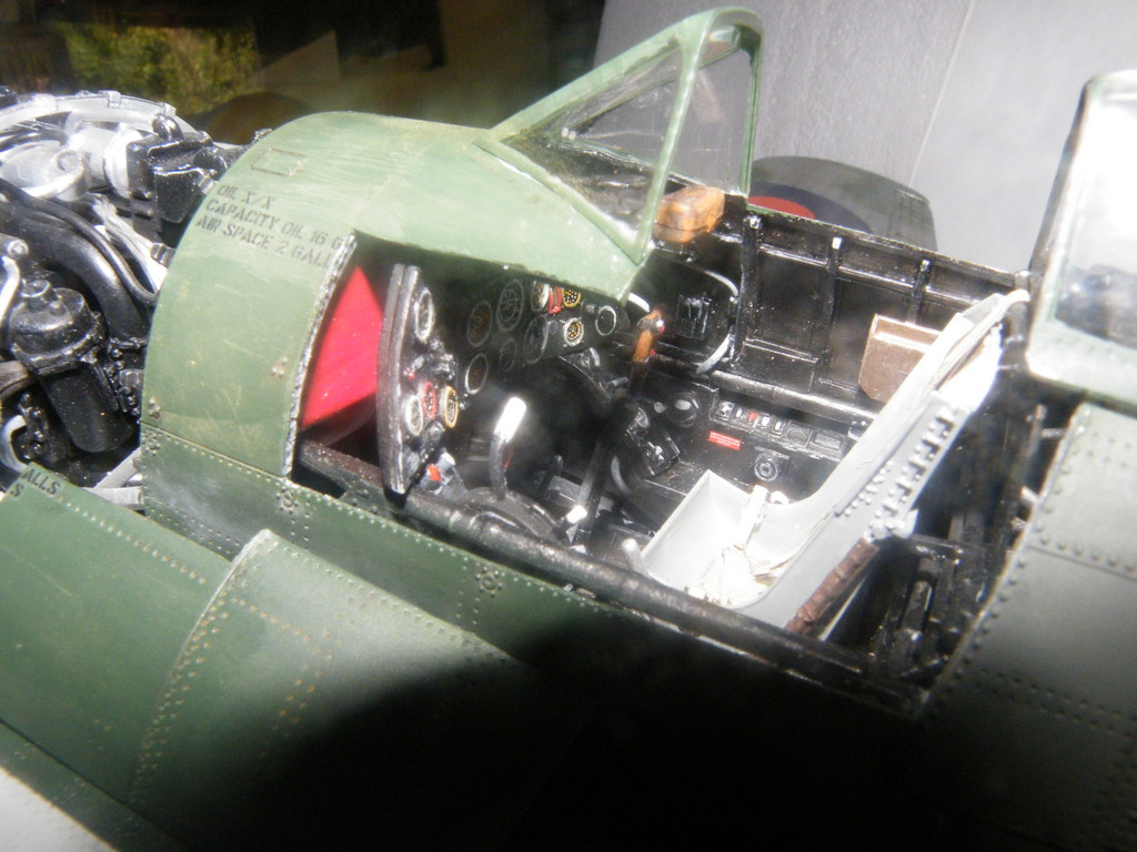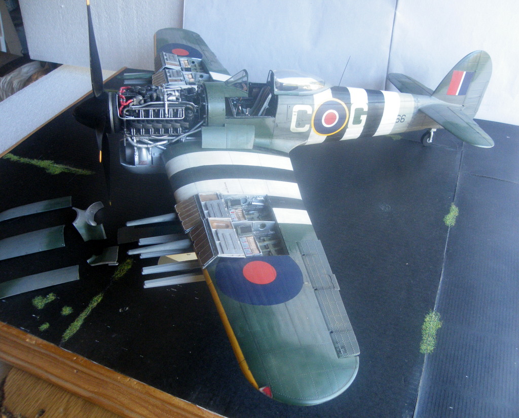 La boîte est prévue pour 3 possibilités : le moteur entièrement décapoté et les baies d’armement ouvertes , seulement le dessus du moteur et les baies d’armement, ou tout fermé. Dans l’option 2 , une partie des pièces moteur ne doivent pas être montées tout comme dans l’option 3. J’ai dû trouvé que c’était trop simple alors j’ai opté pour une 4ème option en ouvrant certains panneaux et en en fermant d’autres. Forcément, par la suite, certains joints n’étaient plus au top et il a fallu en reprendre certains, vu que dans cette configuration certaines pièces moteur n’auraient pas dû être montées, mais je voulais monter le maximum des 80 pièces que compte le moteur, c’est dommage de ne pas monter une aussi belle bête, tout comme renfermer complètement le cockpit qui en compte presque autant. Mais si l’on s’en tient au montage initial, tout s’ajuste parfaitement. L’armement est composé de bombes de 500 ou 1000 livres, plus deux modèles de rockets dont un doit être prévu pour l’autre version du Typhoon. Vu la configuration de l’appareil, je ne les ai pas mis en place mais j’ai décidé de fabriquer des chariots de transport en scratch pour ne pas les poser au sol et j’ai rajouté les fils d’allumage avec leurs broches sur les rockets. Quatre possibilités de décoration sur cette maquette et j’ai choisi celle d’un appareil pendant le débarquement en Normandie. Avion piloté par le Wing Commander Charles Green ; Win 121 ; B5 Le Fresne- Camilly , France , Juin 1944. Voilà , certains y trouveront peut être des défauts ou je ne sais quoi, mais moi il me plait bien et j’ai pris beaucoup de plaisir à monter cet oiseau . The box is designed for 3 possibilities: fully open engine and open armament bays, only the top of the engine and the armament bays, or all closed. In option 2, some of the engine parts do not need to be mounted just like in option 3. I must have found that it was too simple so I opted for a 4th option by opening certain panels and closing others. Inevitably, afterwards, some joints were no longer on the top and we had to take some of them back, since in this configuration certain engine parts should not have been fitted, but I wanted to fit the maximum of the 80 parts that the engine has, it’s a shame not to ride such a beautiful beast, just like completely enclosing the cockpit which counts almost as much. But if we stick to the initial assembly, everything fits perfectly. The armament is composed of 500 or 1000-pound bombs, plus two models of rockets, one of which must be planned for the other version of the Typhoon. Given the configuration of the device, I did not put them in place but I decided to make transport trolleys from scratch to avoid placing them on the ground and I added the ignition wires with their pins on the rockets. Four possibilities for decoration on this model and I chose that of a device during the landing in Normandy. Aircraft flown by Wing Commander Charles Green; Win 121; B5 Le Fresne-Camilly, France, June 1944. There you go, some might find flaws in it or something, but I like it and I had a lot of fun riding this bird.