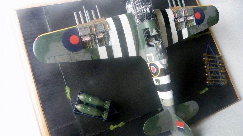 La boîte est prévue pour 3 possibilités : le moteur entièrement décapoté et les baies d’armement ouvertes , seulement le dessus du moteur et les baies d’armement, ou tout fermé. Dans l’option 2 , une partie des pièces moteur ne doivent pas être montées tout comme dans l’option 3. J’ai dû trouvé que c’était trop simple alors j’ai opté pour une 4ème option en ouvrant certains panneaux et en en fermant d’autres. Forcément, par la suite, certains joints n’étaient plus au top et il a fallu en reprendre certains, vu que dans cette configuration certaines pièces moteur n’auraient pas dû être montées, mais je voulais monter le maximum des 80 pièces que compte le moteur, c’est dommage de ne pas monter une aussi belle bête, tout comme renfermer complètement le cockpit qui en compte presque autant. Mais si l’on s’en tient au montage initial, tout s’ajuste parfaitement. L’armement est composé de bombes de 500 ou 1000 livres, plus deux modèles de rockets dont un doit être prévu pour l’autre version du Typhoon. Vu la configuration de l’appareil, je ne les ai pas mis en place mais j’ai décidé de fabriquer des chariots de transport en scratch pour ne pas les poser au sol et j’ai rajouté les fils d’allumage avec leurs broches sur les rockets. Quatre possibilités de décoration sur cette maquette et j’ai choisi celle d’un appareil pendant le débarquement en Normandie. Avion piloté par le Wing Commander Charles Green ; Win 121 ; B5 Le Fresne- Camilly , France , Juin 1944. Voilà , certains y trouveront peut être des défauts ou je ne sais quoi, mais moi il me plait bien et j’ai pris beaucoup de plaisir à monter cet oiseau . The box is designed for 3 possibilities: fully open engine and open armament bays, only the top of the engine and the armament bays, or all closed. In option 2, some of the engine parts do not need to be mounted just like in option 3. I must have found that it was too simple so I opted for a 4th option by opening certain panels and closing others. Inevitably, afterwards, some joints were no longer on the top and we had to take some of them back, since in this configuration certain engine parts should not have been fitted, but I wanted to fit the maximum of the 80 parts that the engine has, it’s a shame not to ride such a beautiful beast, just like completely enclosing the cockpit which counts almost as much. But if we stick to the initial assembly, everything fits perfectly. The armament is composed of 500 or 1000-pound bombs, plus two models of rockets, one of which must be planned for the other version of the Typhoon. Given the configuration of the device, I did not put them in place but I decided to make transport trolleys from scratch to avoid placing them on the ground and I added the ignition wires with their pins on the rockets. Four possibilities for decoration on this model and I chose that of a device during the landing in Normandy. Aircraft flown by Wing Commander Charles Green; Win 121; B5 Le Fresne-Camilly, France, June 1944. There you go, some might find flaws in it or something, but I like it and I had a lot of fun riding this bird.